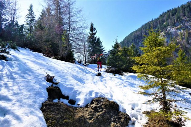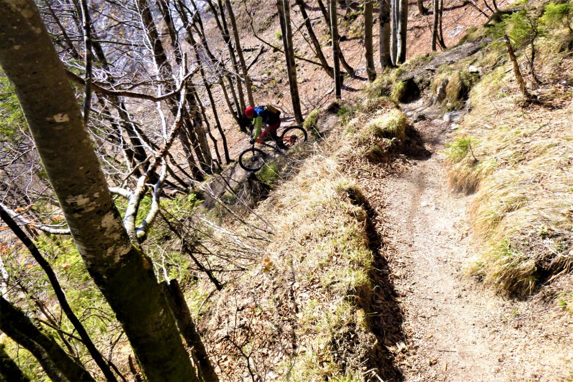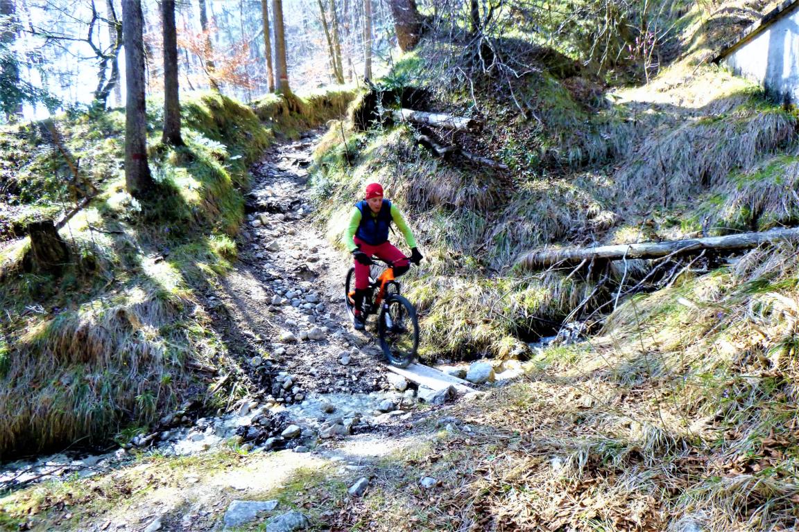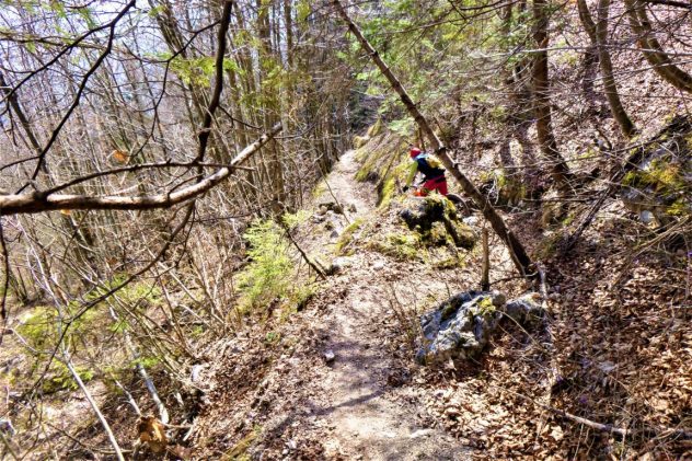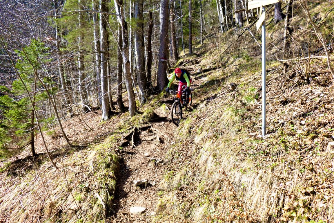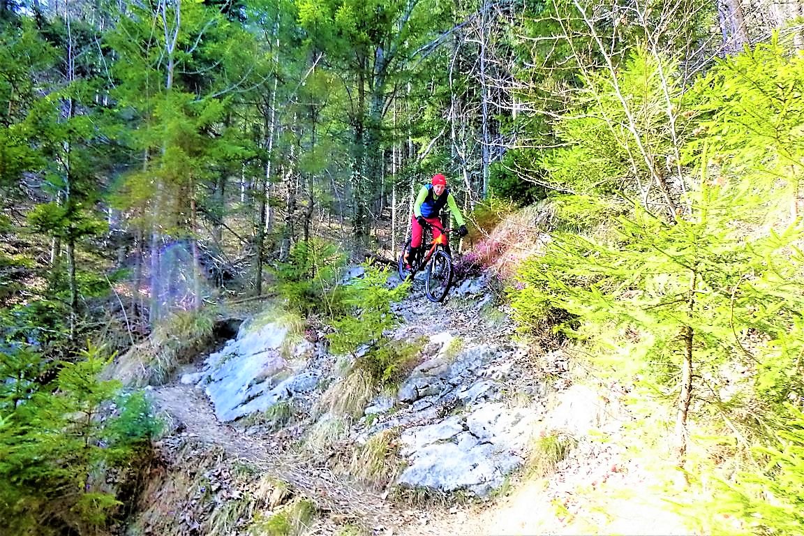 Direkt vom Gipfel führt der Trail auf losem Untergrund über hohe bis sehr hohe Stufen und über viele Spitzkehren hinunter. Die meisten Kehren sind zum Versetzten. Der Trail ist im oberen Teil recht anspruchsvoll. Den Schwierigkeitsgrad S3 sollte man beherrschen. Ein Steinschlag hat ca. 150 Hm der Abfahrt im oberen Teil zerstört. Weiter führt der Trail über viele wurzelige Stellen im Schwierigkeitsgrad S2 über die Bärenbadalm zurück nach Niederbreitenbach.