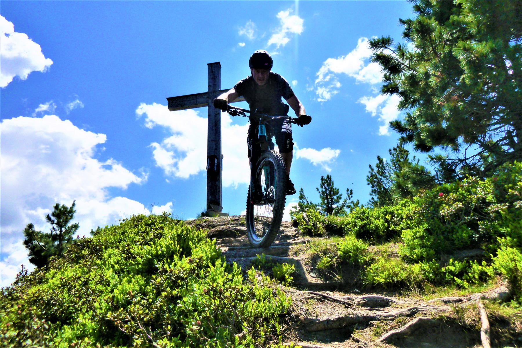 Abfahrt vom Kreuz im Schwierigkeitsgrad S2/G1 mit mehreren schwierigen S3/G2 Stellen und einer S5/G3 Stufenpassage hinunter zum Höhenweg. Von dort weiter über den sehr flowigen 22-Trail im Schwierigkeitsgrad S2 auf festem Untergrund mit einigen Spitzkehren und kleineren Wurzelstufen hinunter nach Hausstatt.