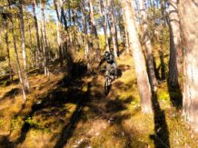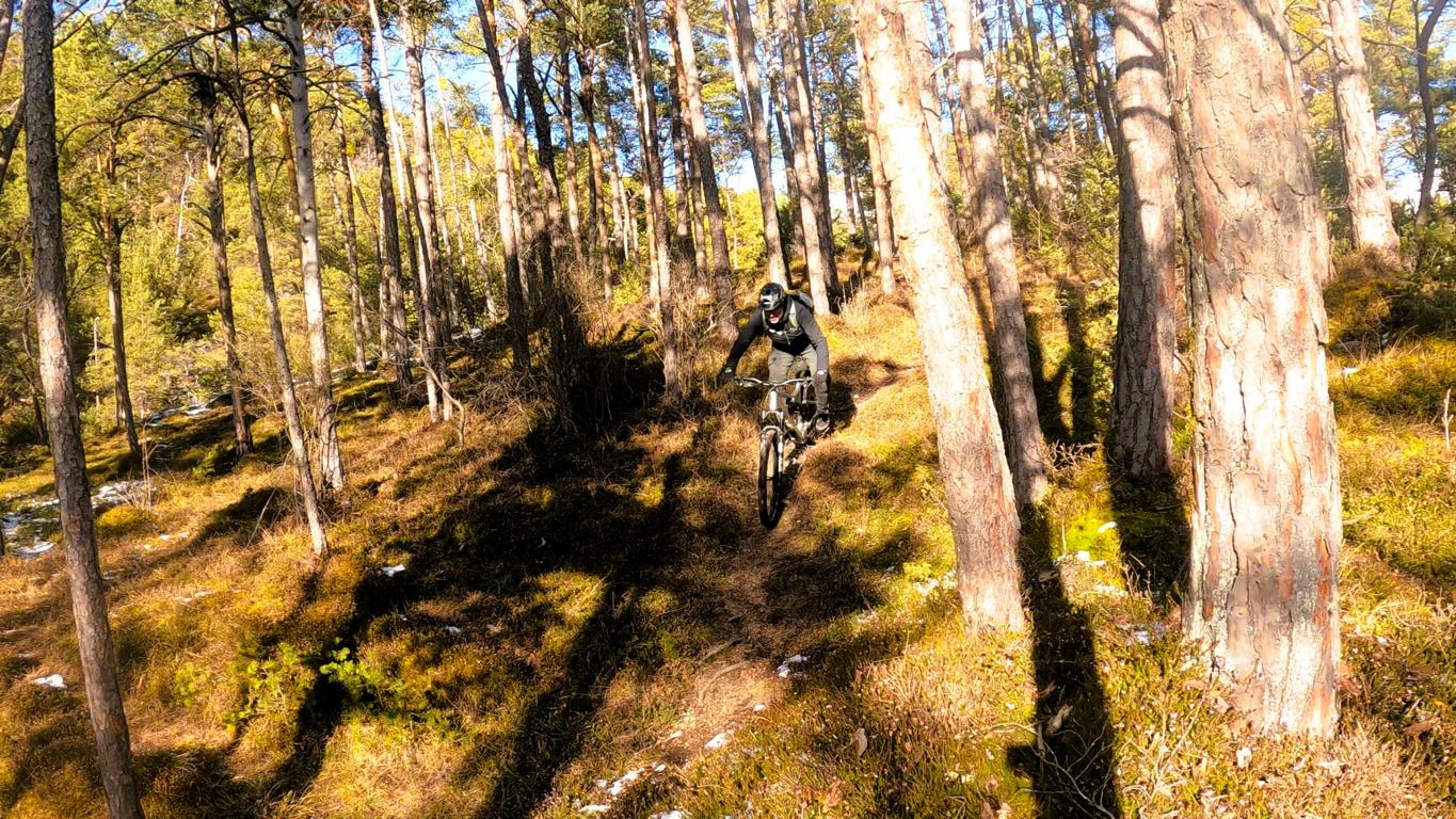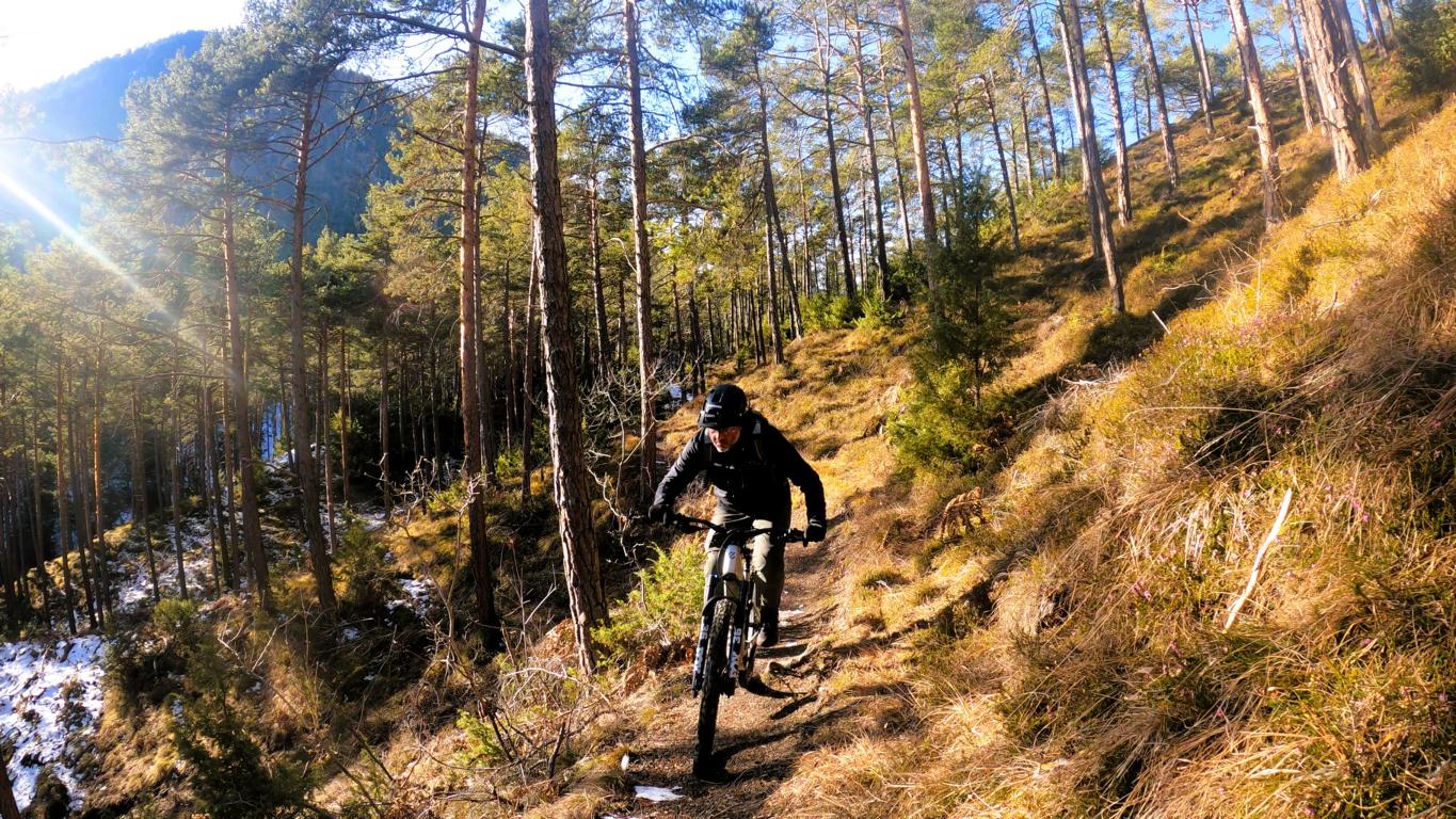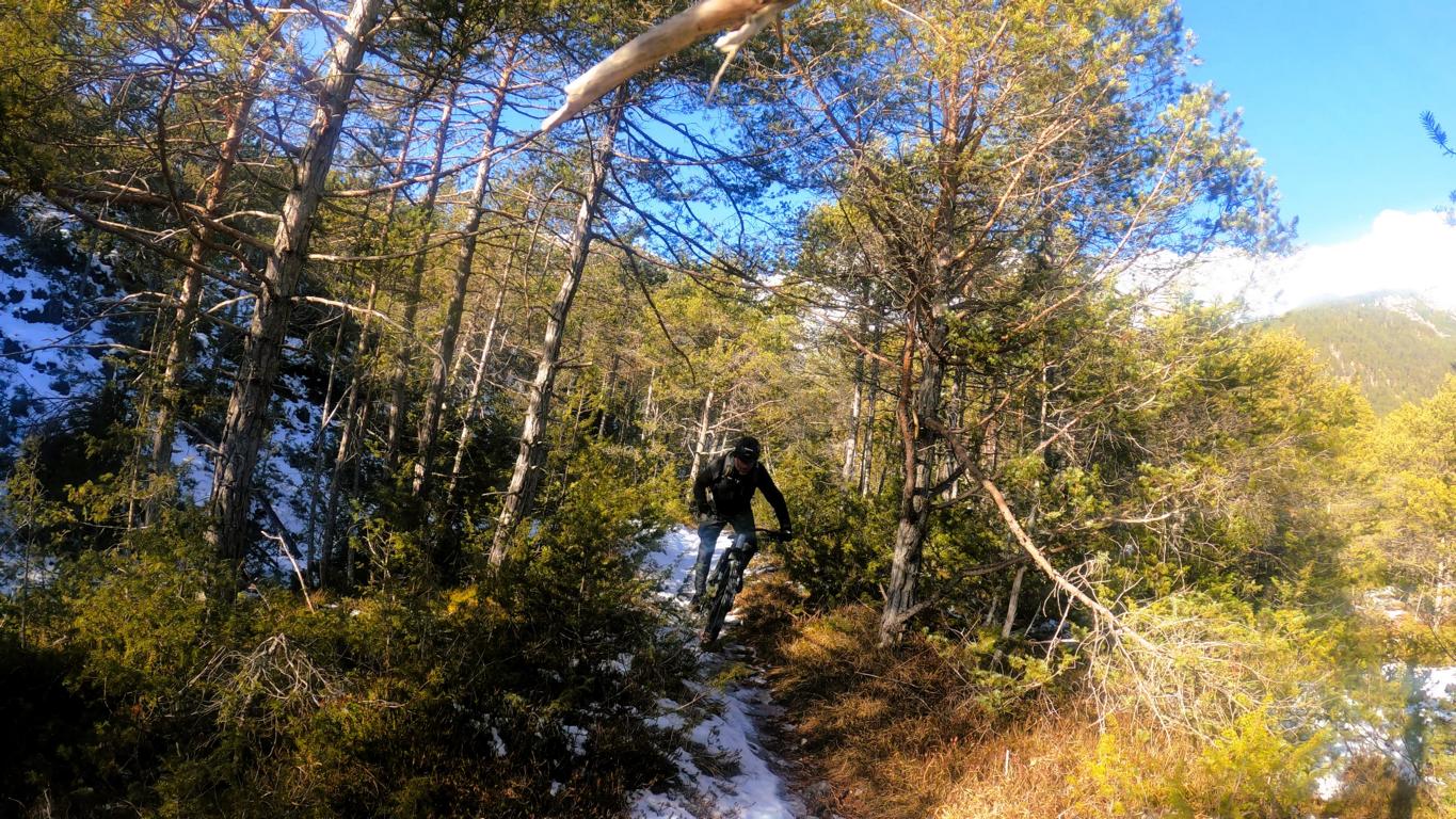 Der Trail führt in Richtung Mieming durch einen naturbelassenen Wald mit schottrigem und teilweise wurzeligem Boden, der bei Schnee überraschend guten Grip bietet. Der Schwierigkeitsgrad liegt überwiegend bei S1, mit kurzen, gut kontrollierbaren S2-Passagen. Gerade im Winter sorgen diese Abschnitte für Abwechslung, ohne zu überfordern.