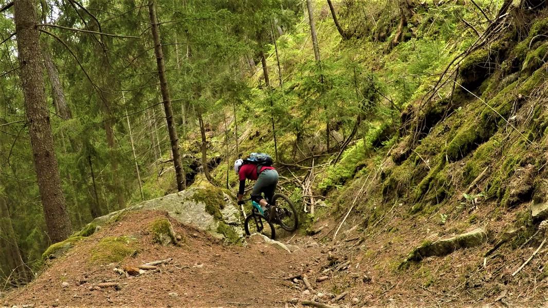 Der Trail führt von Hochrohnen zum Teil über nicht verfestigten, grobsteinigem Untergrund im Schwierigkeitsgrad S2 mit ein paar S3 Stellen zum Alpenblick. Von dort weiter im Schwierigkeitsgrad S2 auf festem Untergrund mit einigen leichten Spitzkehren, kleineren Wurzel- und Felsstufen hinunter nach Silz.