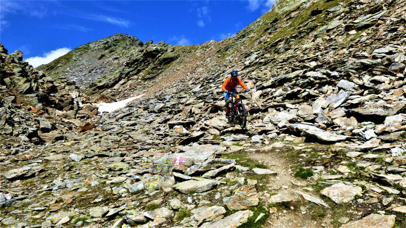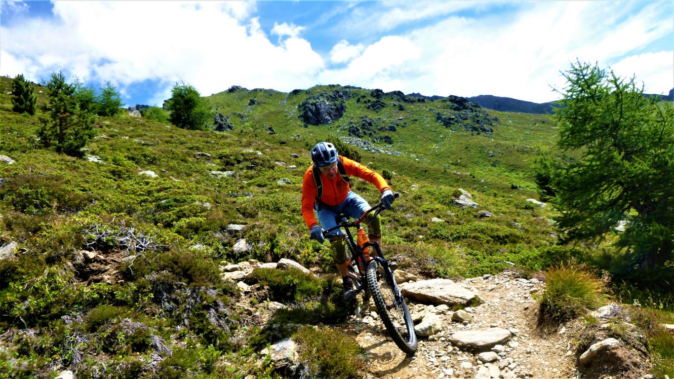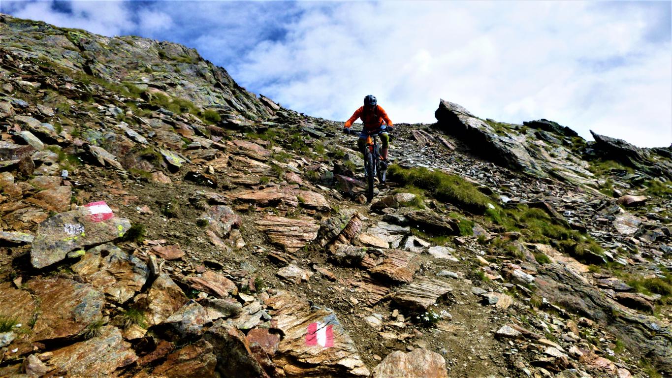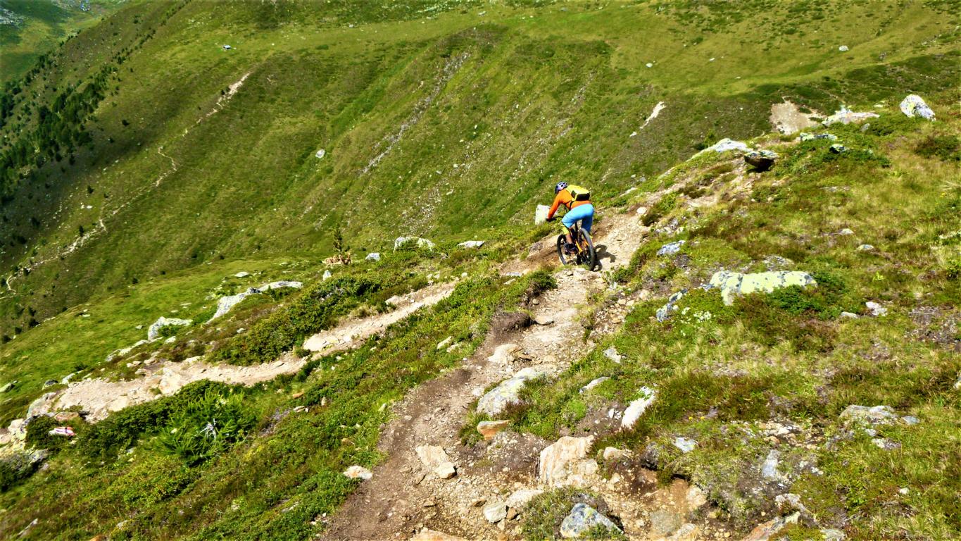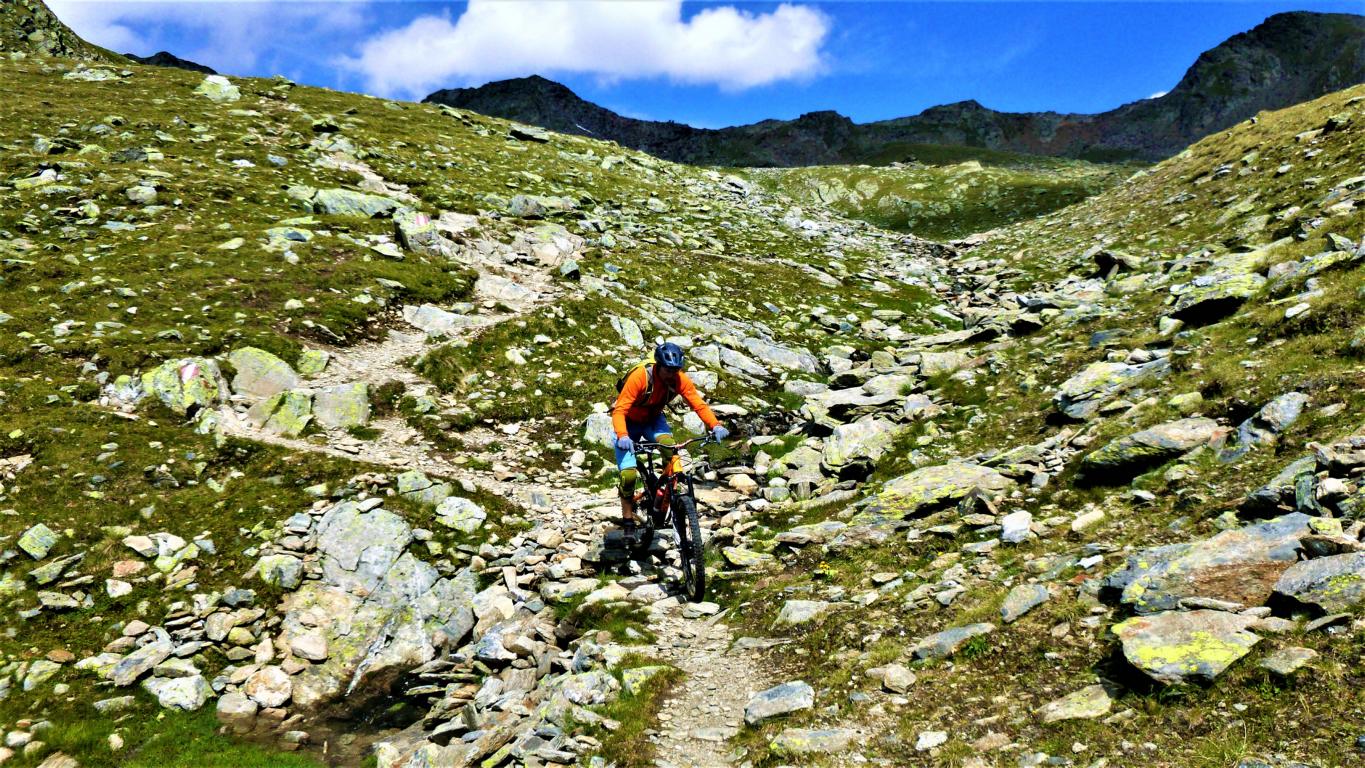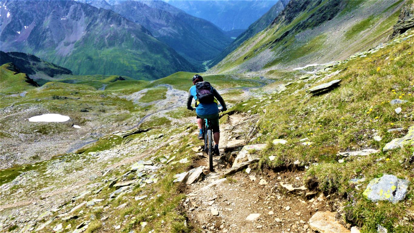 Von der Scharte führt der 146-Trail durchgehend auf grobsteinigen und verblockten Untergrund abwechselnd im Schwierigkeitsgrad S2-S3/G1 das “Weite Kar” hinaus bis es steiler wird. Von dort weiter zum größten Teil auf nicht verfestigtem, grobsteinigen und sehr verblockten Untergrund im Schwierigkeitsgrad S3/G2 mit ein paar S4/G2 Stellen hinunter zur Schweinfurter Hütte. Von der Hütte zuerst auf einen flowigen Wiesentrail, dann die Forststraße hinaus nach Niedertai. Von dort auf der Straße am Stuibenfall vorbei und weiter über den sehr schönen Trail hinunter nach Umhausen. Der Schwierigkeitsgrad des Trails liegt bei S2/G1 mit ein paar S3 und S4/G2 Stellen. Von Umhausen nach Oetz und mit dem Shuttle zurück ins Kühtai.