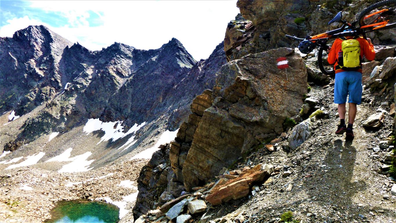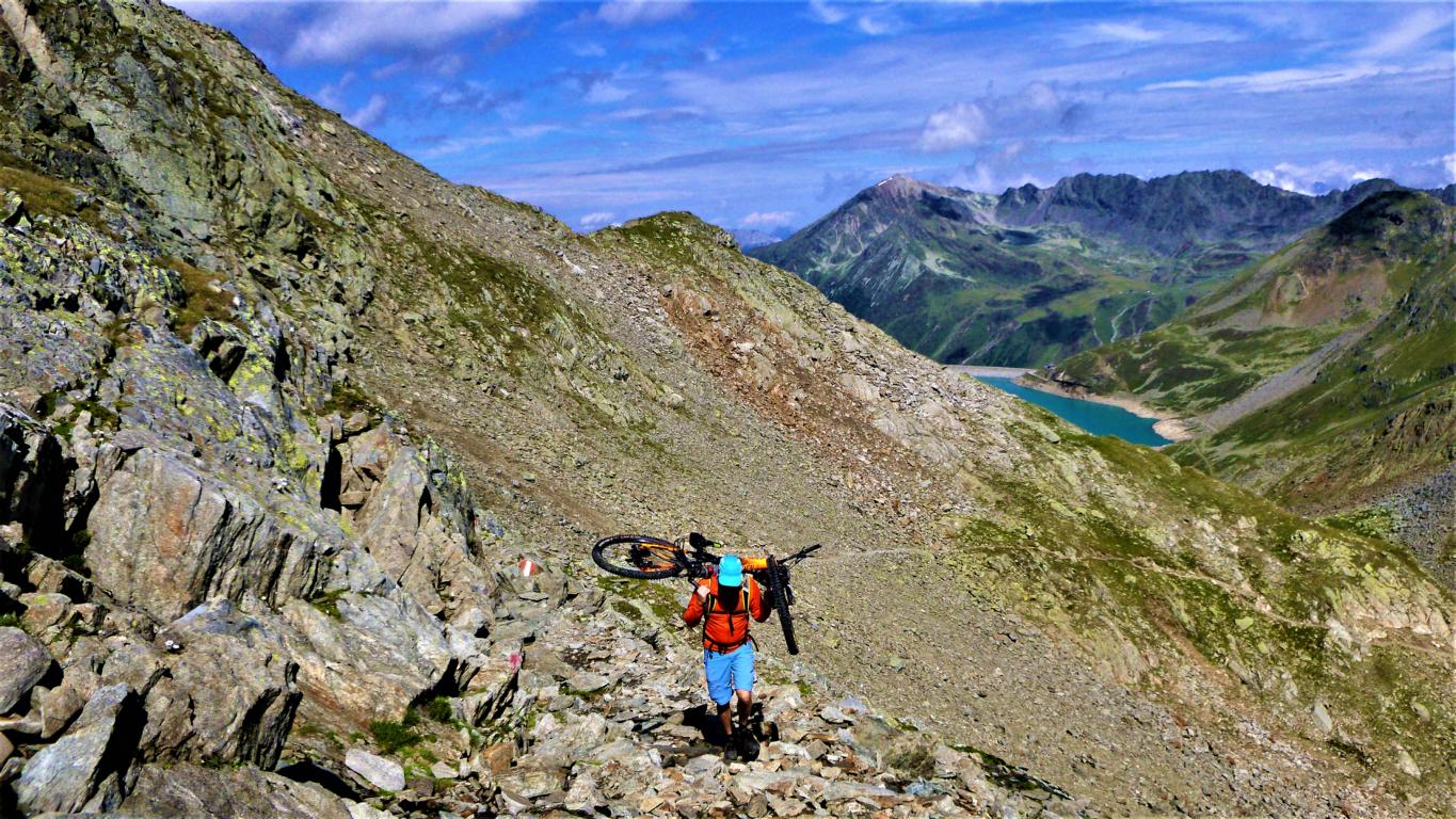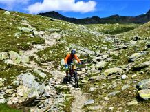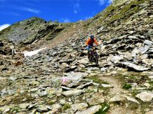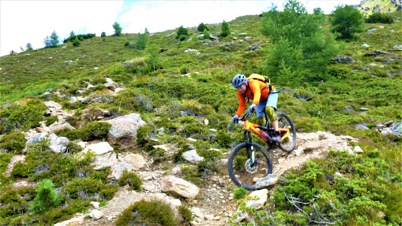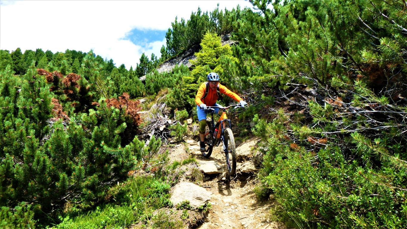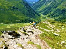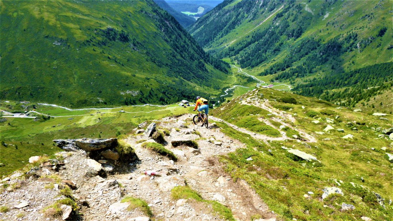 Von der Scharte führt der 146-Trail durchgehend auf grobsteinigen und verblockten Untergrund abwechselnd im Schwierigkeitsgrad S2-S3/G1 das “Weite Kar” hinaus bis es steiler wird. Von dort weiter zum größten Teil auf nicht verfestigtem, grobsteinigen und sehr verblockten Untergrund im Schwierigkeitsgrad S3/G2 mit ein paar S4/G2 Stellen hinunter zur Schweinfurter Hütte. Von der Hütte zuerst auf einen flowigen Wiesentrail, dann die Forststraße hinaus nach Niedertai. Von dort auf der Straße am Stuibenfall vorbei und weiter über den sehr schönen Trail hinunter nach Umhausen. Der Schwierigkeitsgrad des Trails liegt bei S2/G1 mit ein paar S3 und S4/G2 Stellen. Von Umhausen nach Oetz und mit dem Shuttle zurück ins Kühtai.