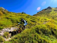 Am Tuxer Joch angekommen, wartet das nächste Abenteuer: der historische 324er Trail. Dieser Abschnitt zieht deutlich an – sowohl was den Trailcharakter als auch die Fahrtechnik angeht. Auf grobsteinigem, stark verblocktem Terrain führt der Trail steil talwärts in Richtung Kaserer Bach. Hohe Felsstufen, einige knifflige S3-Spitzkehren und ein insgesamt ruppiger Charakter machen diesen Teil zur echten Schlüsselstelle der Tour.