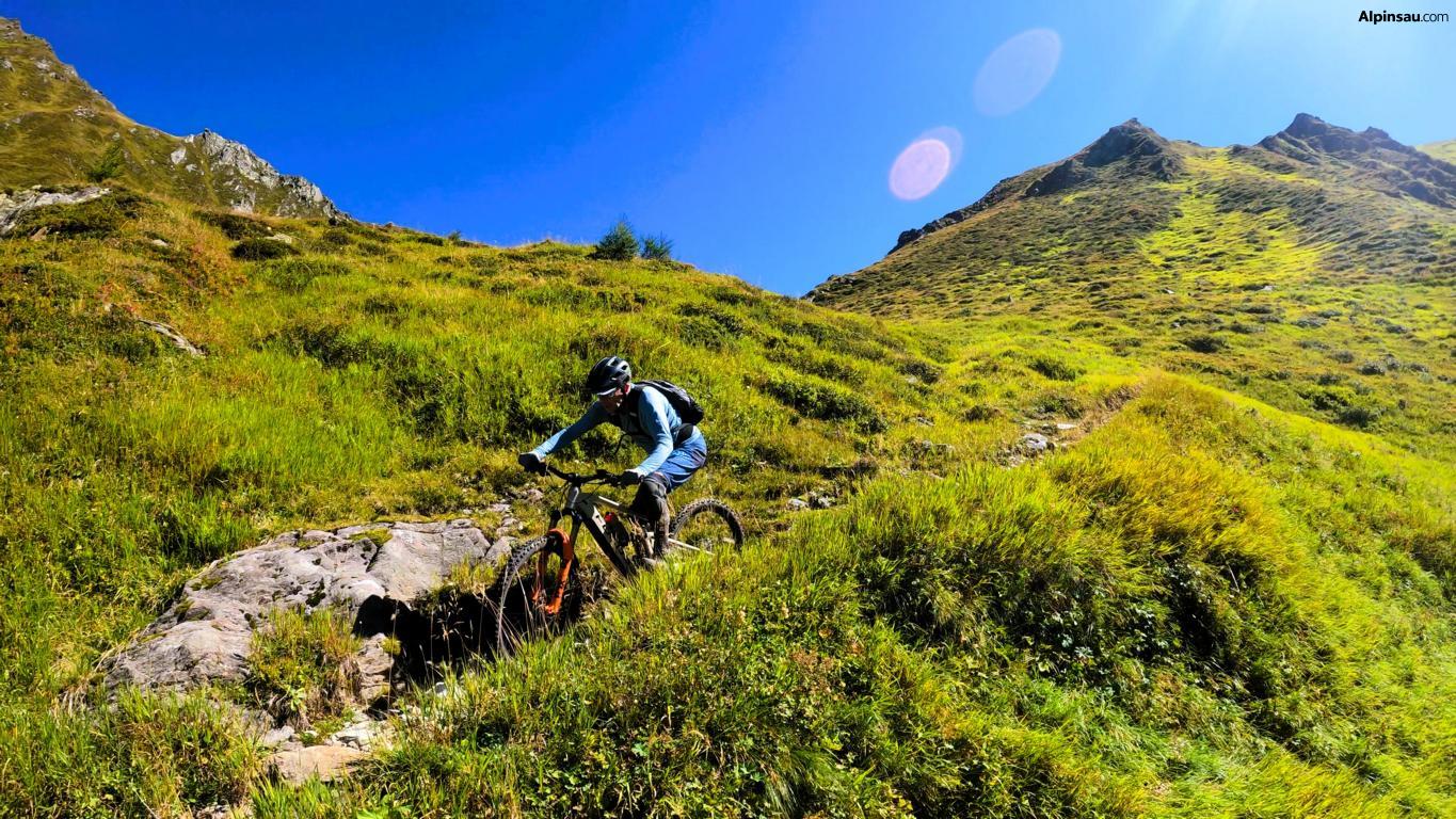 Der Startpunkt an der Weißen Wand ist nicht nur landschaftlich beeindruckend, sondern auch der Auftakt zu einer technisch fordernden Abfahrt. Der Trail führt auf grobsteinigem Untergrund bergab in Richtung Tuxer Joch. Der Schwierigkeitsgrad liegt hier durchgehend bei S2, mit einigen Stellen, die deutlich in den S3-Bereich ragen. Hier ist volle Konzentration gefragt – lose Steine, enge Kurven und kleine Felsstufen fordern eine saubere Linienwahl und gutes Bike-Handling.