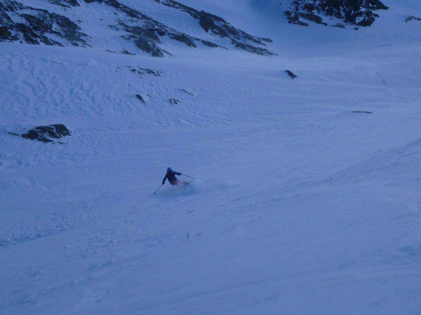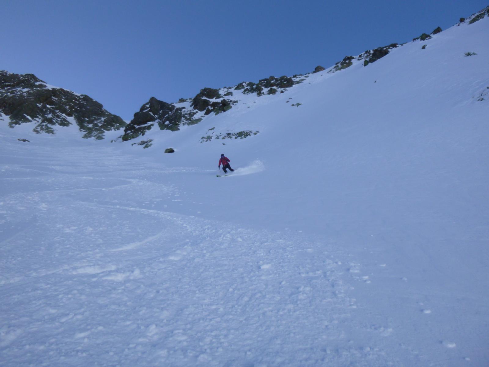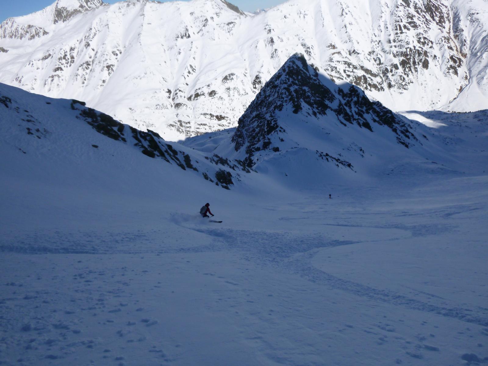 Abfahrt vom Gipfel über die sehr Steile und enge Rinne in das weite Hirschebenkar. Mit vielen Abfahrtsvarianten bei brauchbarem Pulver geht’s hinunter zum Lärchengürtel. Von dort weiter über die steileren Hänge, bei gutem Pulver, nach Haggen.