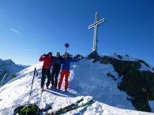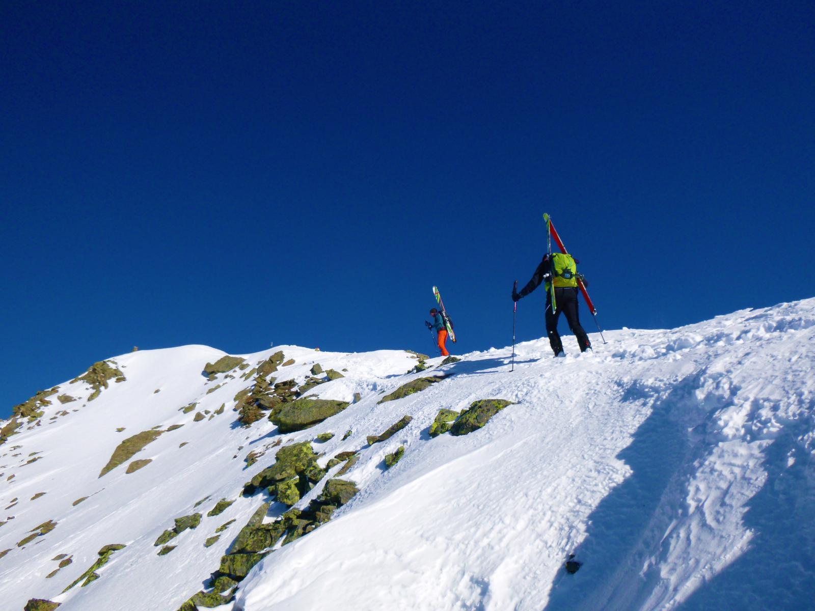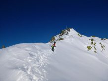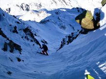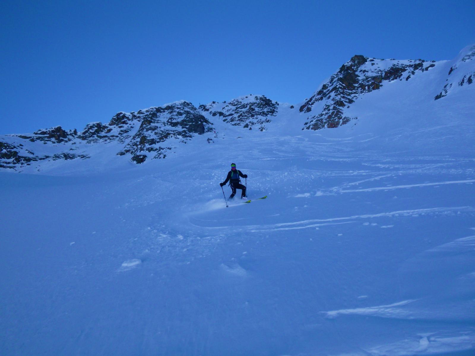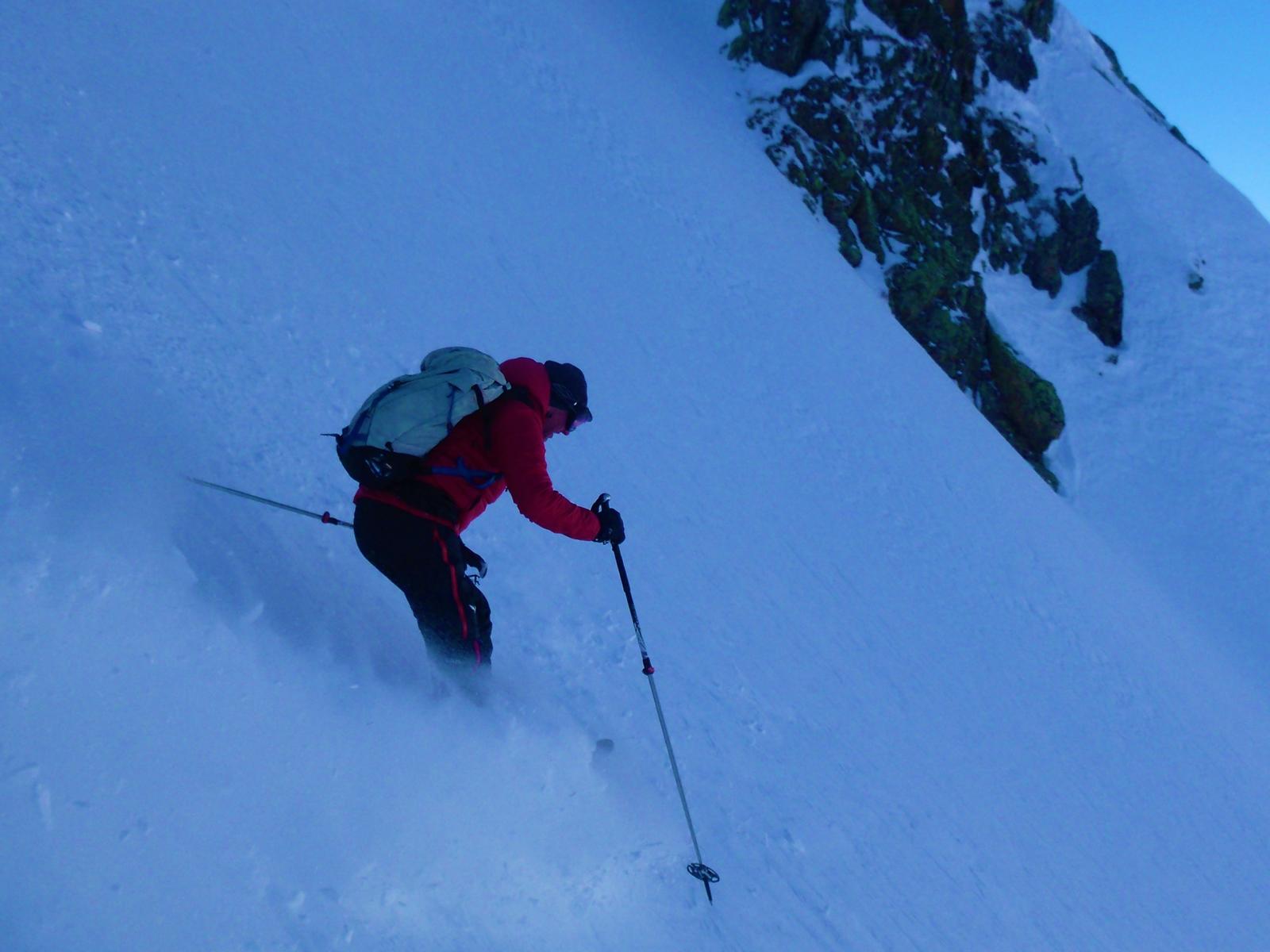 Abfahrt vom Gipfel über die sehr Steile und enge Rinne in das weite Hirschebenkar. Mit vielen Abfahrtsvarianten bei brauchbarem Pulver geht’s hinunter zum Lärchengürtel. Von dort weiter über die steileren Hänge, bei gutem Pulver, nach Haggen.