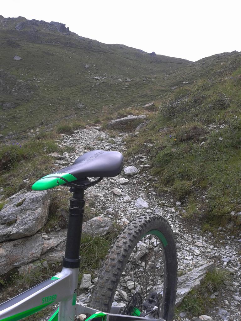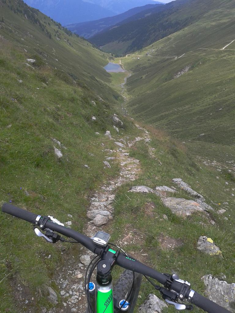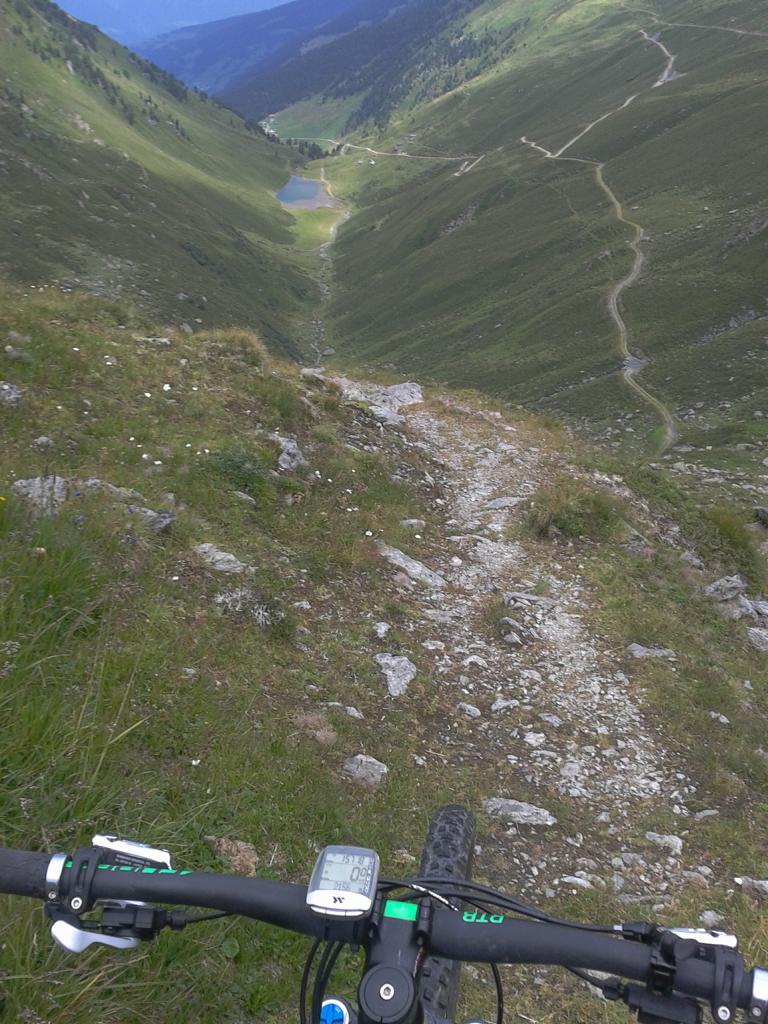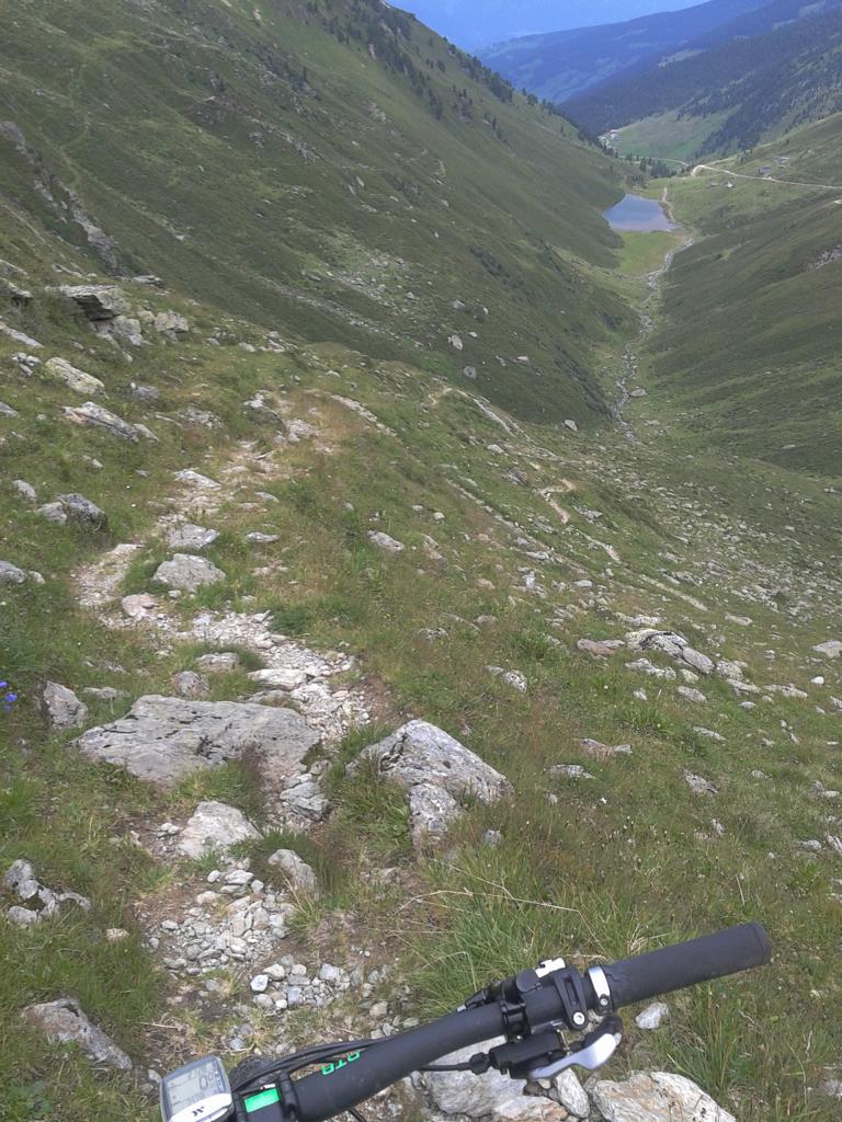 Vom Geiseljoch führt ein schöner Singletrail-S2 hinunter zum Almboden der Nafingalm. Leider fährt man danach recht viel am Forstweg talauswärts weiter. Aber immer wieder gibt es Abzweigungen auf einen Singletrail im Schwierigkeitsgrad-S1 bis S2.