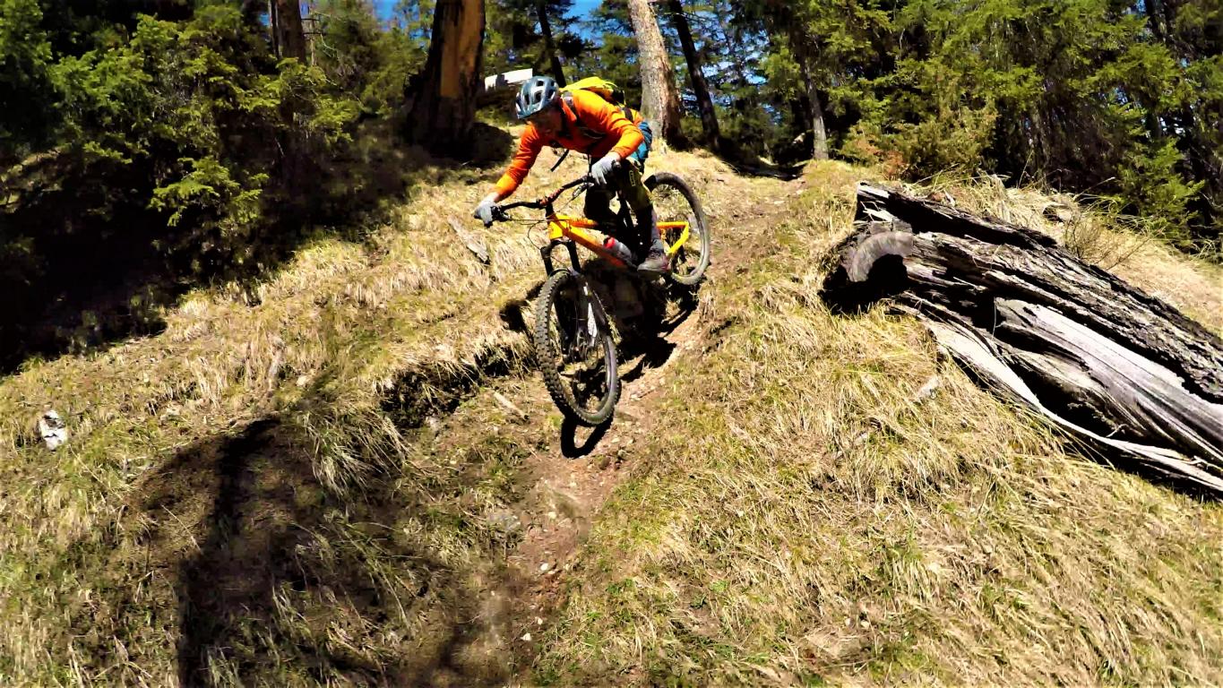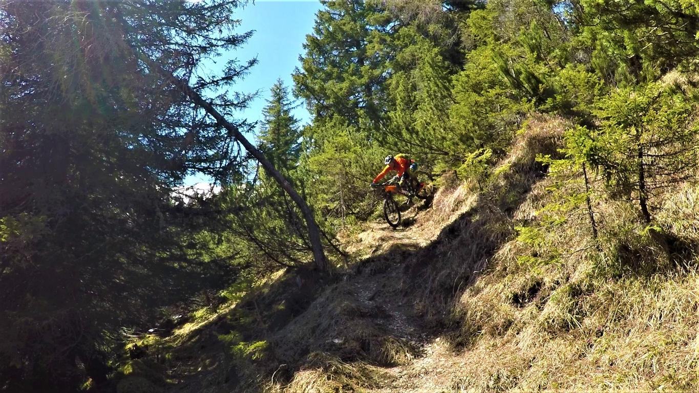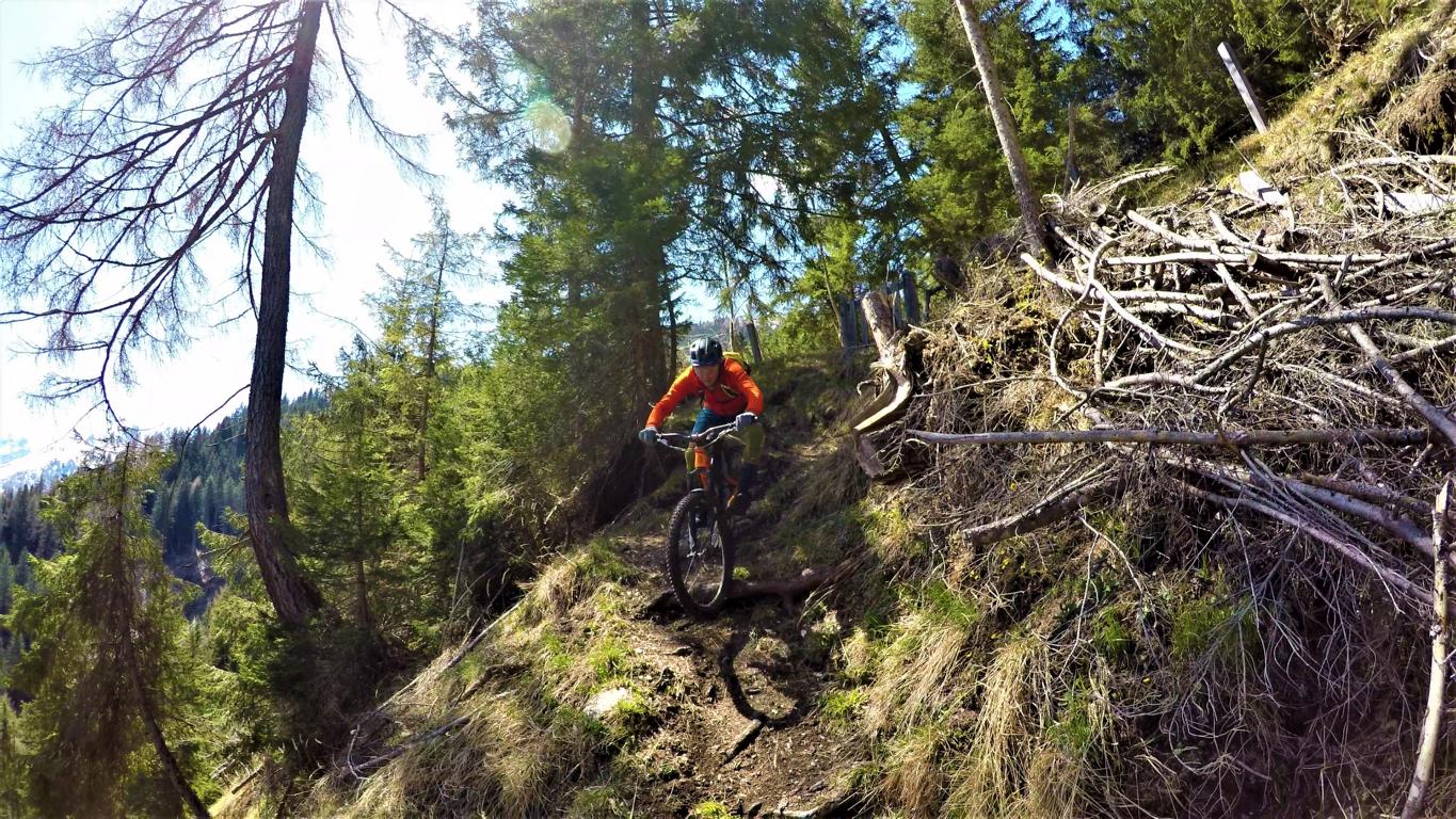 Der Trail führt auf festem Untergrund mit vielen engen Spitzkehren hinunter nach Vergör. Die Kehren sind super eng, das Hinterrad versetzen ist zwingend und deshalb mit S3 zu bewerten. Von Vergör weiter über wurzeligen Waldboden abwechselnd im Schwierigkeitsgrad S1/S0 zum Gröbenhof.