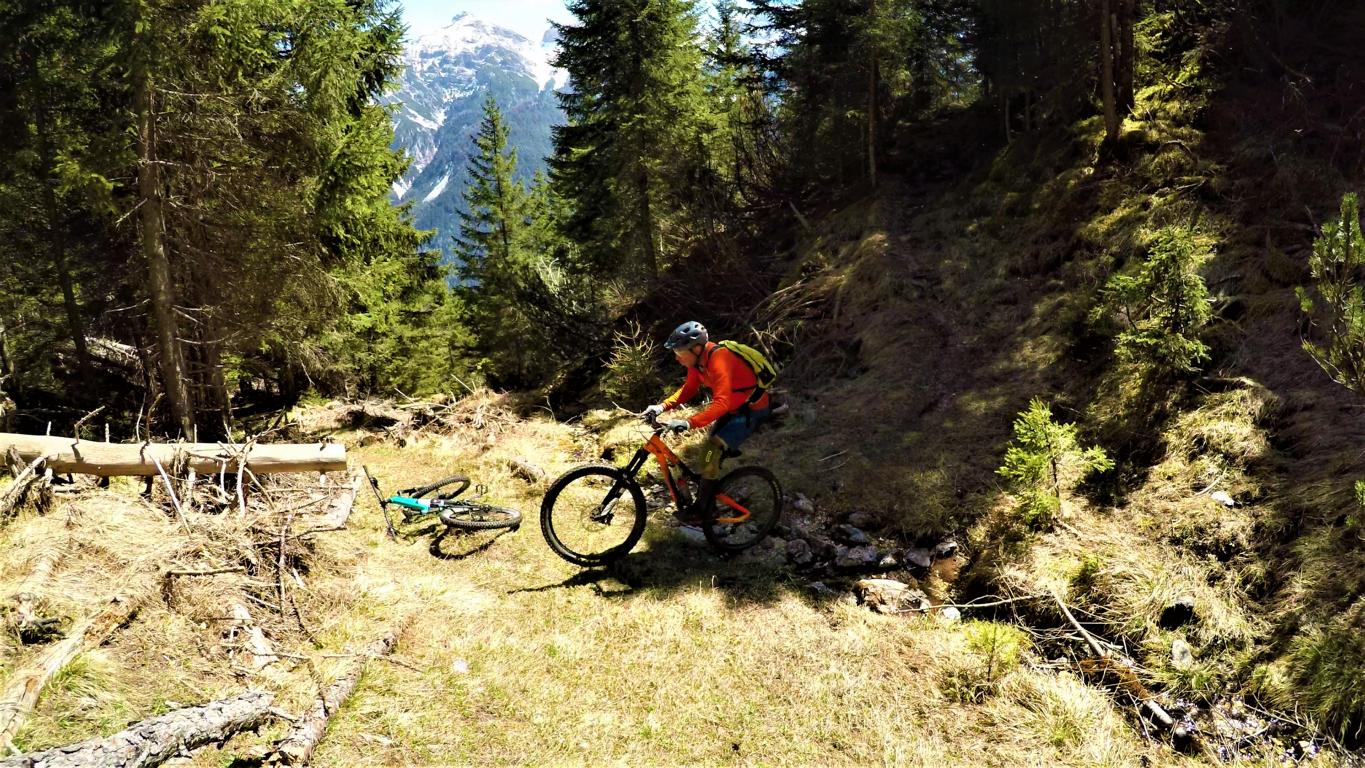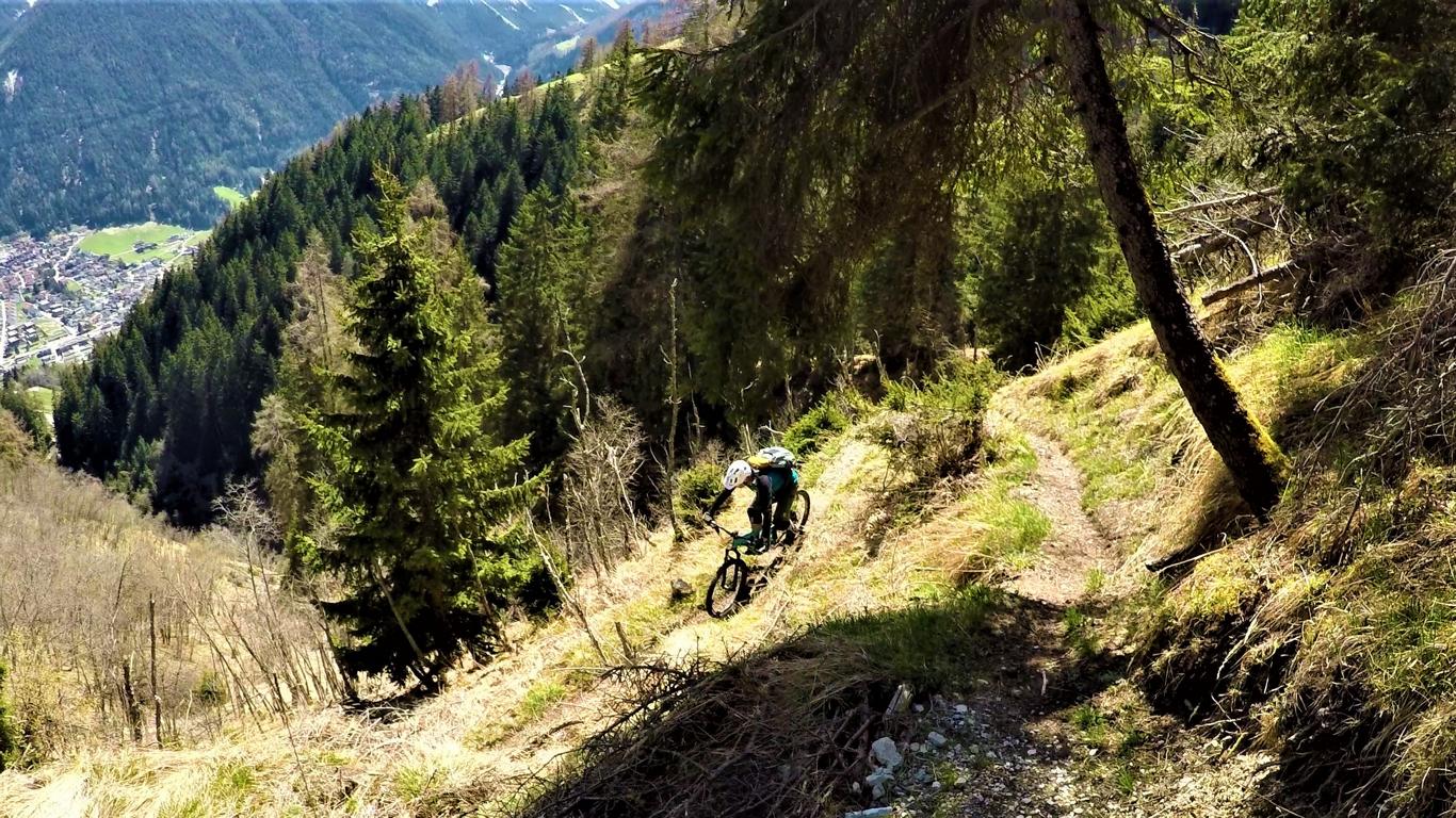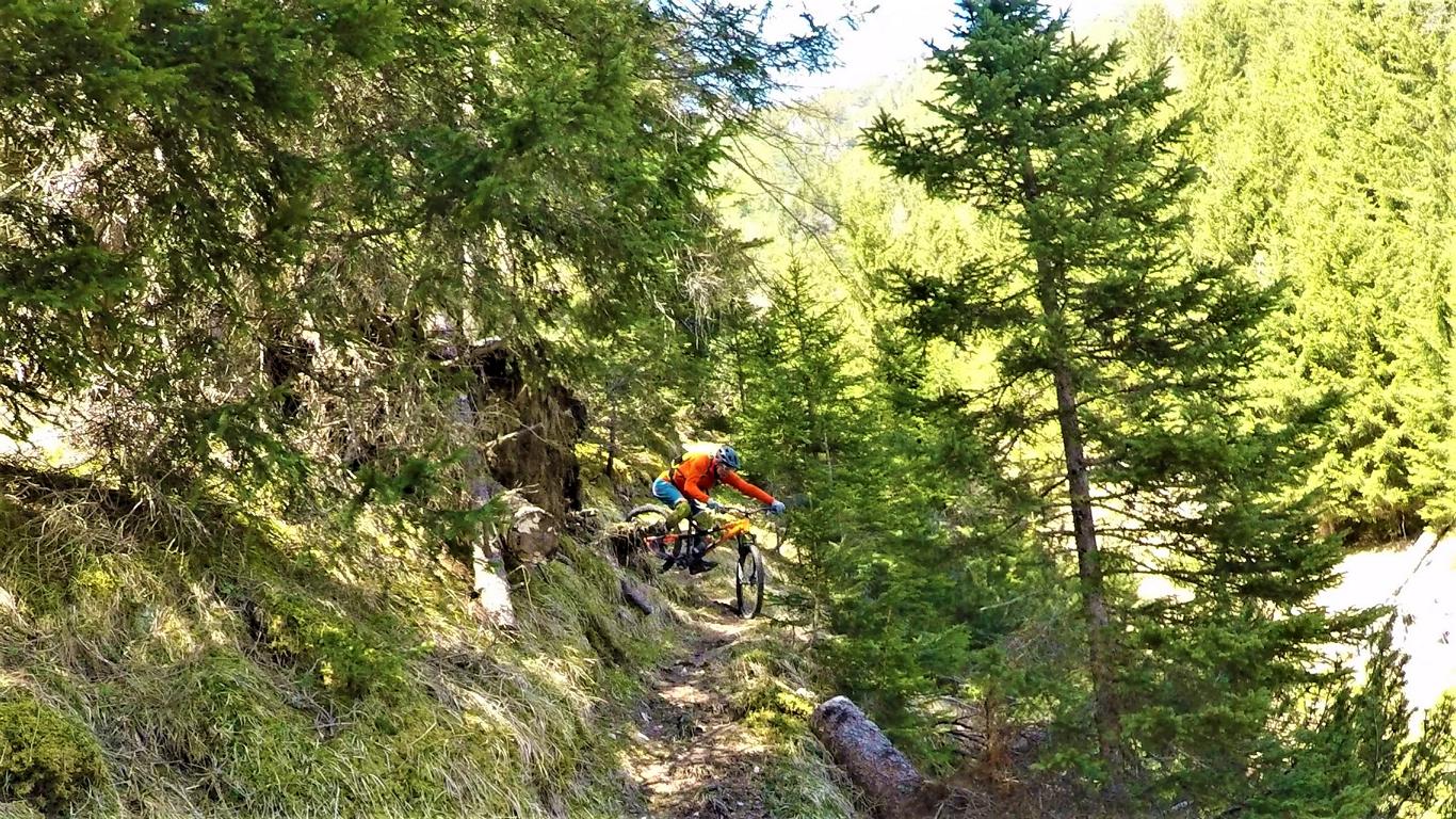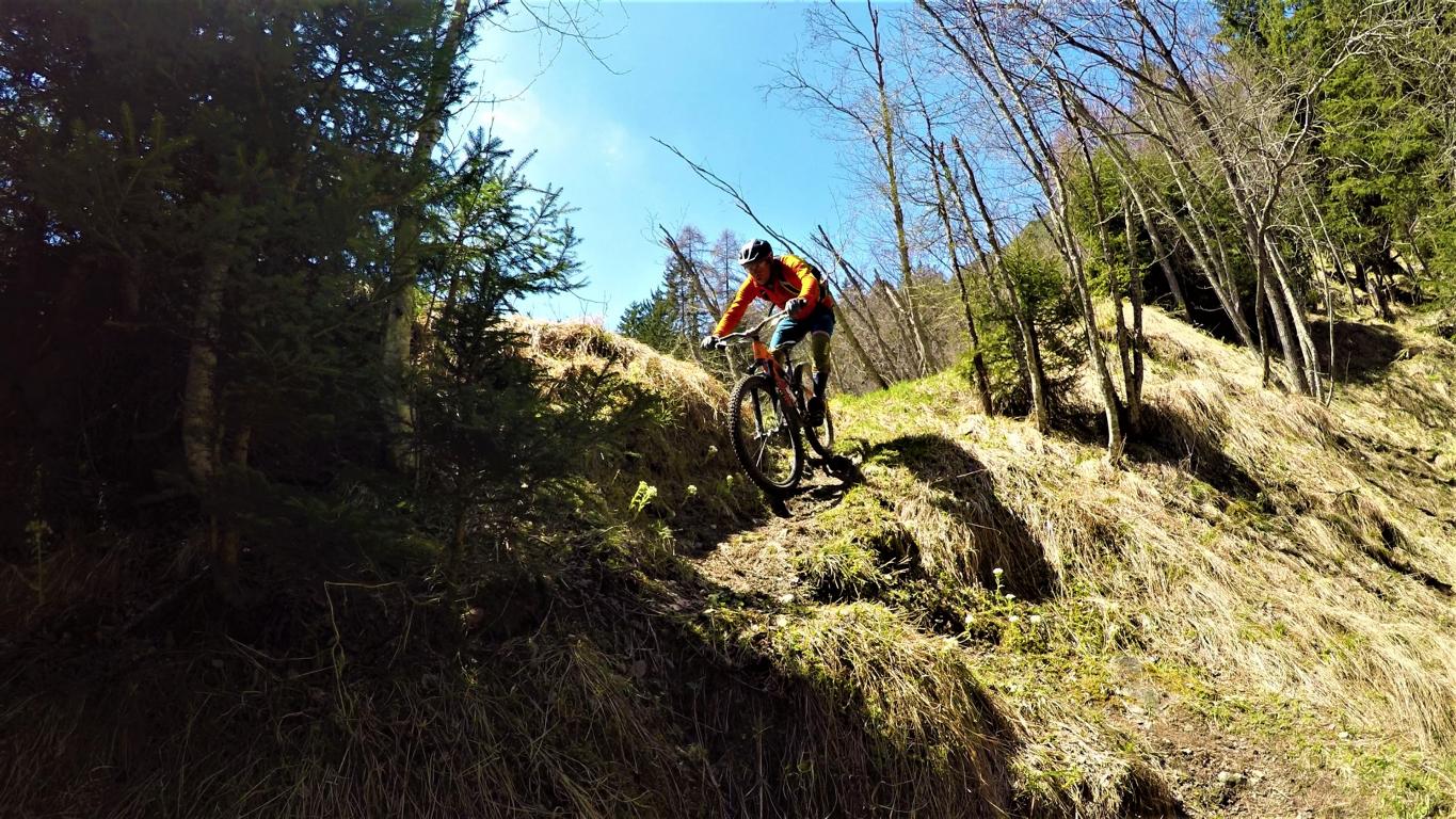 Der Trail führt auf festem Untergrund mit vielen engen Spitzkehren hinunter nach Vergör. Die Kehren sind super eng, das Hinterrad versetzen ist zwingend und deshalb mit S3 zu bewerten. Von Vergör weiter über wurzeligen Waldboden abwechselnd im Schwierigkeitsgrad S1/S0 zum Gröbenhof.