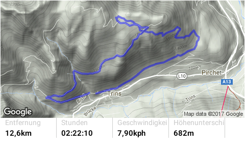 Auffahrt von Trins Richtung Blaserhütte auf den Hablerberg. Abfahrt über den ST13 zu Beginn noch im Schwierigkeitsgrad S0/S1. Weiter über den sehr schönen Trail abwechselnd im Schwierigkeitsgrad S1 und S2 über den Pflutschboden zurück nach Trins.