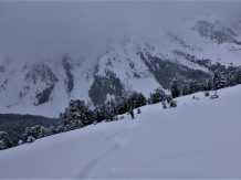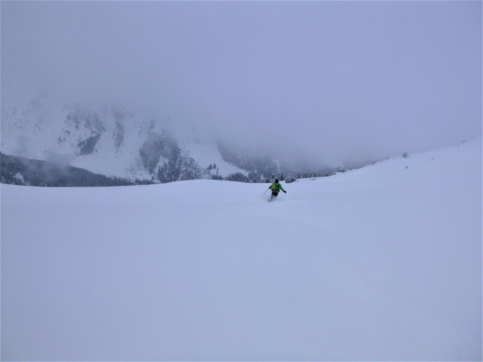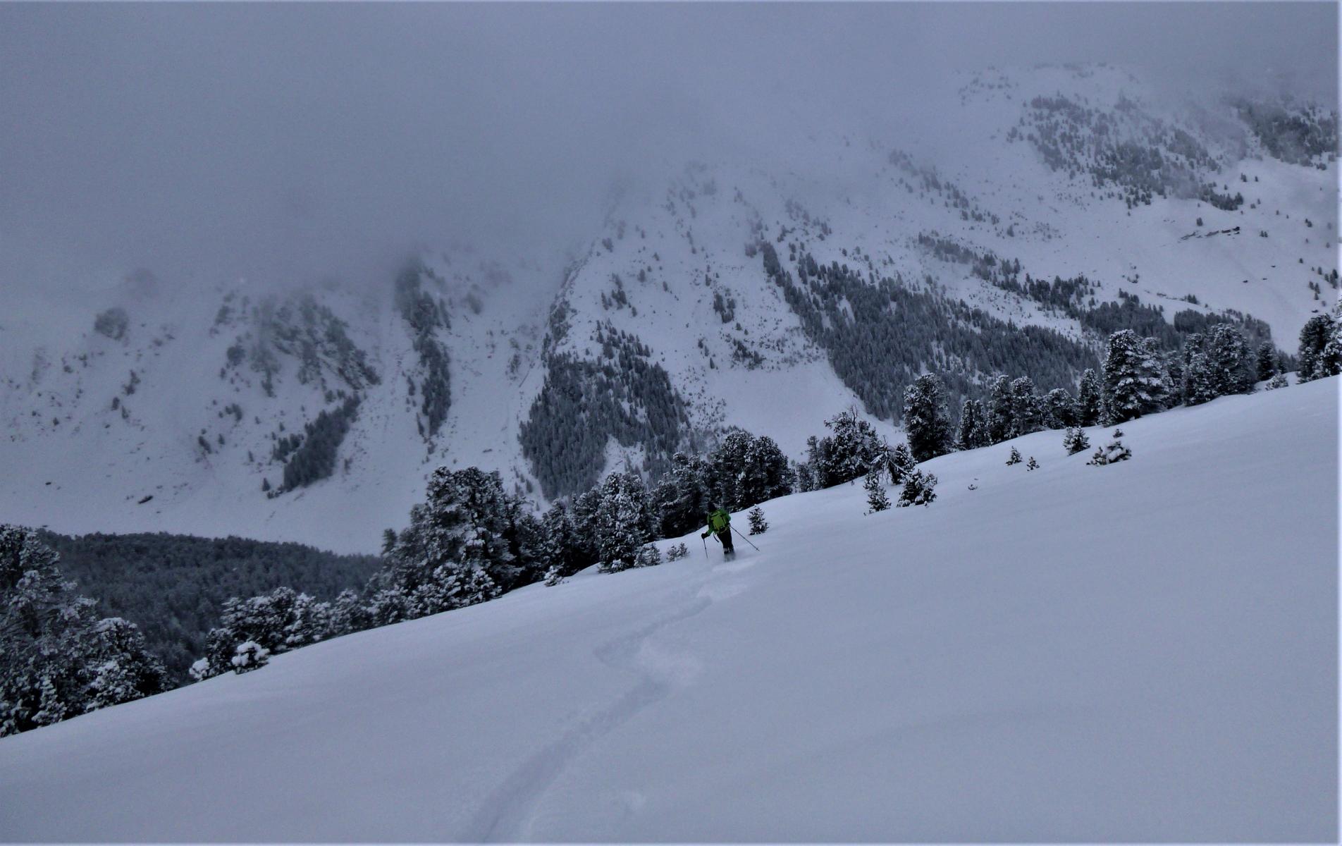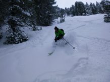Gute Verhältnisse, ca. 20 cm Pulver. Abfahrt über die schönen Pulverhänge Richtung Weidener Hütte hinunter.