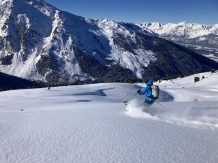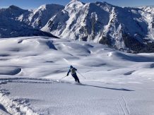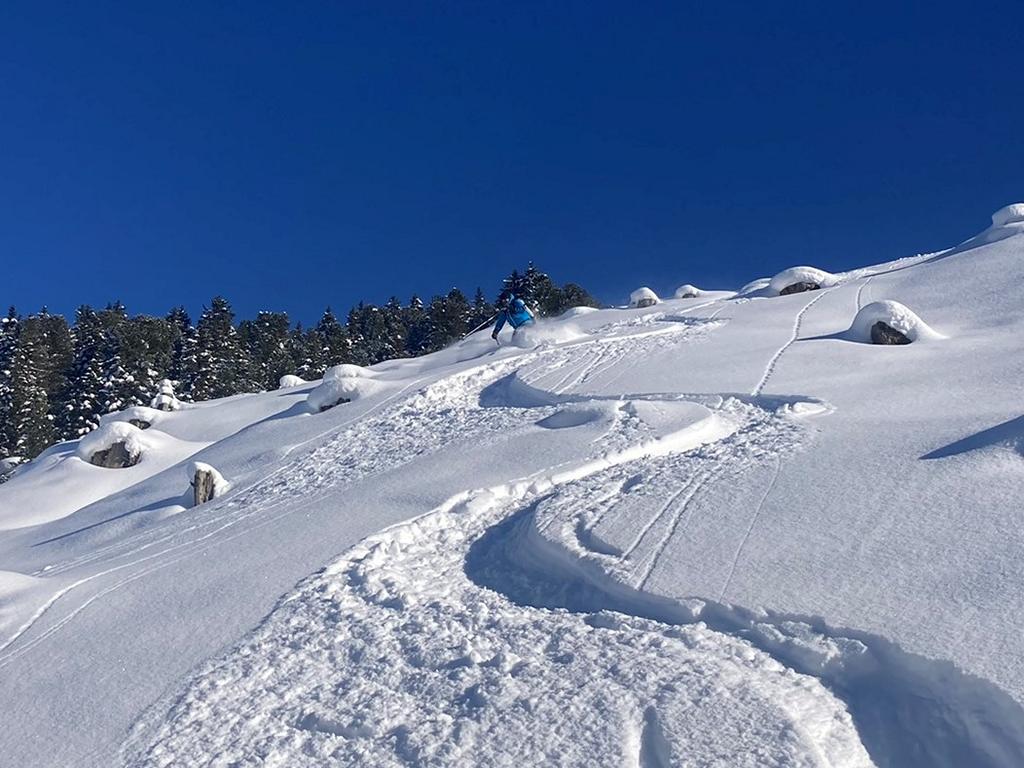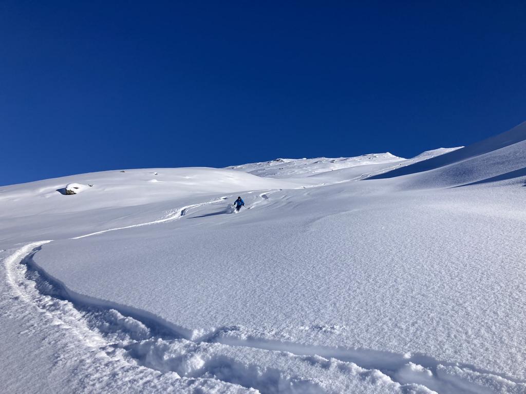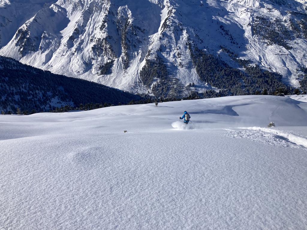 Bei perfekten Verhältnissen, ca. 30 bis 40 cm Pulver, hinauf zum Gipfel des Hohen Kopfes. Abfahrt über die super schönen Pulverhänge hinunter nach Innerst.