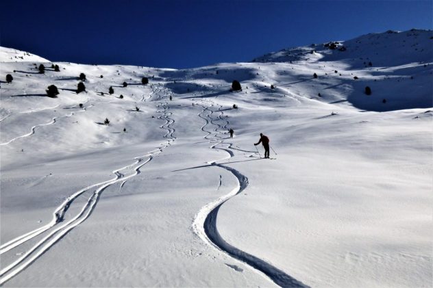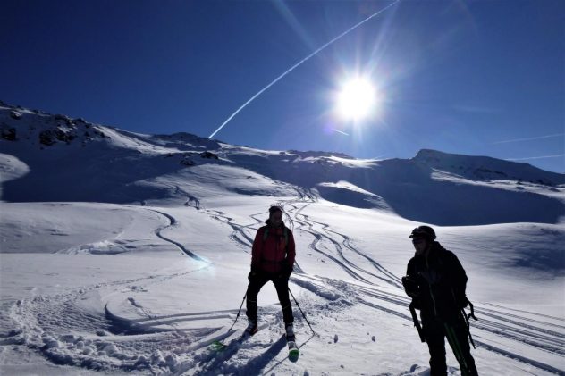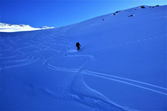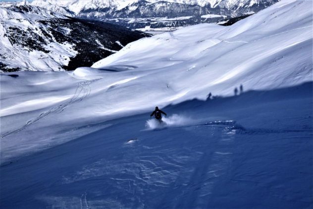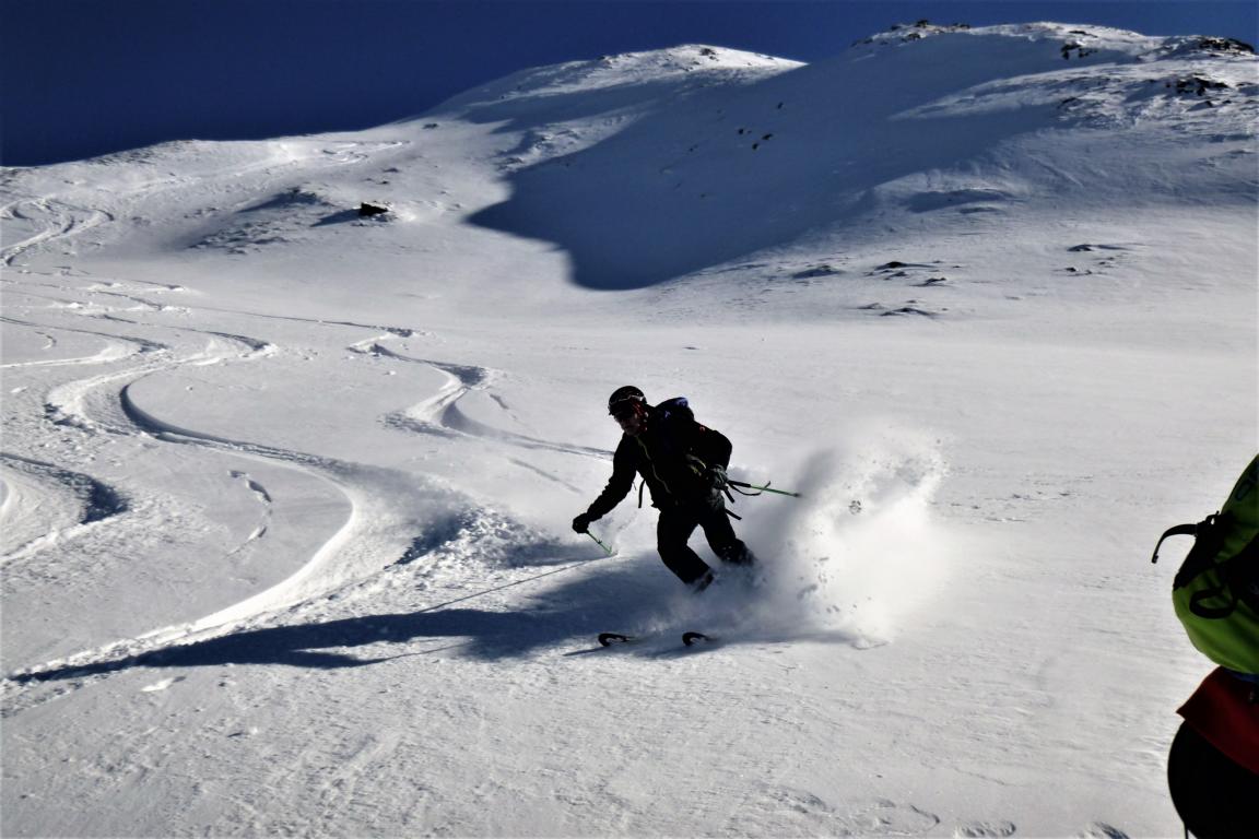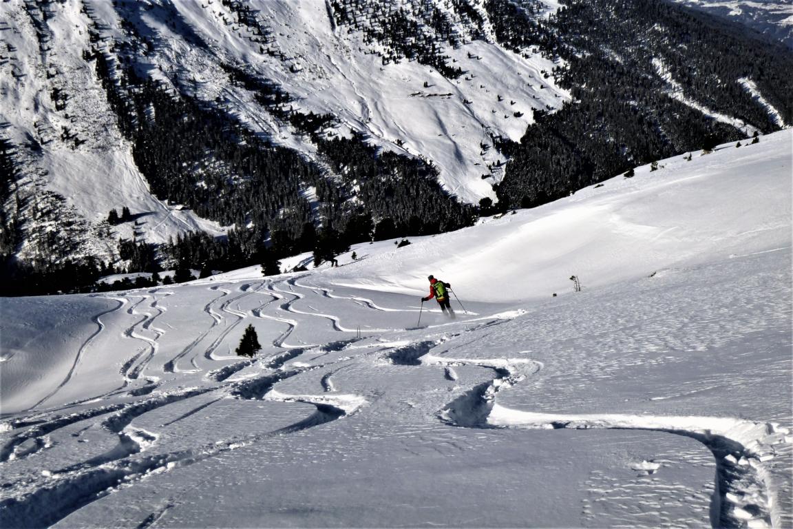 Bei perfekten Verhältnissen, ca. 20 bis 30 cm Pulver, hinauf zum Gipfel des Hohen Kopfes. Abfahrt über die super schönen Pulverhänge zur Weidener Hütte hinunter. Von dort fällten wir auf und gingen noch aufs Nafingköpfl.