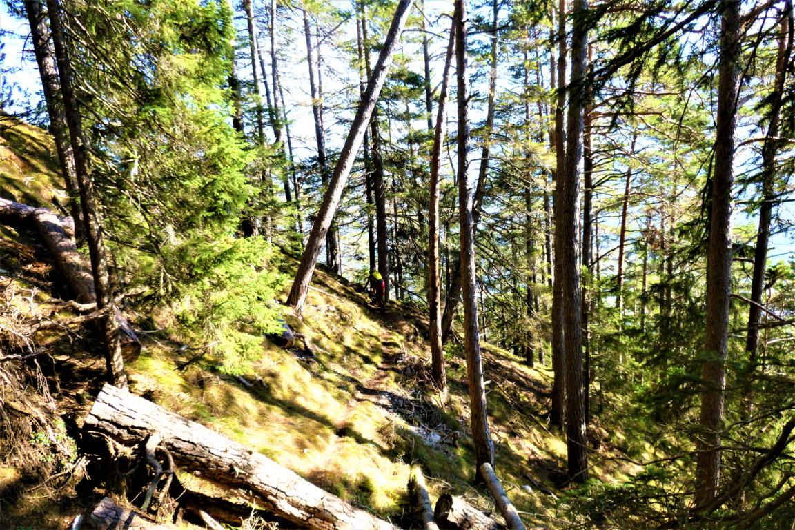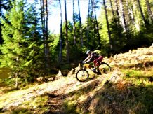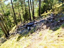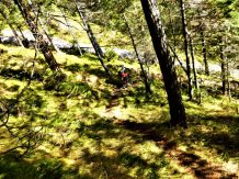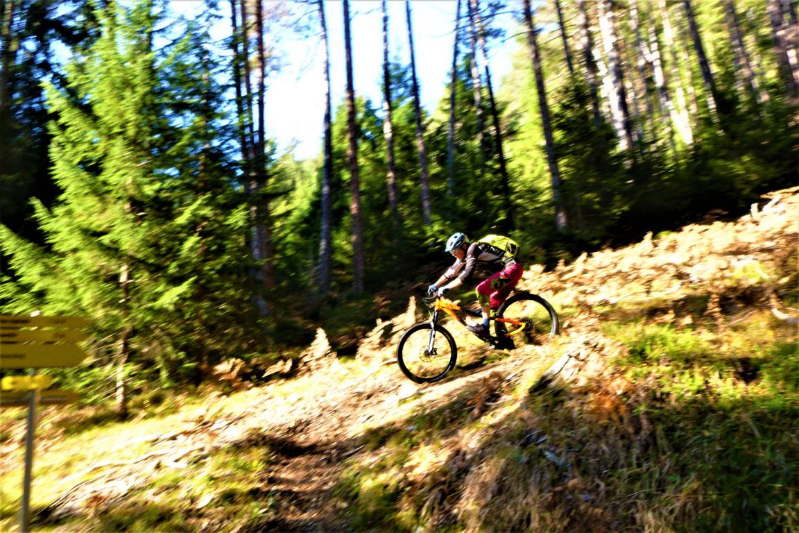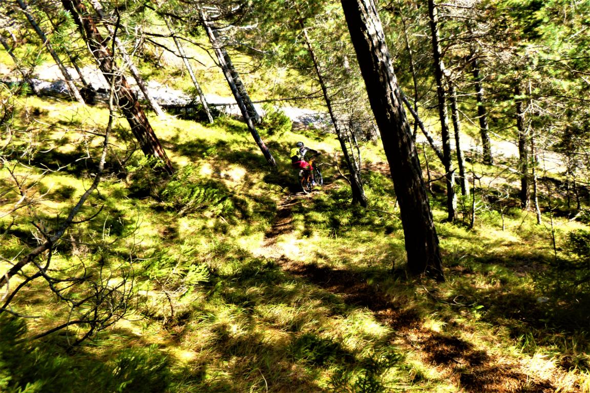 Von der Hütte sehr steil und auf extrem schmalen Trail mit schwierigen Querfahrten, zum größten Teil auf verfestigtem Untergrund mit super engen Spitzkehren, im Schwierigkeitsgrad S3+/G3 mit mehreren S4/G3 Passagen hinunter nach Wildermieming. Von dort den Straßbergweg hinauf und über den flowigen S1/S2 Trail auf festem Untergrund mit einigen S2/S3-Spitzkehren, kleineren Wurzel- und Felsstufen hinunter zum Griesbach.