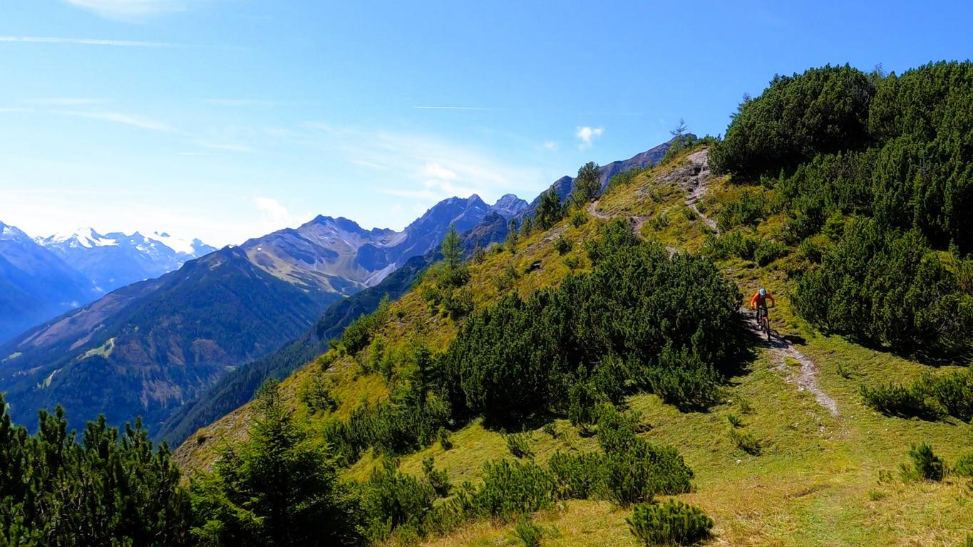 Der Jochkreuztrail gehört zu den Touren, die gleichermaßen fordern wie belohnen. Bereits der Einstieg sorgt für ein Highlight: Vom Kreuz aus geht es direkt in die Abfahrt hinein – ein S2-Trail, der technisch versierte Bikerinnen und Biker mit Spaßfaktor pur abholt. Über wurzelige Passagen und kleine Stufen schlängelt sich der Pfad hinunter bis zum Telfer Berg.