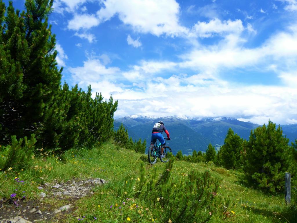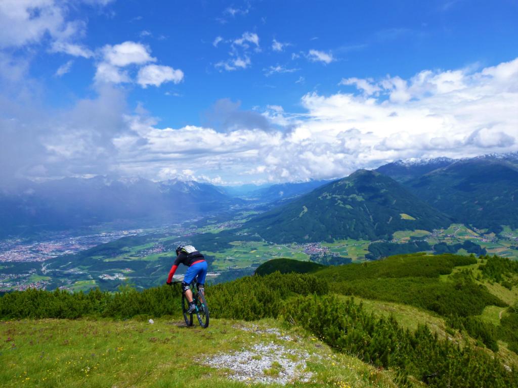 Auffahrt von Kapfers auf die Pfarrachalm. Von dort hinauf Richtung Sailenieder. Dann rechts über den Trail abwechselnd fahrend S1-G3/schiebend/tragend ca. 350 Hm unterhalb des Nederjochs zum Jochkreuz. Abfahrt vom Kreuz über den super schönen Trail, S2/G1, hinunter zum Telfer Berg. Weiter “übers hohe Moos” und dann über den langen, sehr flowigen Trail zurück nach Kapfers.