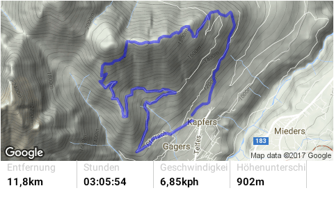 Auffahrt von Kapfers auf die Pfarrachalm. Von dort hinauf Richtung Sailenieder. Dann rechts über den Trail abwechselnd fahrend S1-G3/schiebend/tragend ca. 350 Hm unterhalb des Nederjochs zum Jochkreuz. Abfahrt vom Kreuz über den super schönen Trail, S2/G1, hinunter zum Telfer Berg. Weiter “übers hohe Moos” und dann über den langen, sehr flowigen Trail zurück nach Kapfers.