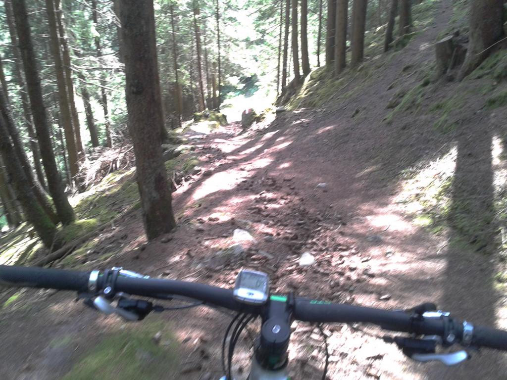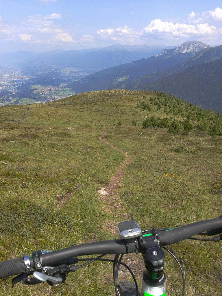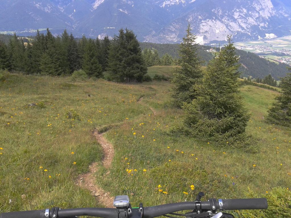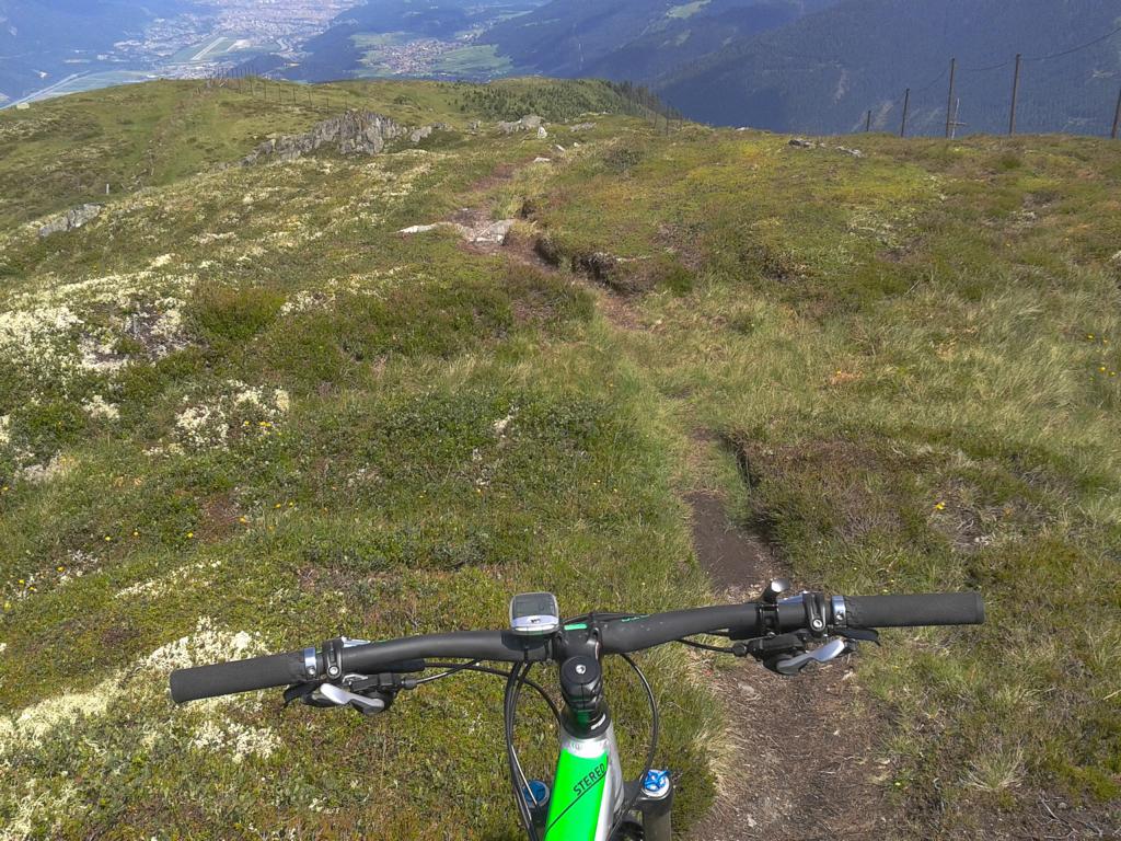 Von Oberperfuss hinunter Richtung Selraintal und bei der Abzweigung rechts die Asphaltstraße bergauf nach St. Quirin. Weiter die Forststraße hinauf bis zum Eisengatter wo der Weg wieder abwärts führt. Von dort das Bike ca. eine Stunde bis knapp unterhalb vom Kögele geschoben bzw. getragen. Der Schwierigkeitsgrad des Traumtrails mit Flow-Charakter liegt großteils bei S2/S1 im oberen Teil und weiter hinunter nach St. Quirin durch den Wald überwiegend S1 mit S2 Stellen wobei ich einen Sturz hinlegte, ist aber nicht viel passiert. Von St. Quirin über den Besinnungsweg zurück nach Oberperfuss.