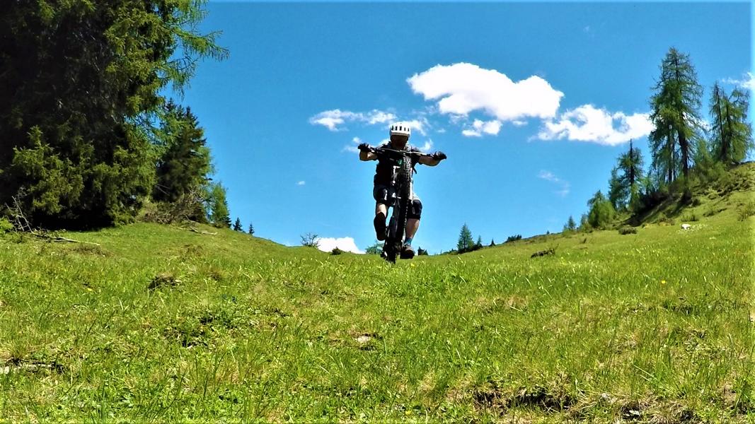 Von dort über den flowigen Zimmerbergtrail auf festem Untergrund mit einigen S2/S3-Spitzkehren, kleineren Wurzel- und Felsstufen hinunter zum Griesbach.