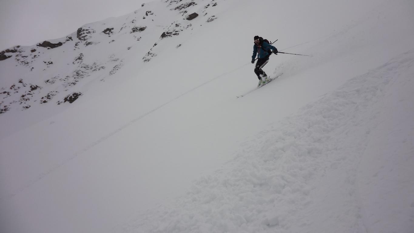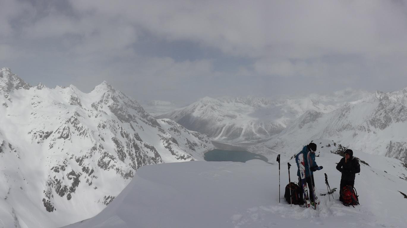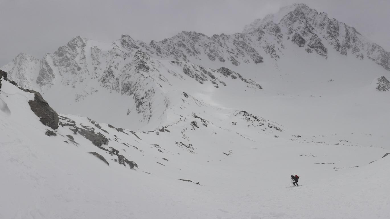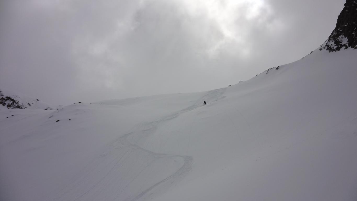 Von dort gings über schöne Südhänge in den Talboden vom Weiten Kar. Wir fellten unsere Skier auf und über eine Steilstufe gings aufwärts nach Norden auf die Kraspesspitze. Abfahrt über den steilen Nordosthang vom Sattel in das Wilde Kar. Anschließend kurz Richtung Kraspessee und wiederum links nach Norden über steile Hänge direkt in das weite Becken zwischen der 1.und 2. Zwinge ins Kraspesstal nach Haggen.