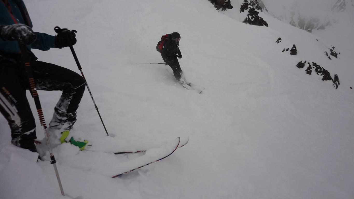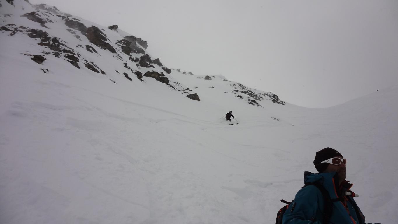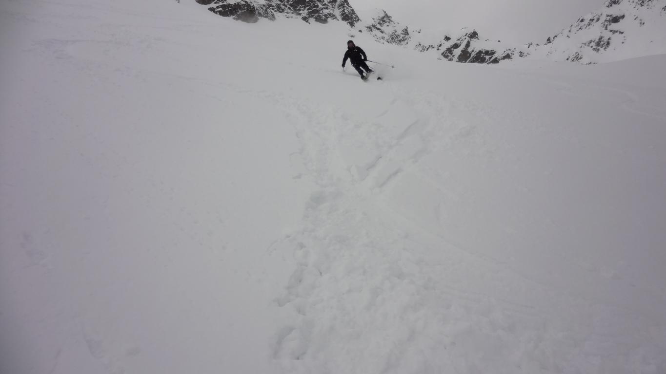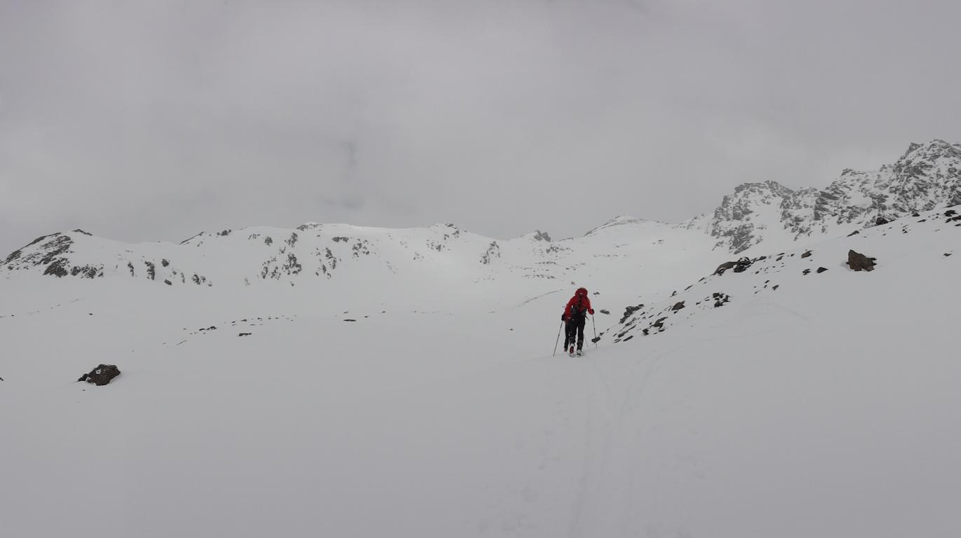 Von dort gings über schöne Südhänge in den Talboden vom Weiten Kar. Wir fellten unsere Skier auf und über eine Steilstufe gings aufwärts nach Norden auf die Kraspesspitze. Abfahrt über den steilen Nordosthang vom Sattel in das Wilde Kar. Anschließend kurz Richtung Kraspessee und wiederum links nach Norden über steile Hänge direkt in das weite Becken zwischen der 1.und 2. Zwinge ins Kraspesstal nach Haggen.