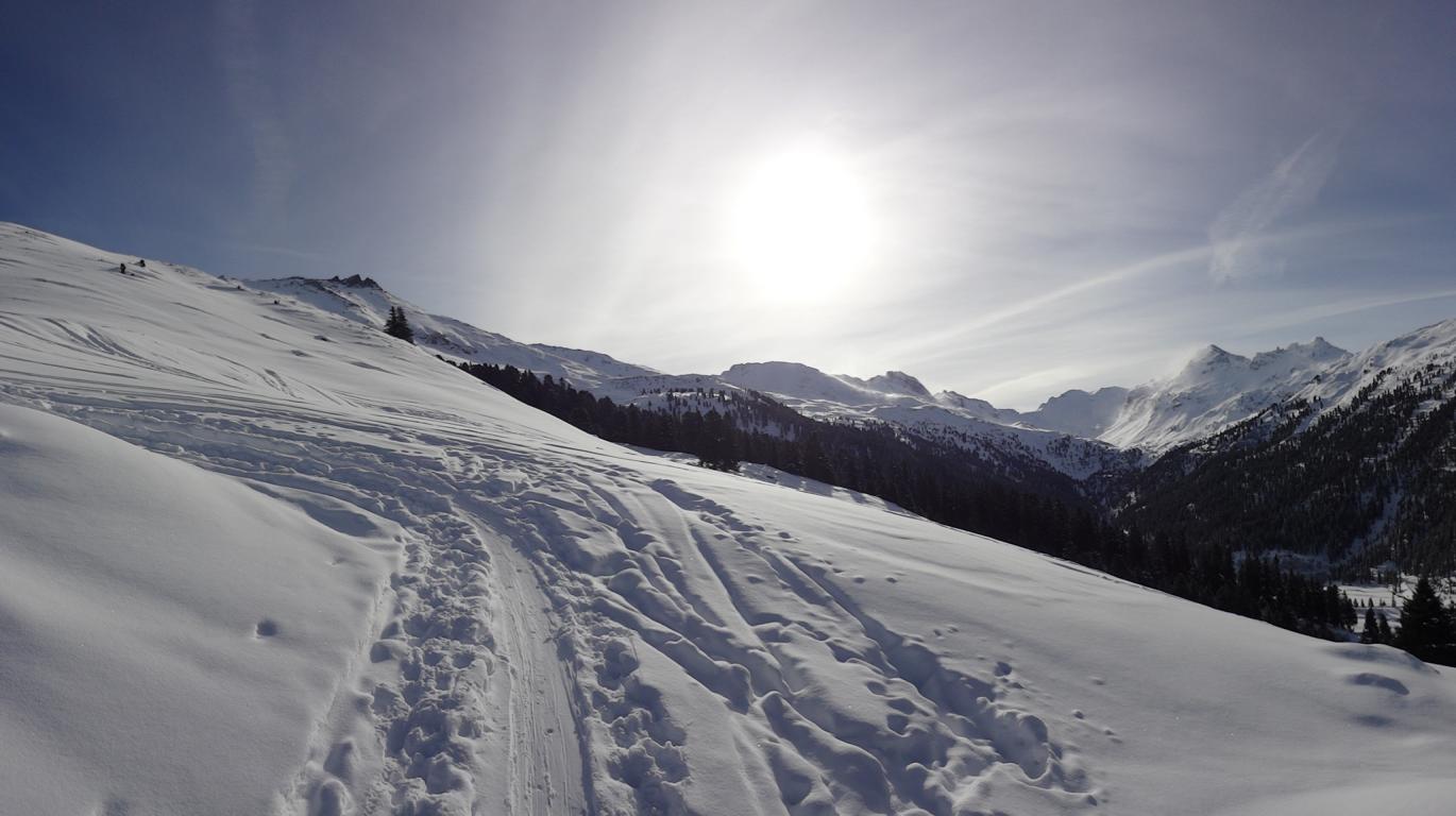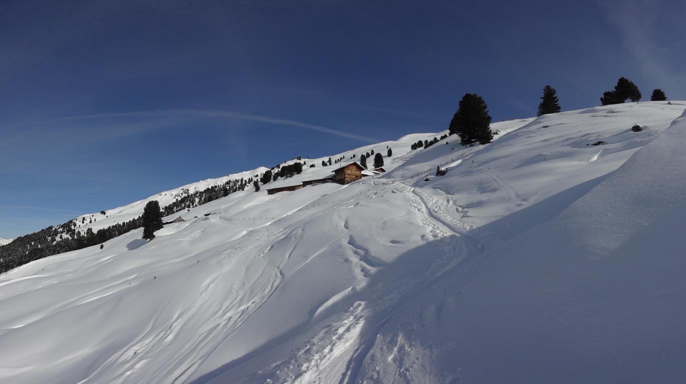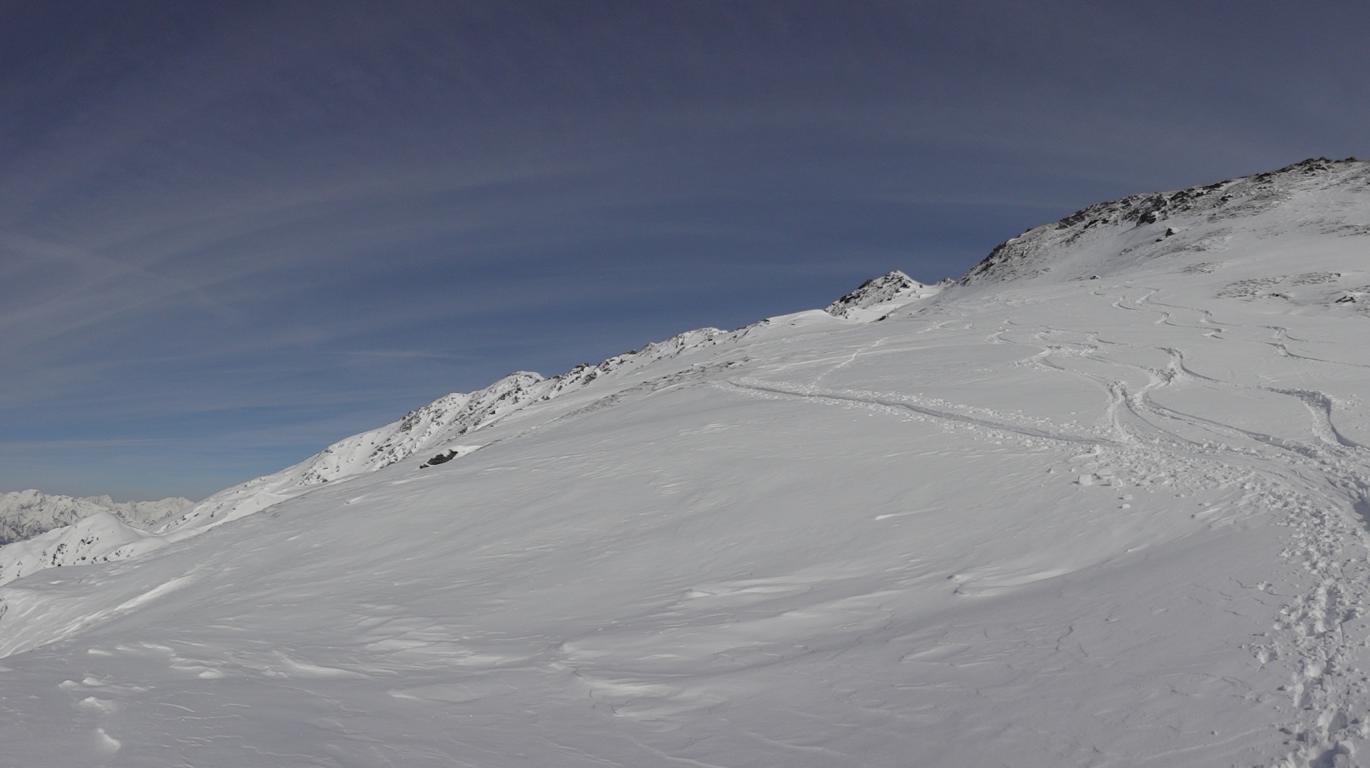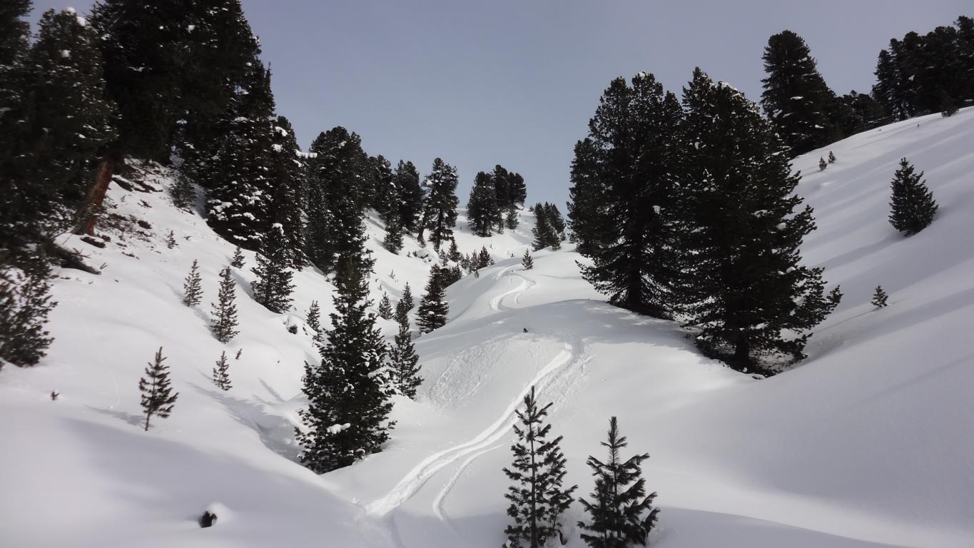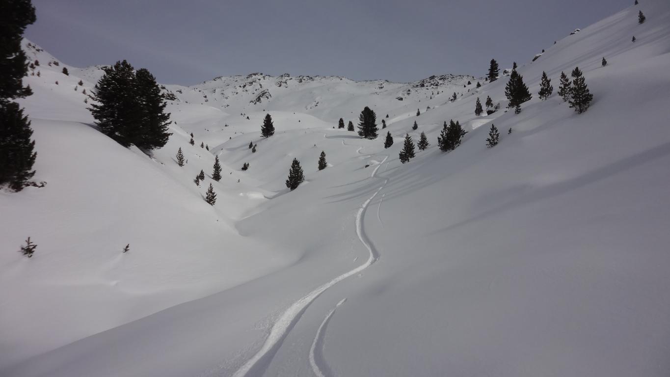 Aufstieg vom Lager Walchen über die Äusseren-Melang Almen auf die Krovenzspitze. Abfahrt nicht wie Aufstieg – direkt vom Gipfel Richtung Westen in die weite Mulde der Lannalm über die Hänge abgefahren. Schöne Pulverhänge bis zur Waldgrenze. Im Wald ist so gut wie keine Schneeunterlage, Steinskier sind von Vorteil.