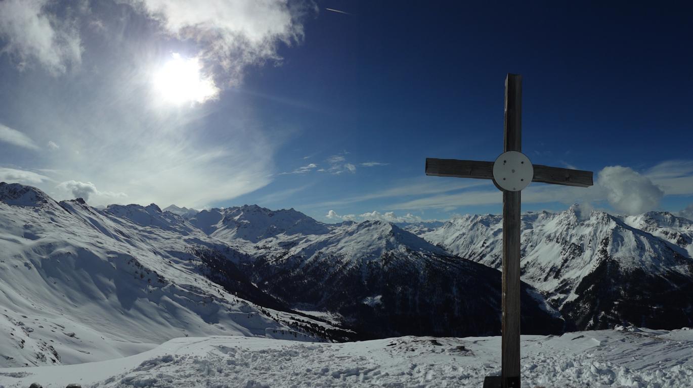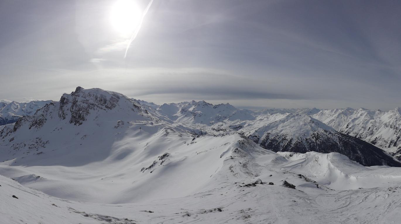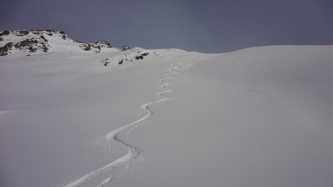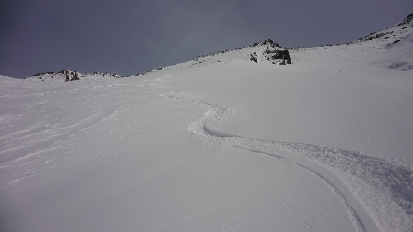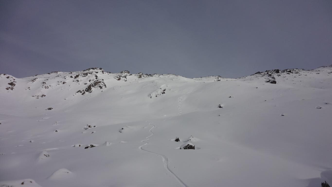 Aufstieg vom Lager Walchen über die Äusseren-Melang Almen auf die Krovenzspitze. Abfahrt nicht wie Aufstieg – direkt vom Gipfel Richtung Westen in die weite Mulde der Lannalm über die Hänge abgefahren. Schöne Pulverhänge bis zur Waldgrenze. Im Wald ist so gut wie keine Schneeunterlage, Steinskier sind von Vorteil.