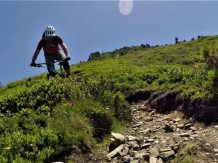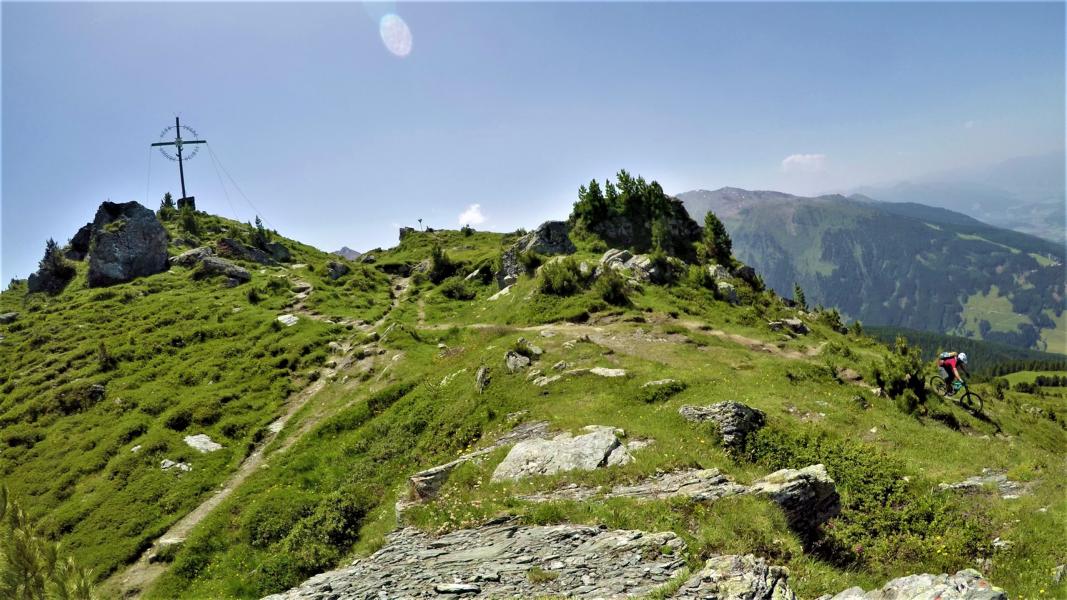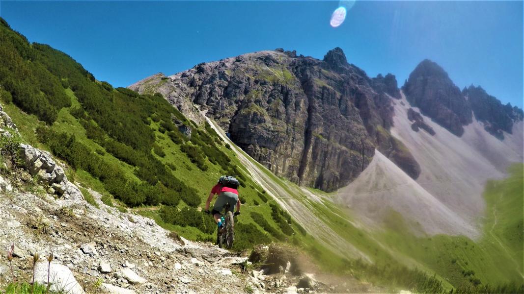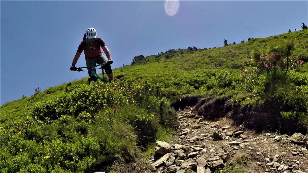 Abfahrt direkt vom Gipfelkreuz zum größten Teil auf nicht verfestigten grobsteinigem Untergrund im Schwierigkeitsgrad S3/G1 hinunter zur Largozalm. Von dort weiter über den S2+ Trail auf festem Untergrund mit einigen S3 Stellen mit hohen Wurzel- und Felsstufen hinunter zur Krepperhütte.