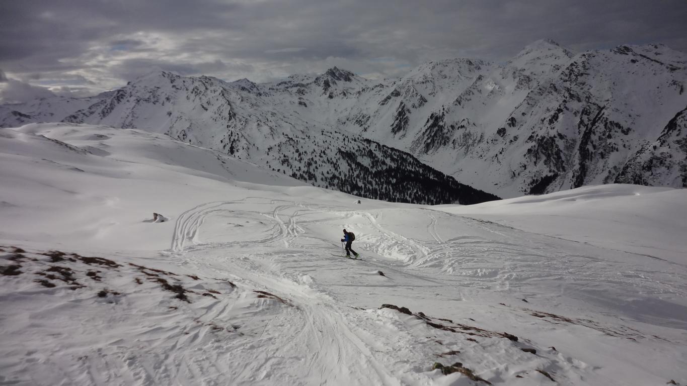 Sehr verblasen aber in den eingewehten Mulden liegt schöner Pulver dort ohne Steinkontakt. Nach wie vor noch eher zu wenig Schnee, Steinski sind von Vorteil.