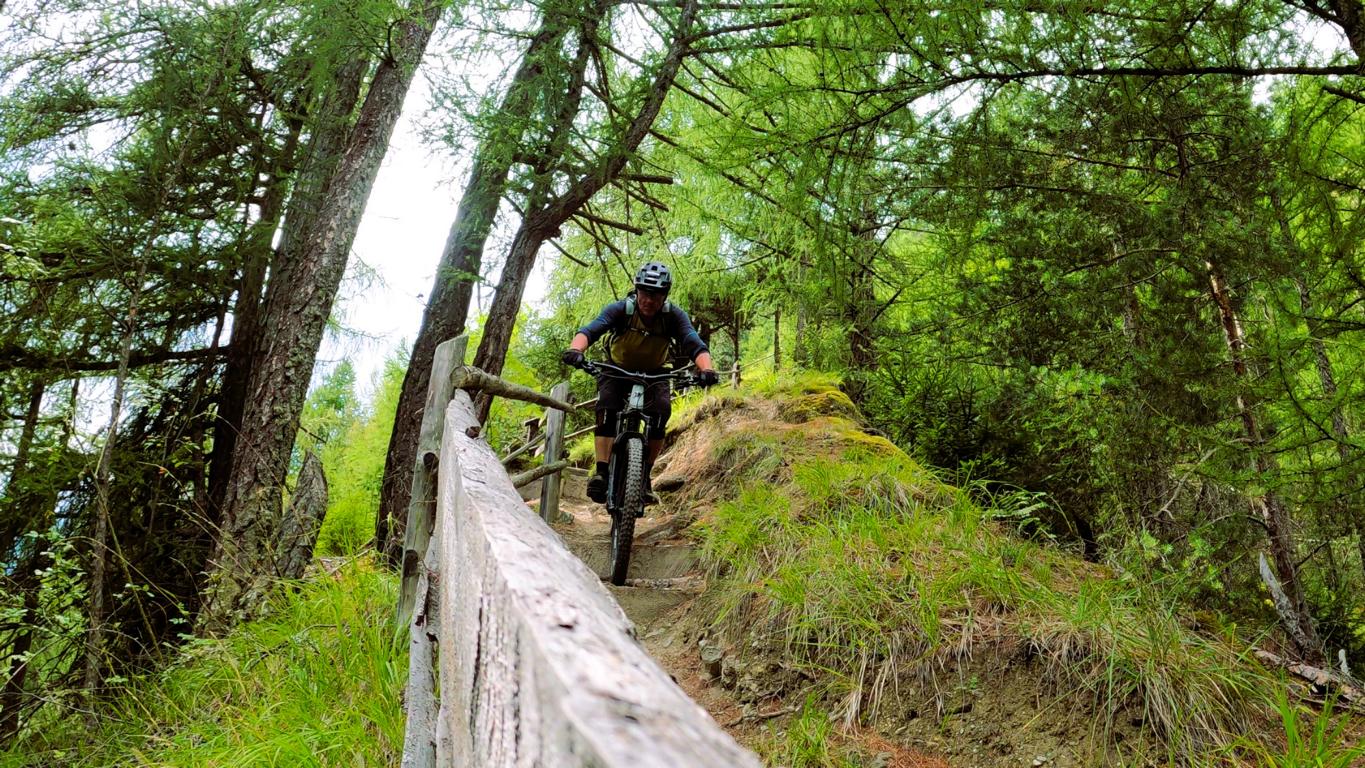 Nach der Schlüsselstelle geht es auf den Agumser Bergwaalweg, wo der Charakter des Trails noch einmal wechselt. Über den Waatrail führt der Weg abwechslungsreich über Wurzeln, Felsstufen und mehrere Holzbrücken mit engen Geländern. Der technische Anspruch liegt hier bei S2, mit immer wieder eingestreuten S3-Stellen, die das Fahrgefühl frisch und spannend halten.