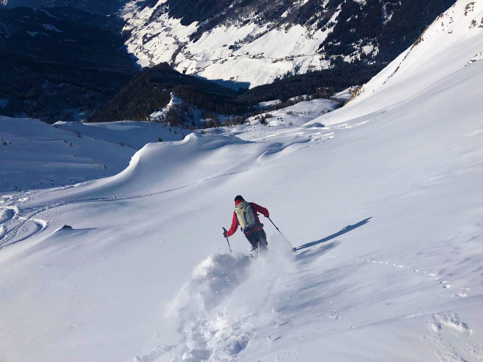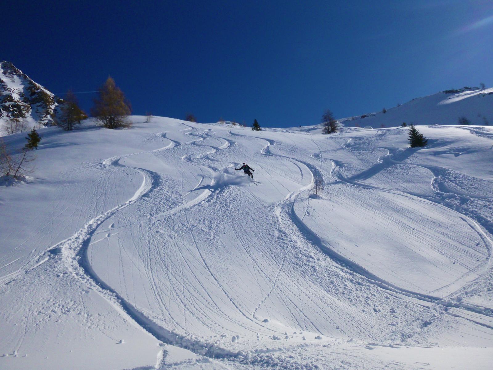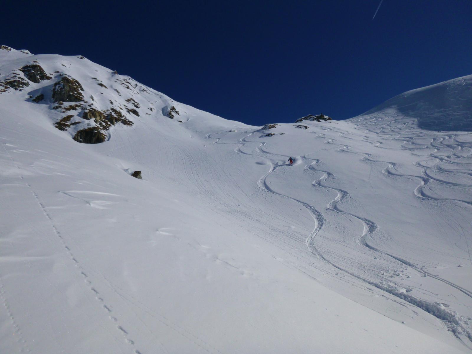 Abfaht über wunderschönes Skigelände nach Norden zur Stöcklalm bei ca. 25 cm Pulverschnee vom feinsten.