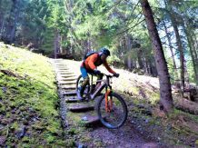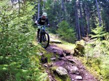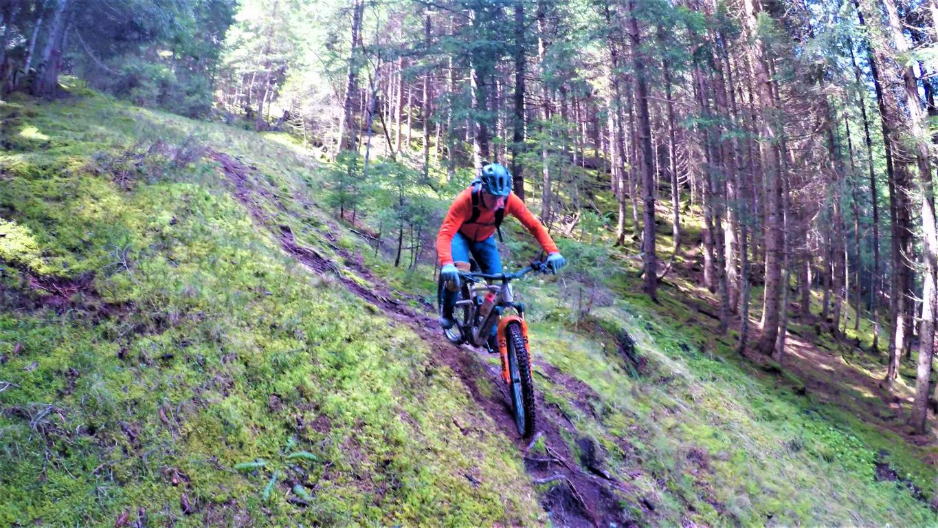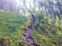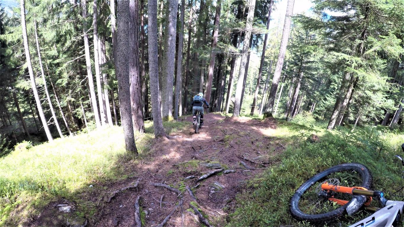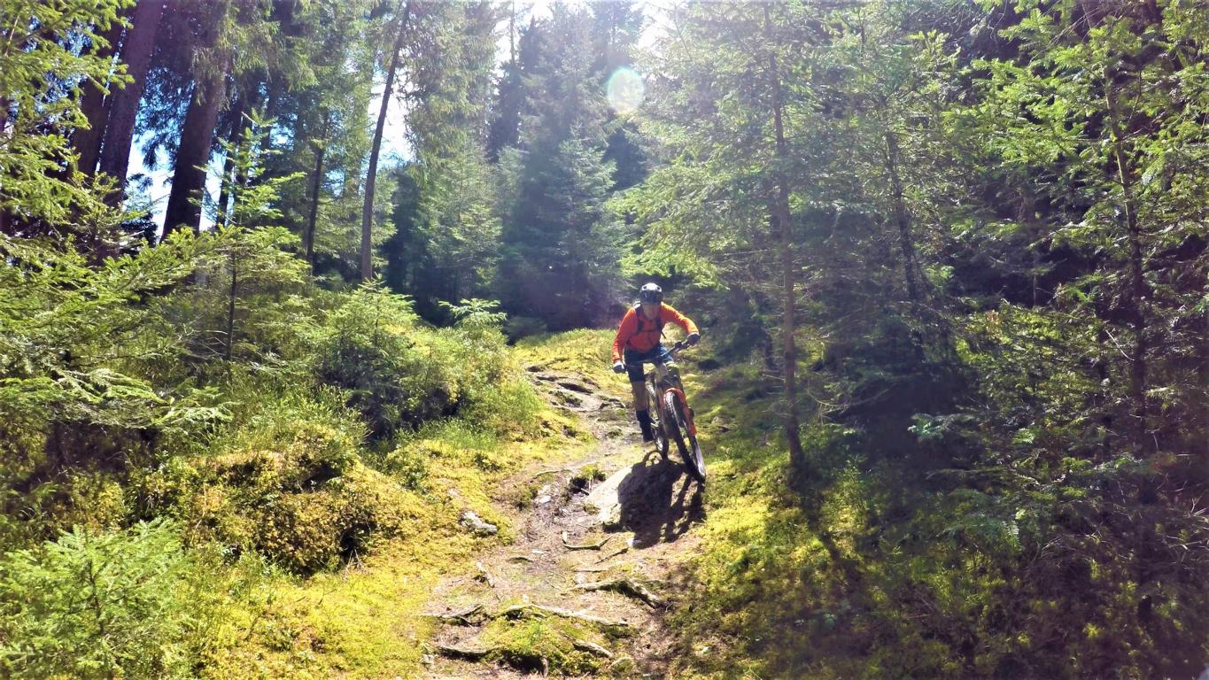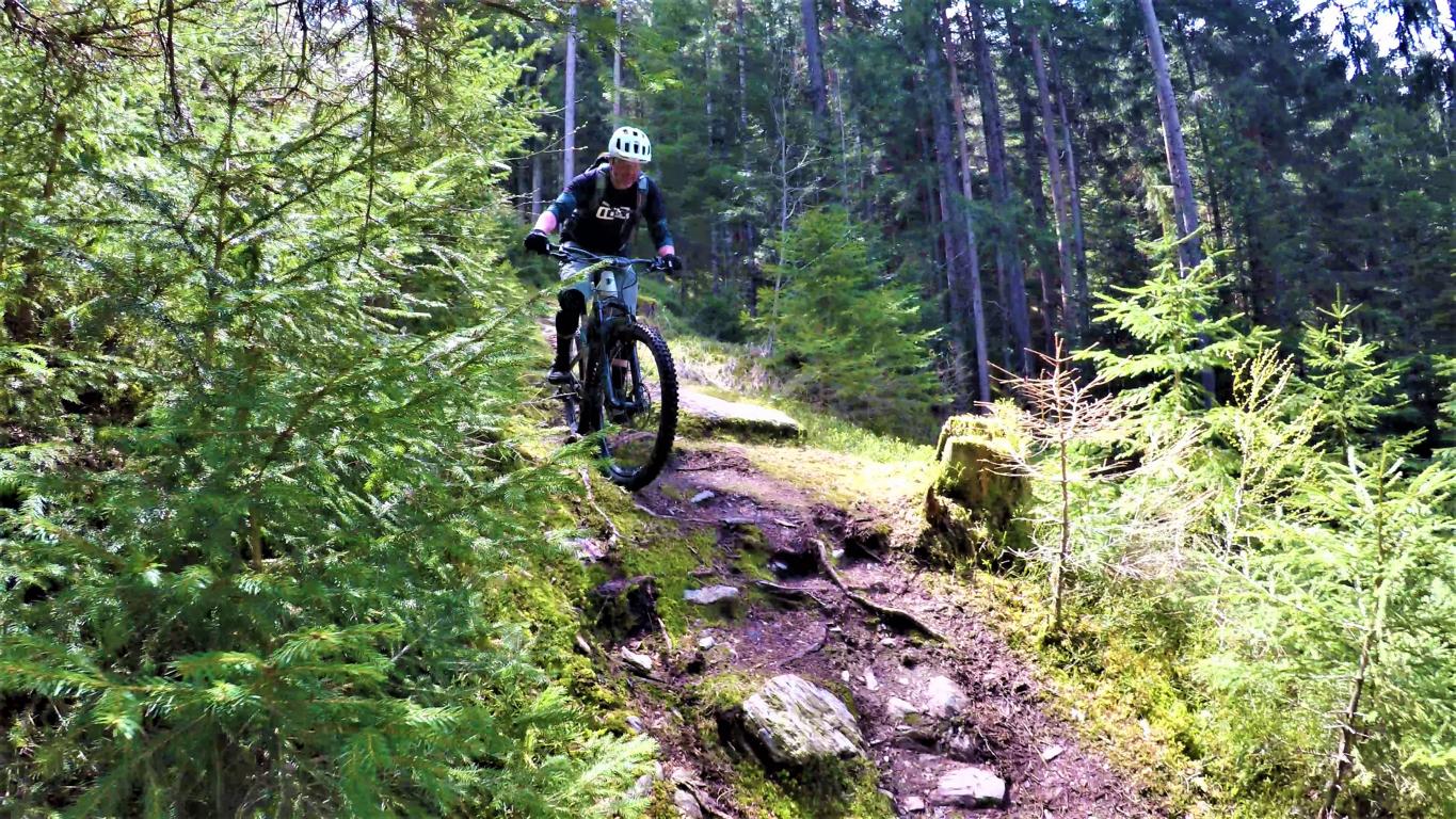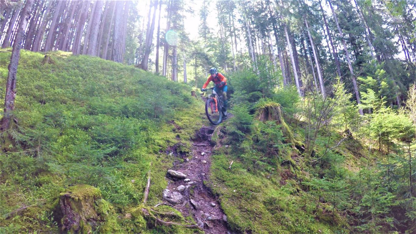 Der 4er Trail führt durchgehend auf wurzeligem Waldboden im Schwierigkeitsgrad S2 mit mehreren S3 Stellen und zwei S4 Passgagen hinunter nach Kaltenbach.
