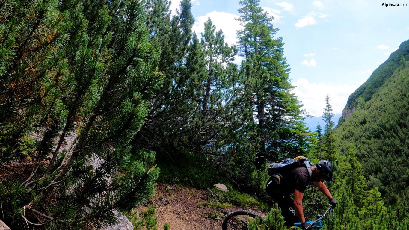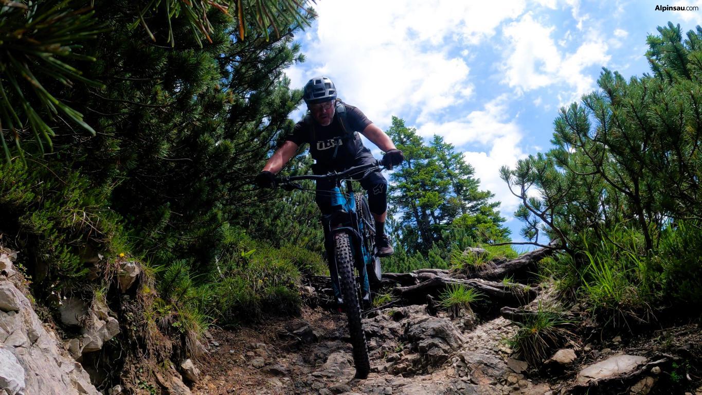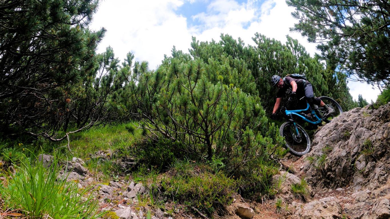 Nach dem Übergang beim Schartlehnerhaus ändert sich der Charakter des Trails deutlich. Der Boden wird griffiger, Waldboden dominiert das Bild – durchsetzt mit Fels- und Wurzelstufen, teils eng gesteckten Spitzkehren und einer natürlichen Linienführung, die Flow und Technik vereint. Die Schlüsselstelle ist eine S4/S5-Passage, die mit viel Fahrtechnik (oder kurzem Absteigen) zu meistern ist. Der Rest des Abschnitts bewegt sich größtenteils im Bereich S2+ mit vielen S3-Spitzkehren.