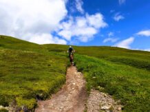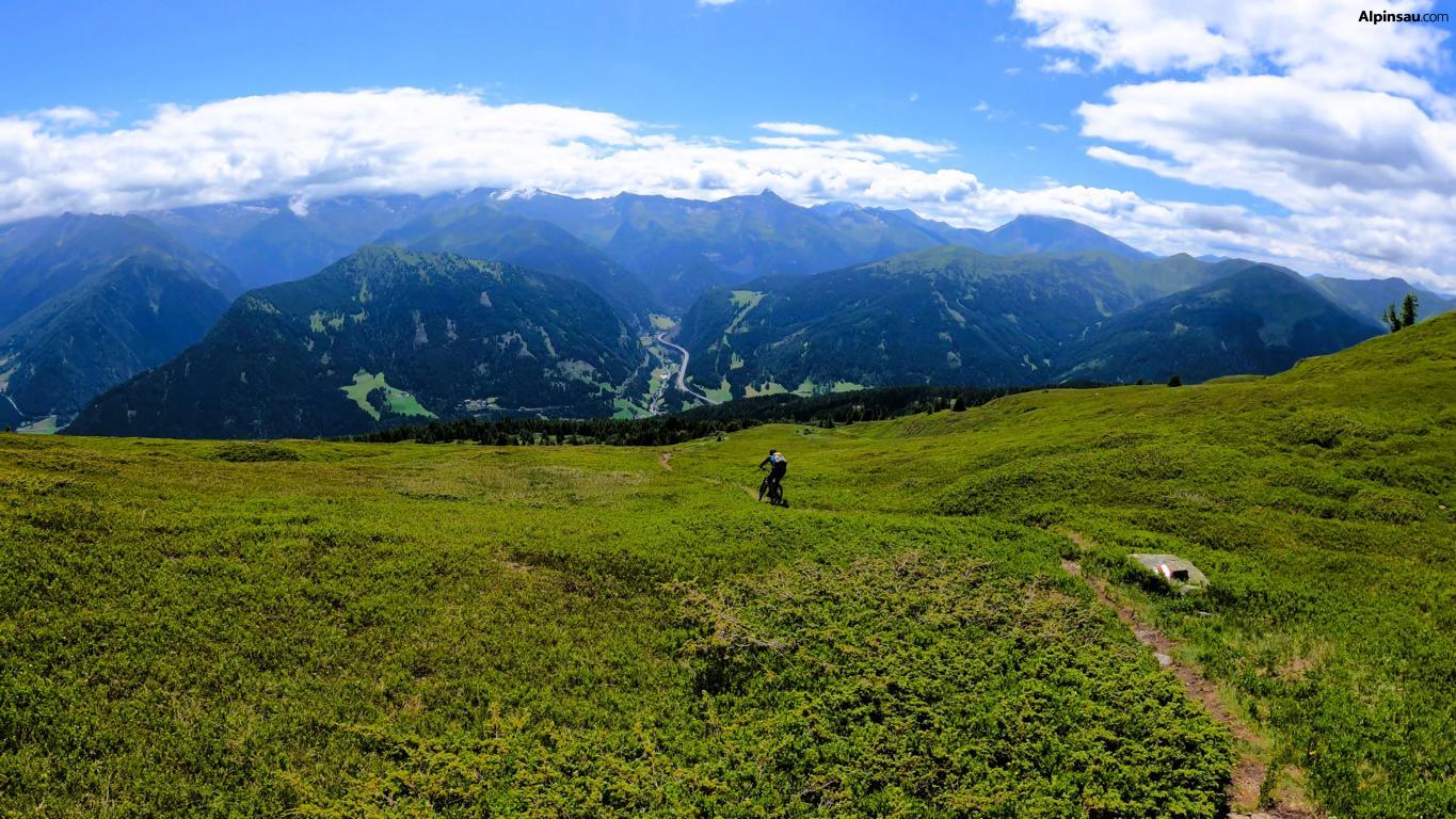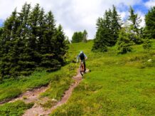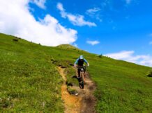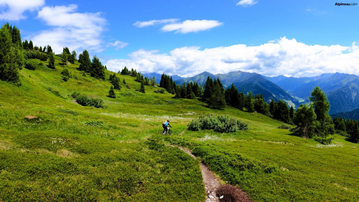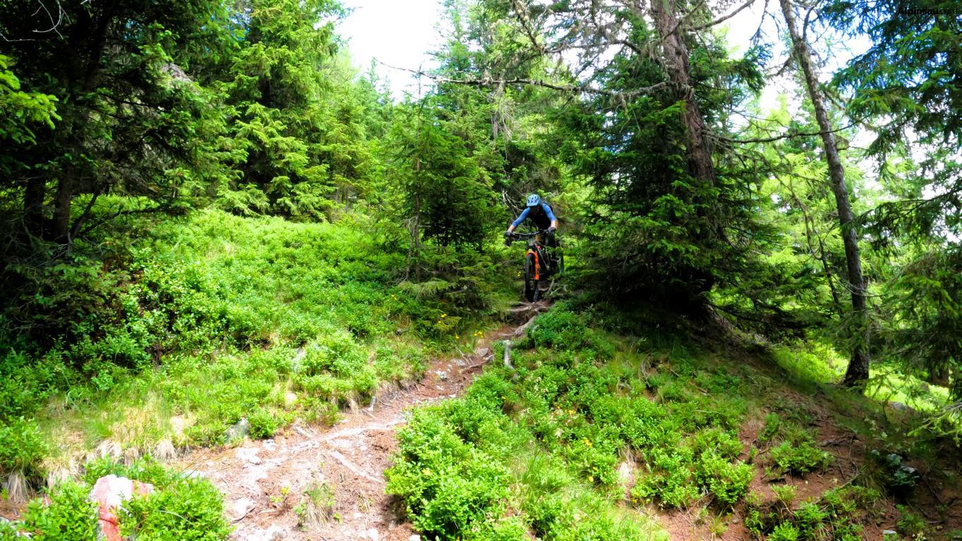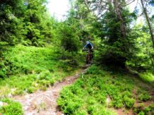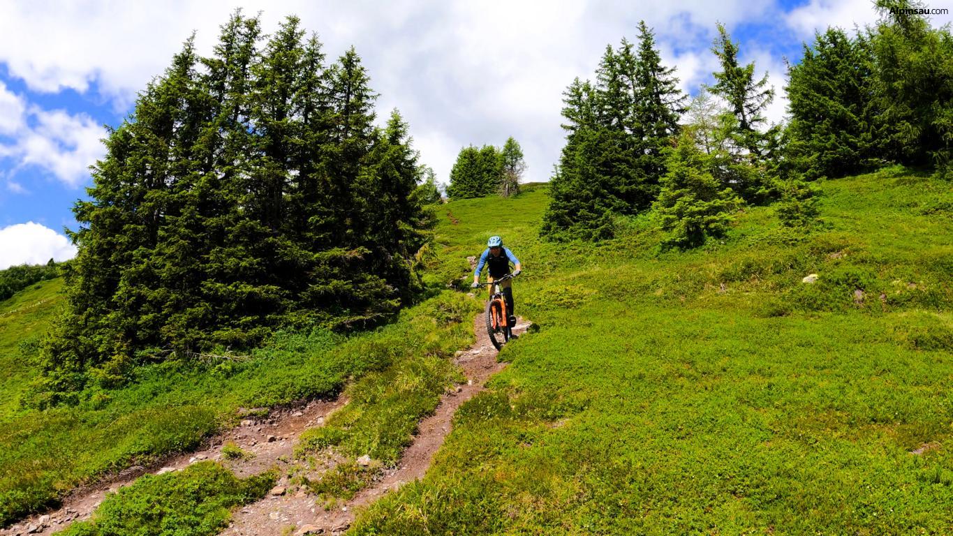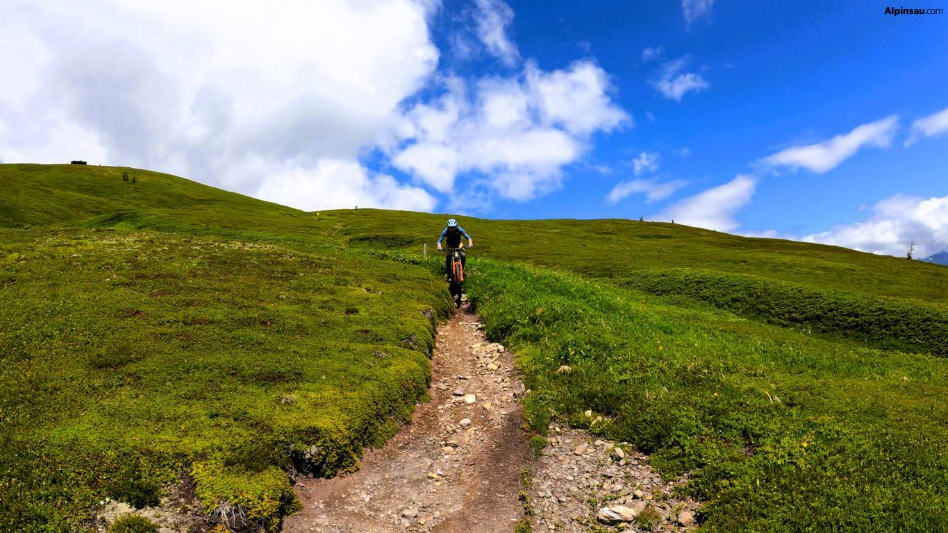 40er-Trail: Technischer Trailspaß mit Panorama. Für Trail-Enthusiasten mit guter Fahrtechnik und Vorliebe für alpines Gelände. Über wechselnden Untergrund aus festem Boden, Schotter und Fels geht es in teils technischem Gelände talwärts.