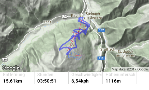 Von Steinach über die Vallmeritzalm hinauf mit Schiebestrecke ca. 250Hm aufs Nösslachjoch. Sehr schöner Singletrail, die ersten 500 Hm vom Nösslachjoch über die Hütte hinunter sind mit dem Schwierigkeitsgrad S2 zu bewerten. Der Rest weiter bis nach Steinach mit S1.