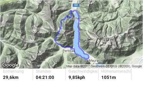 Von Buchau nach Achenkirch über die Seekaralm zur Pasillalm mit kurzer Tragestrecke bis zum Sattel. Trailabfahrt zur Pletzachalm mit vielen Spitzkehren im Schwierigkeitsgrad S2 mit S3 Passagen. Weiter gehts auf den schönen, super flowigen Seebergtrail-S1 nach Pertisau und zurück nach Buchau.