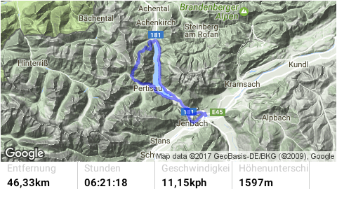 Auffahrt von Wiesing nach Eben von dort nach Achenkirch über die Seekaralm zur Pasillalm mit kurzer Tragestrecke bis zum Sattel. Trailabfahrt zur Pletzachalm mit vielen Spitzkehren im Schwierigkeitsgrad S2 mit S3 Passagen. Weiter gehts auf den schönen, super flowigem Seebergtrail-S1 nach Pertisau und zurück nach Eben. Von dort über den Notburgatrail-S1/S2 hinunter nach Jenbach und nach Wiesing zurück.