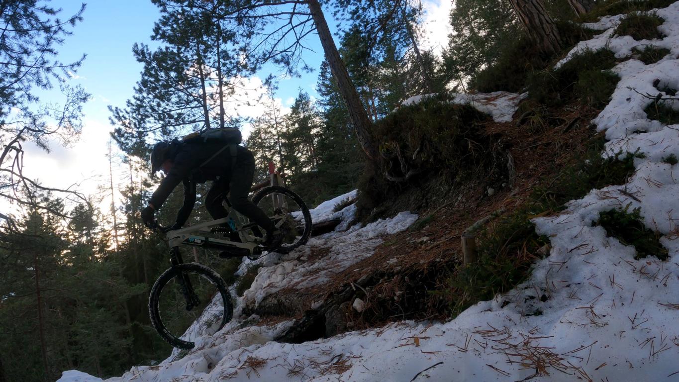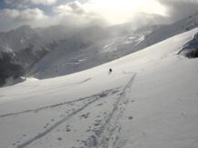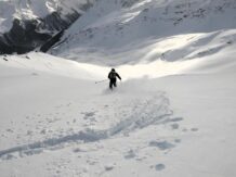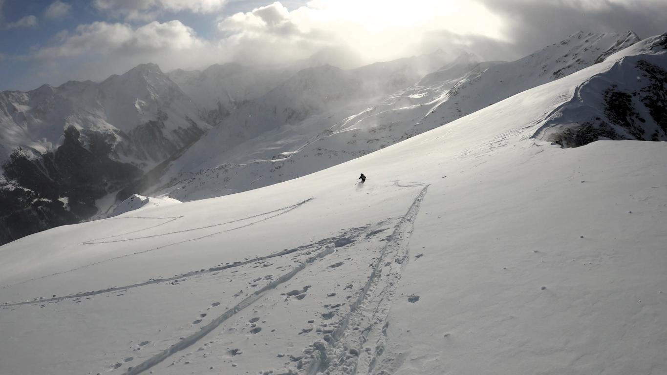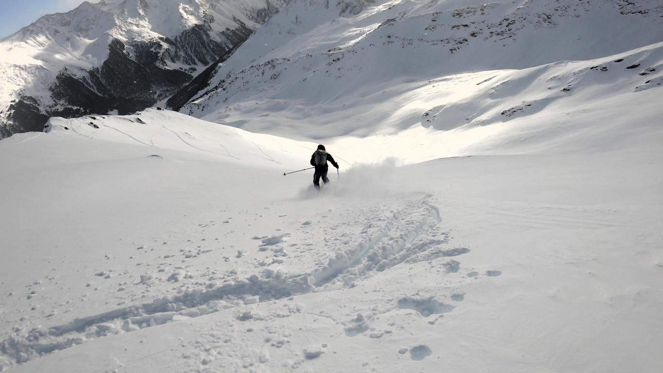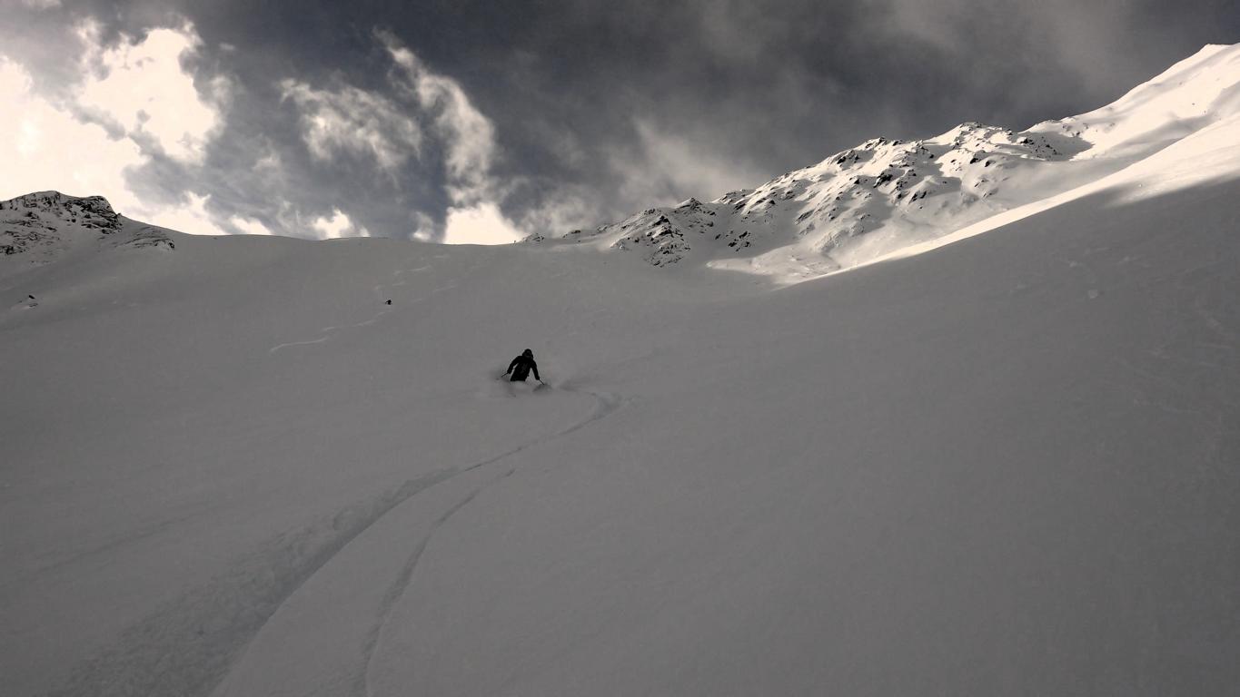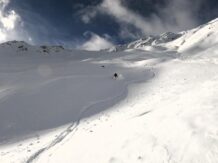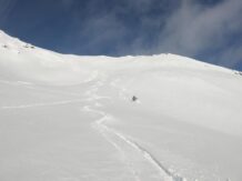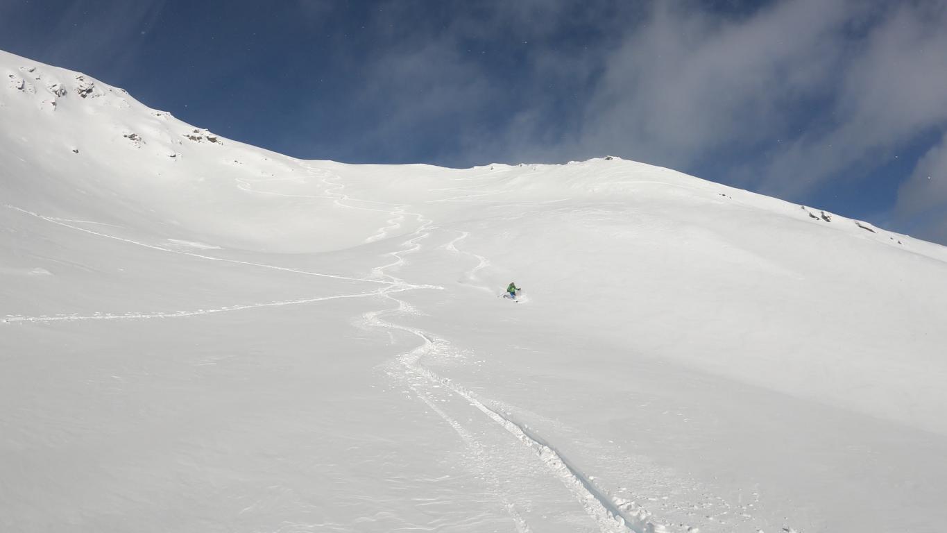 Gute Bedingungen vom Gipfel Richtung Südosten in die weiten Mulden zur Praxmarer Alm bei ca. 15 cm Pulver.