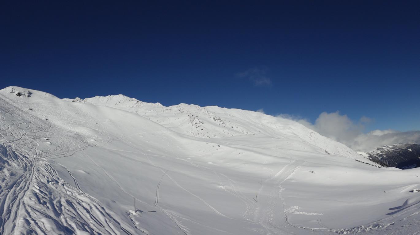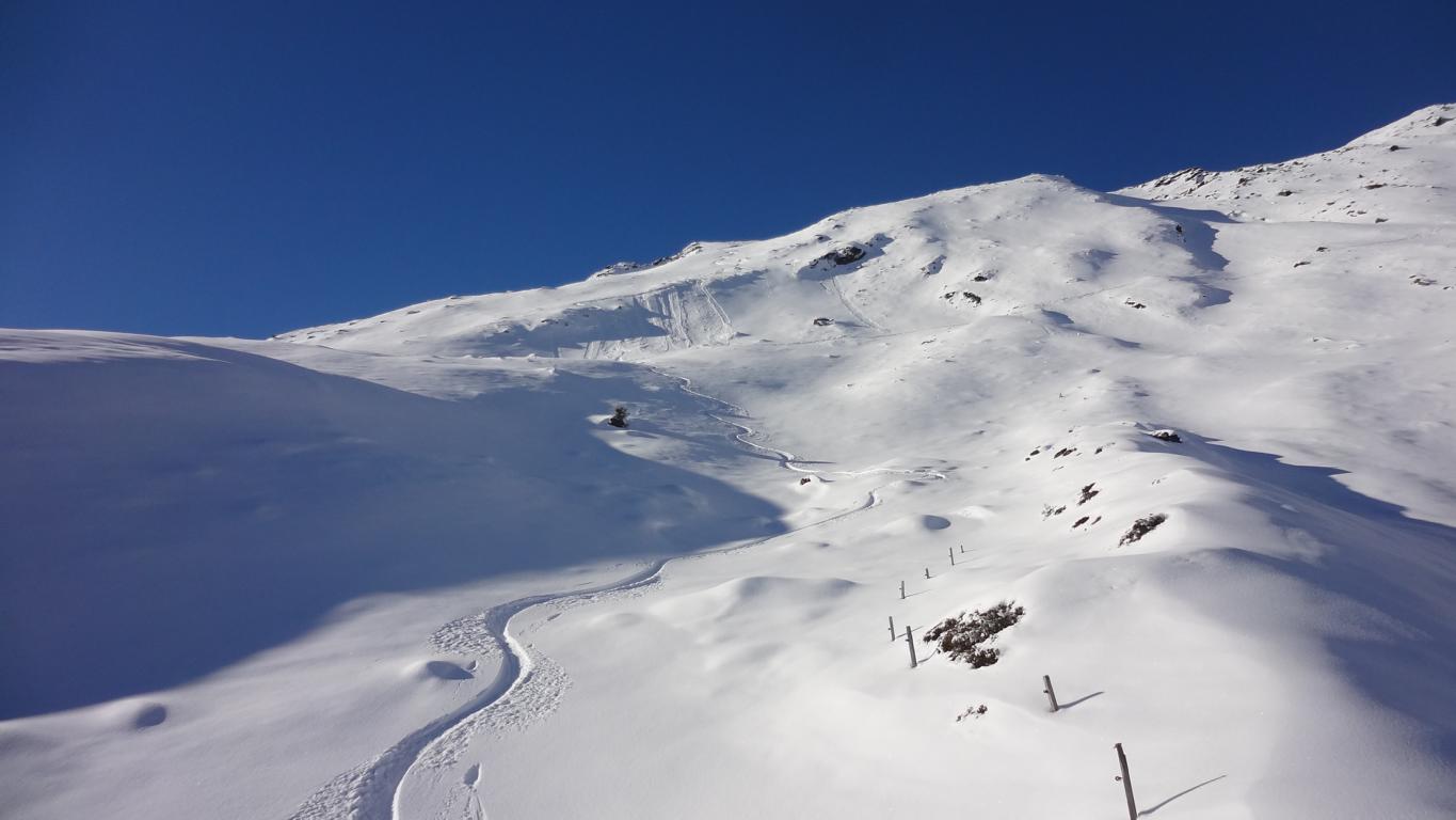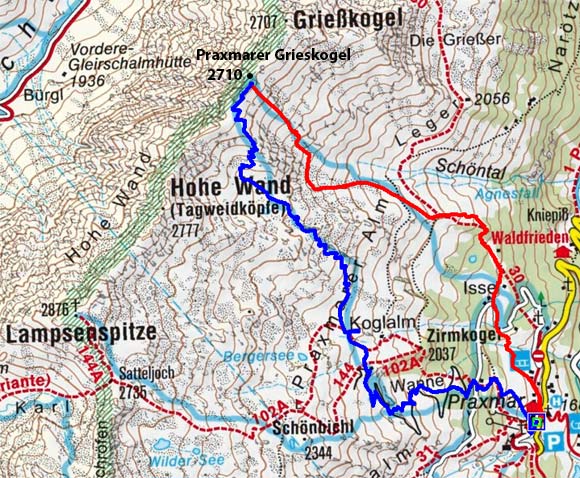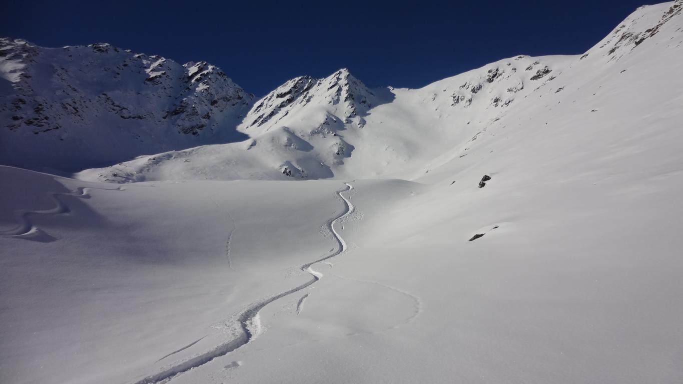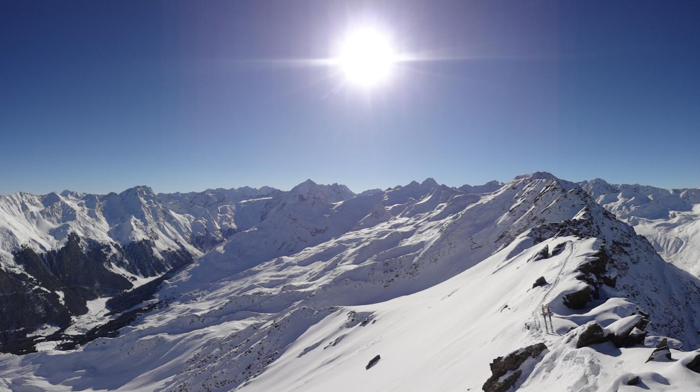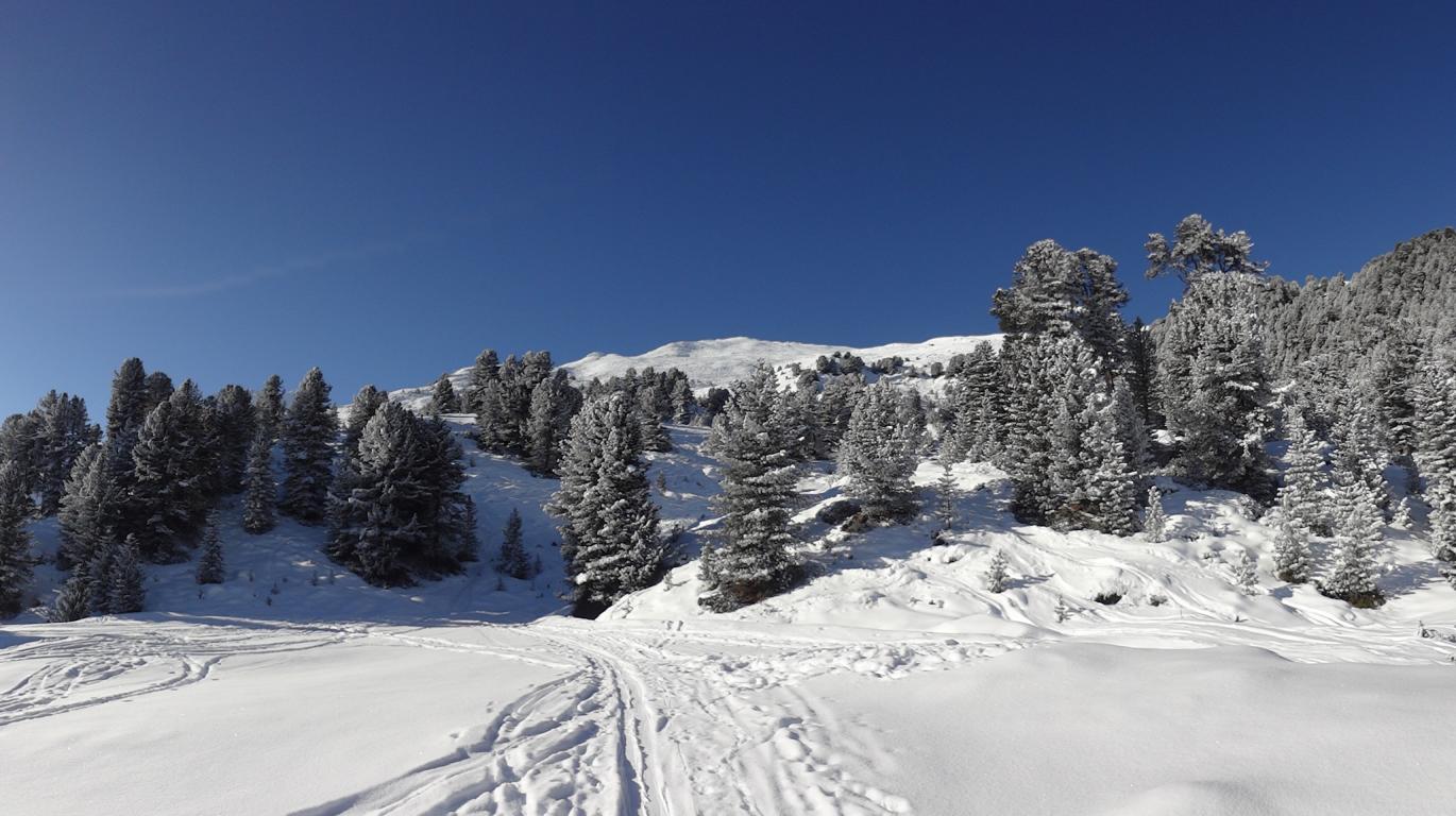 Vom Parkplatz zur Kogelhütte auf den Zirmkogel. An der Hütte vorbei Richtung Nordwesten ansteigend nach Schöneben und über eine schmale felsdurchsetzte Geländerampe ins Praxmarer Kuhgrübl. In Spitzkehren den steilen Südhang hinauf und weiter über den Grat zum Gipfel (kein Kreuz). Leider musste ich die Abfahrt über die sehr steile SO-Flanke vom Gipfel links liegen lassen, die Verhältnisse waren heute zu unsicher. Die Abfahrt, zuerst über die Aufstiegsspur zurück dann weiter über den Niederleger, bei 10 bis 15 cm Neuschnee war die Abfahrt gut bis sehr gut. Vorsicht auf Steine, immer noch zu wenig Schnee!