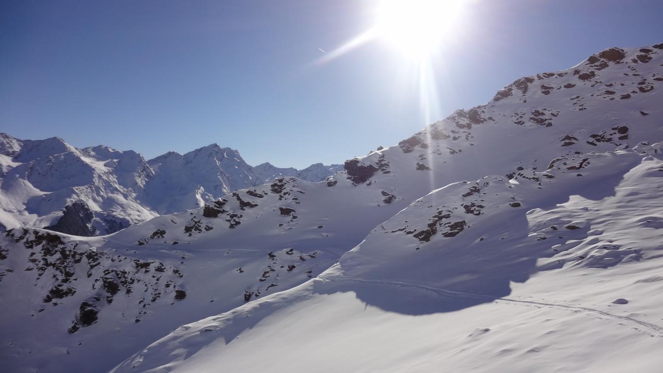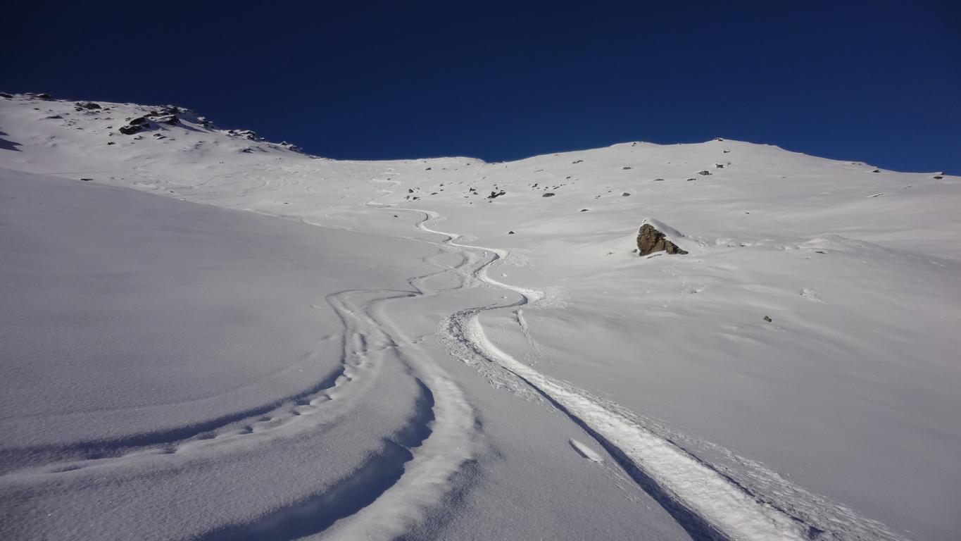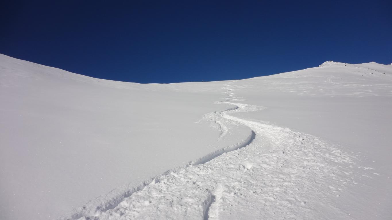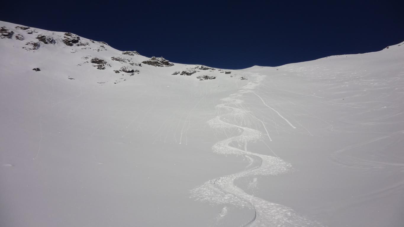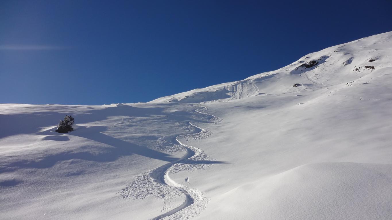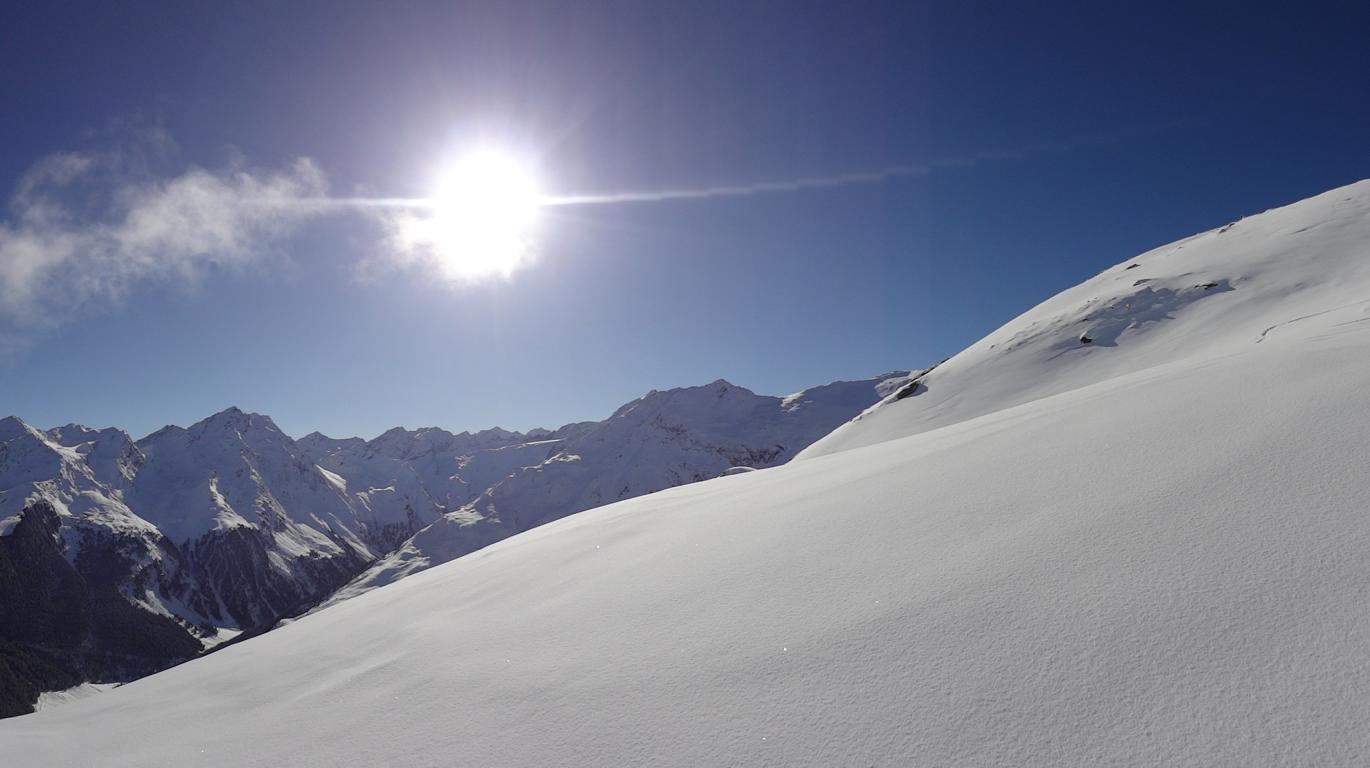 Vom Parkplatz zur Kogelhütte auf den Zirmkogel. An der Hütte vorbei Richtung Nordwesten ansteigend nach Schöneben und über eine schmale felsdurchsetzte Geländerampe ins Praxmarer Kuhgrübl. In Spitzkehren den steilen Südhang hinauf und weiter über den Grat zum Gipfel (kein Kreuz). Leider musste ich die Abfahrt über die sehr steile SO-Flanke vom Gipfel links liegen lassen, die Verhältnisse waren heute zu unsicher. Die Abfahrt, zuerst über die Aufstiegsspur zurück dann weiter über den Niederleger, bei 10 bis 15 cm Neuschnee war die Abfahrt gut bis sehr gut. Vorsicht auf Steine, immer noch zu wenig Schnee!