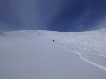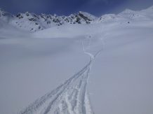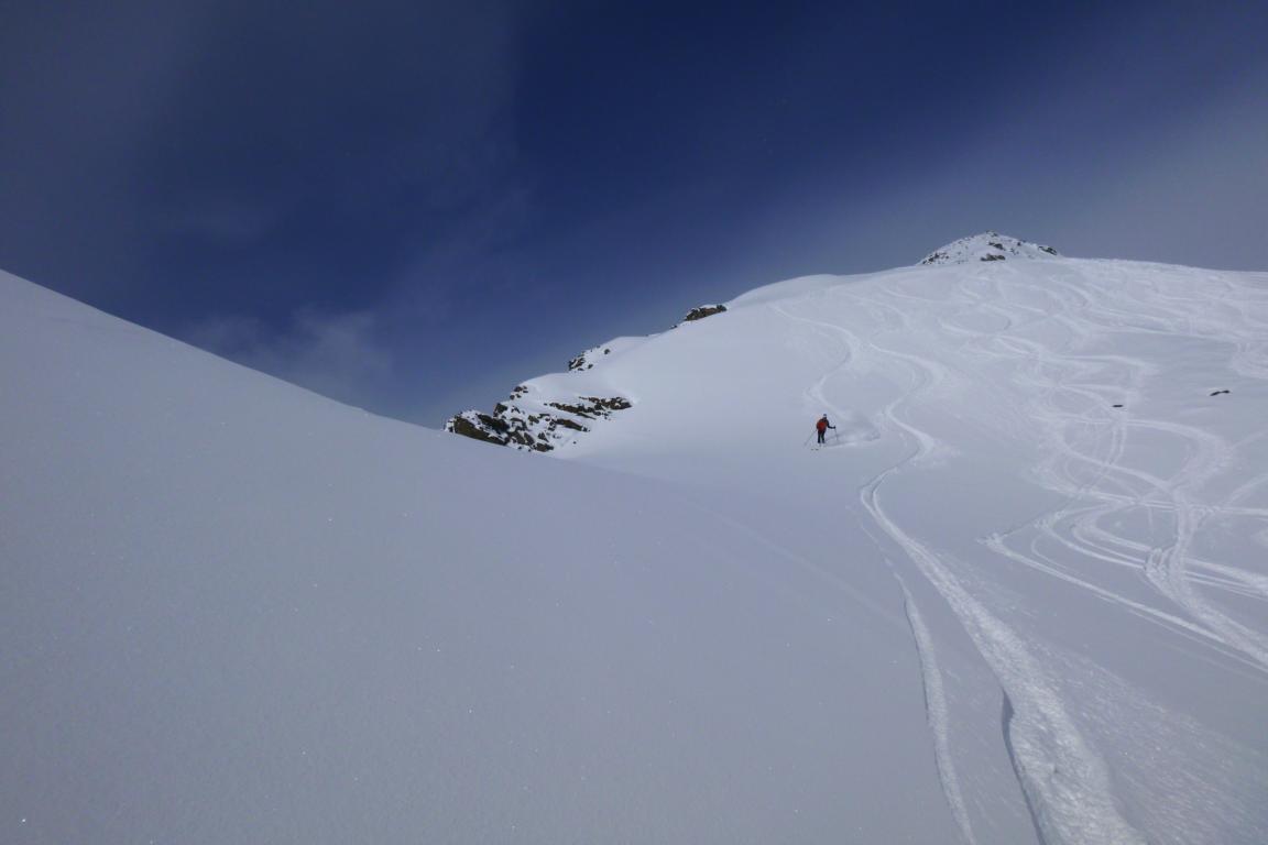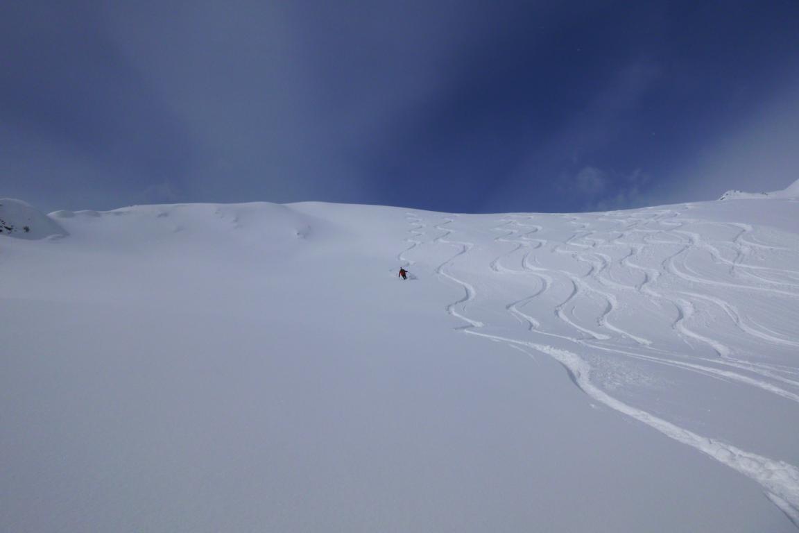 Vom Joch super Pulver, ca. 30 cm, auf sehr guter Unterlage. Ab ca. 1900 m wird der Schnee aufgrund der zunehmenden Temperaturen schon etwas schwerer.