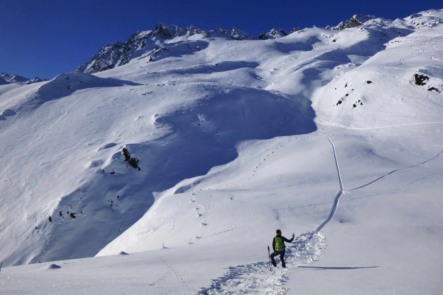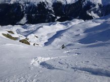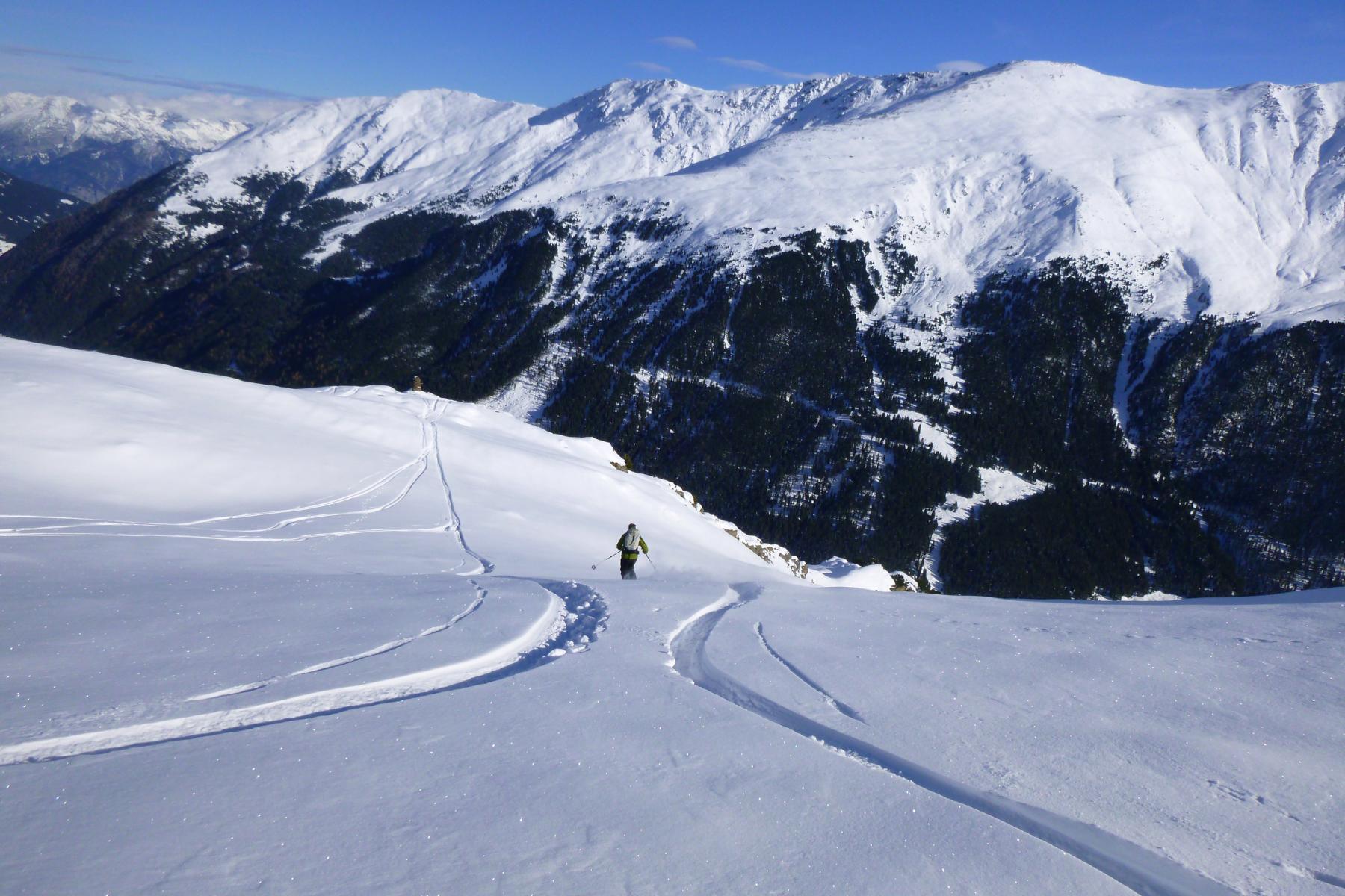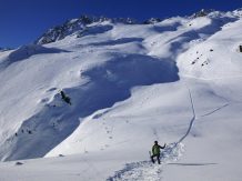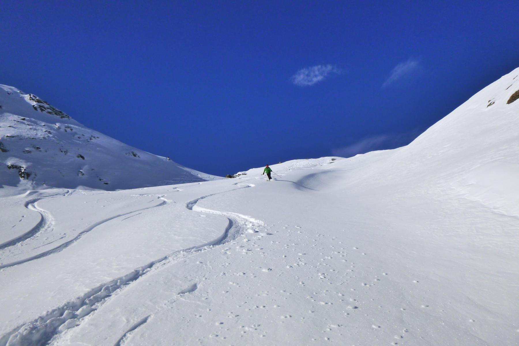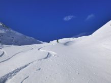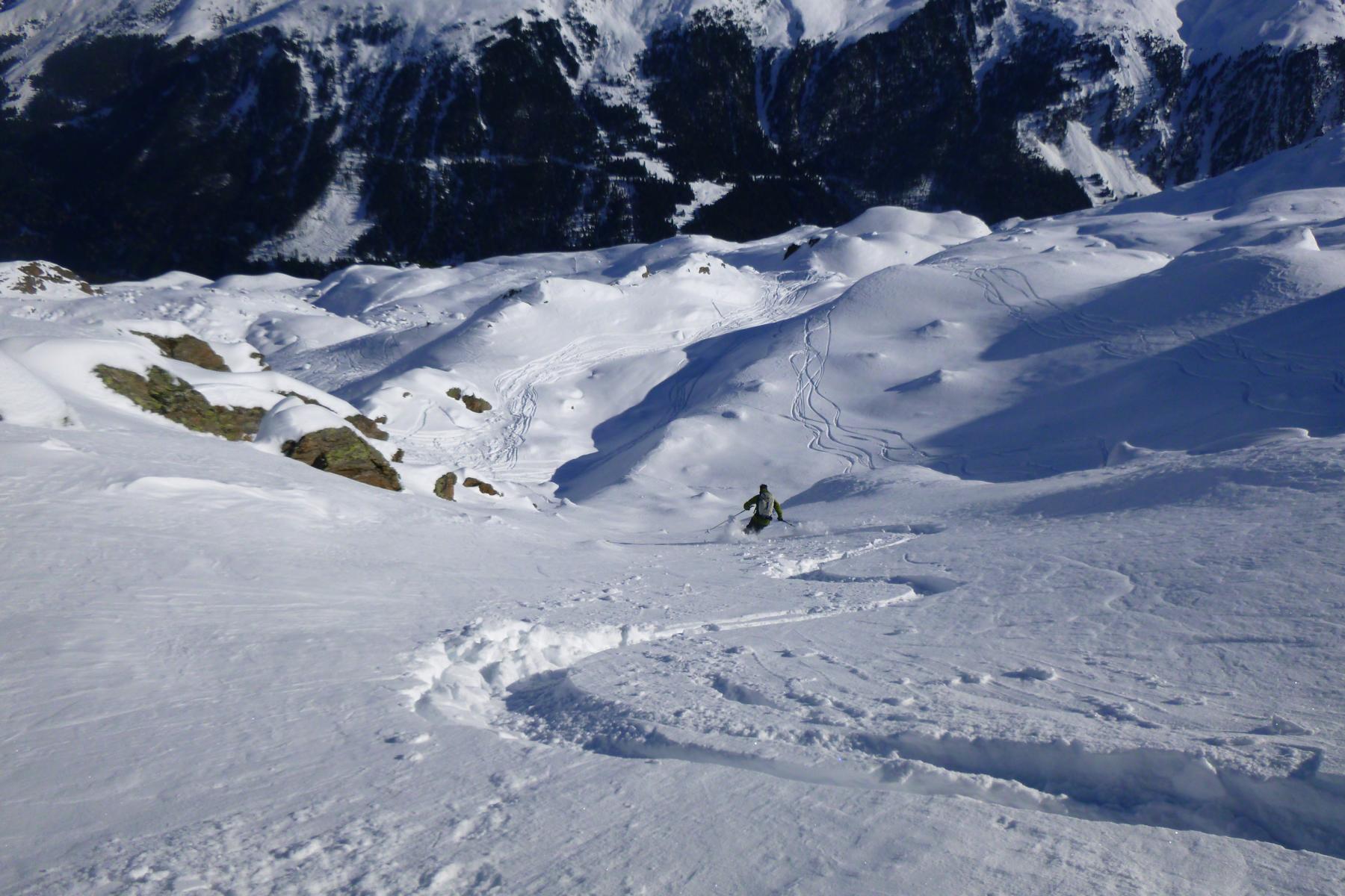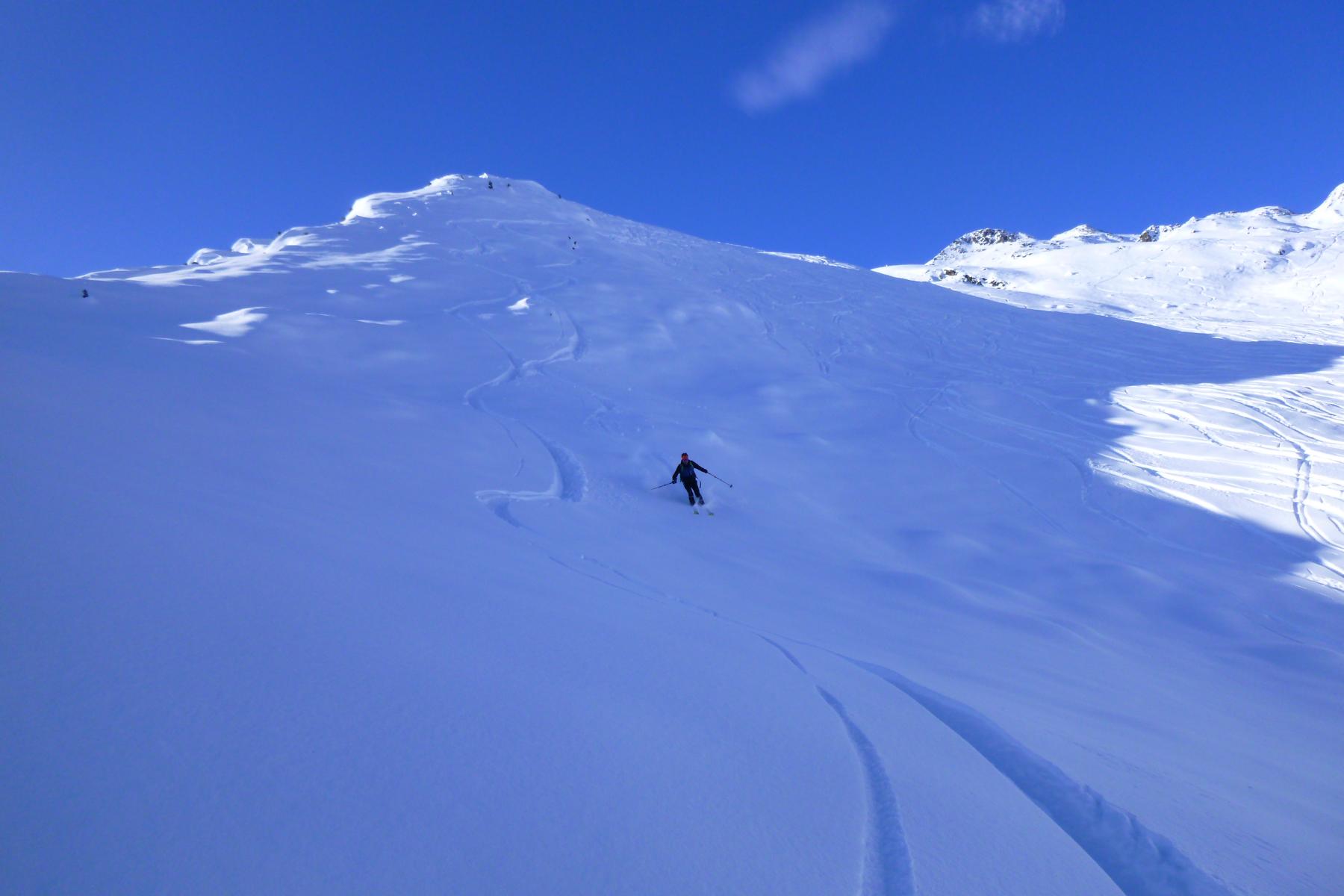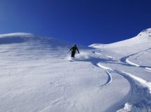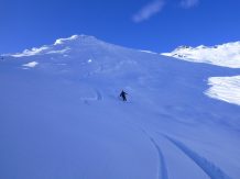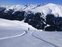 Vom Joch super Pulver, ca. 20 bis 30 cm, auf sehr guter Unterlage. Ab ca. 1900 m wird der Schnee aufgrund der zunehmenden Temperaturen schon etwas schwerer.