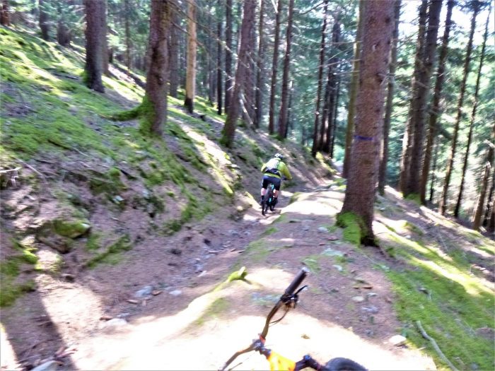 | Von der Saxeralm über den 3,6er Trail-S0 zum Braunhof und von dort über den flowigen 2er Trail-S1 auf festem Untergrund mit kleineren Wurzelstufen hinunter nach Flains. |
