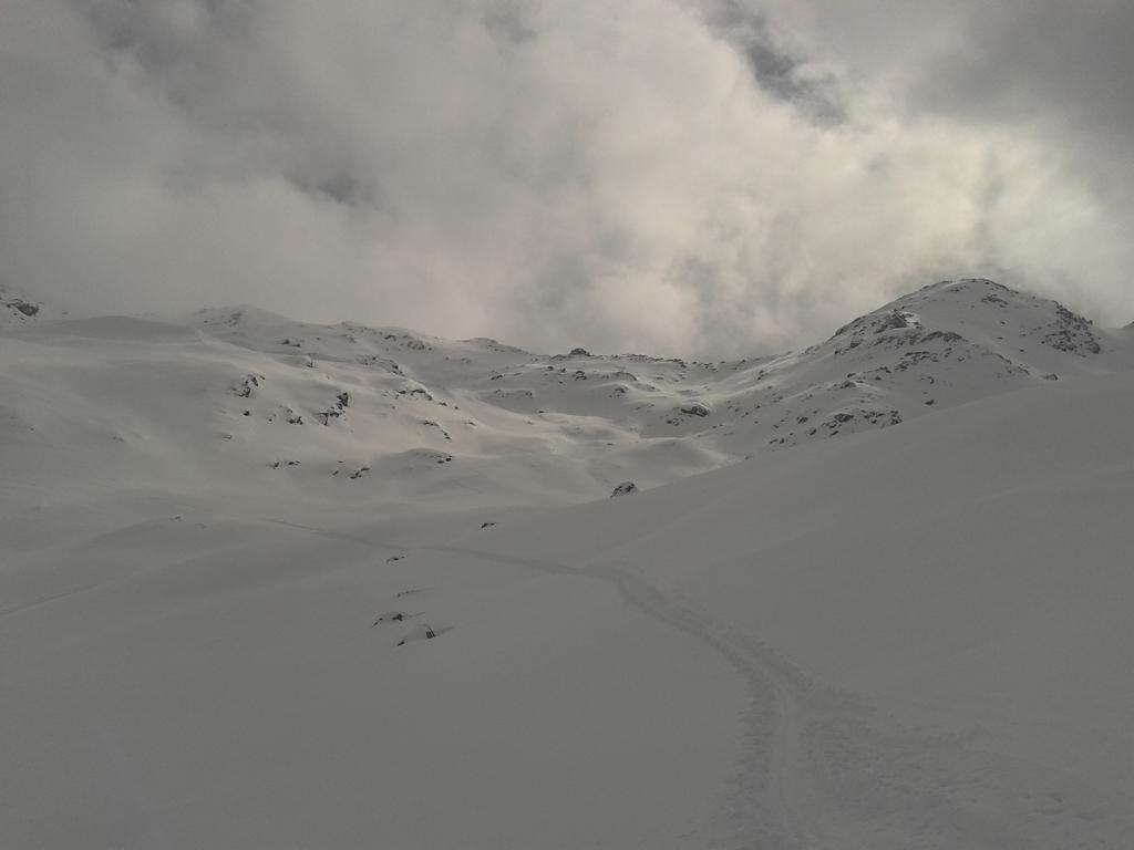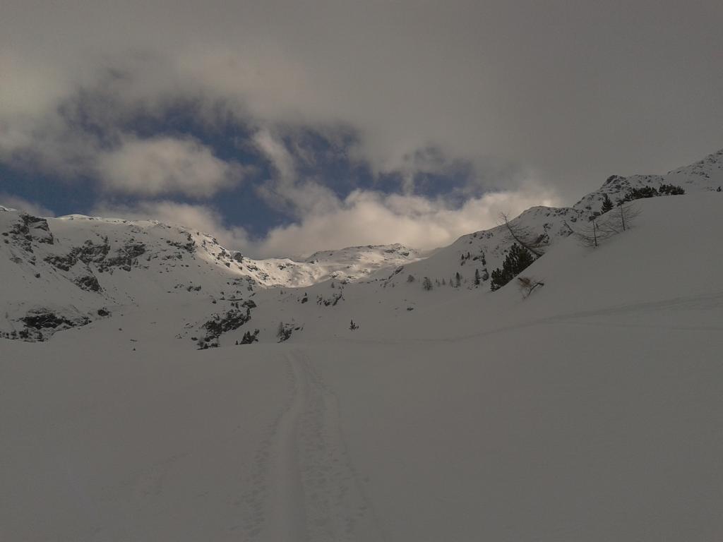 Oben ca. 20 cm Neuschnee und pulvrig, nur wenig verspurt. Die Sicht war anfangs noch gut, es zog um ca. 13 Uhr zu. Vom Kraftwerk über den Forstweg hinunter bis zum Hinterlarcher Hof, noch ausreichende Schneelage.