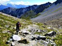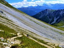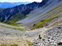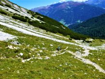 Die Abfahrt vom Jöchl führt auf schottrigem und z. T. auf verblockten Untergrund abwechselnd im Schwierigkeitsgrad S2-S3 hinunter in die Matreier Grube.