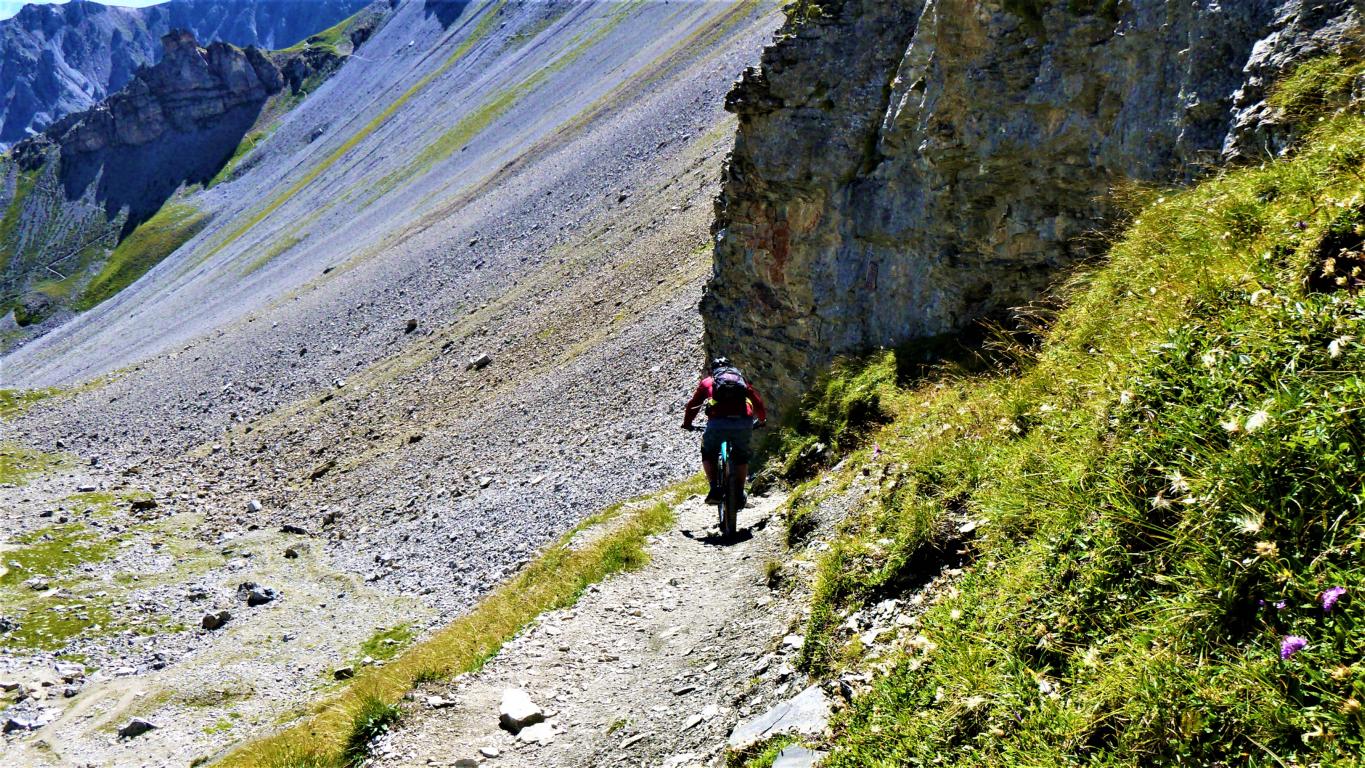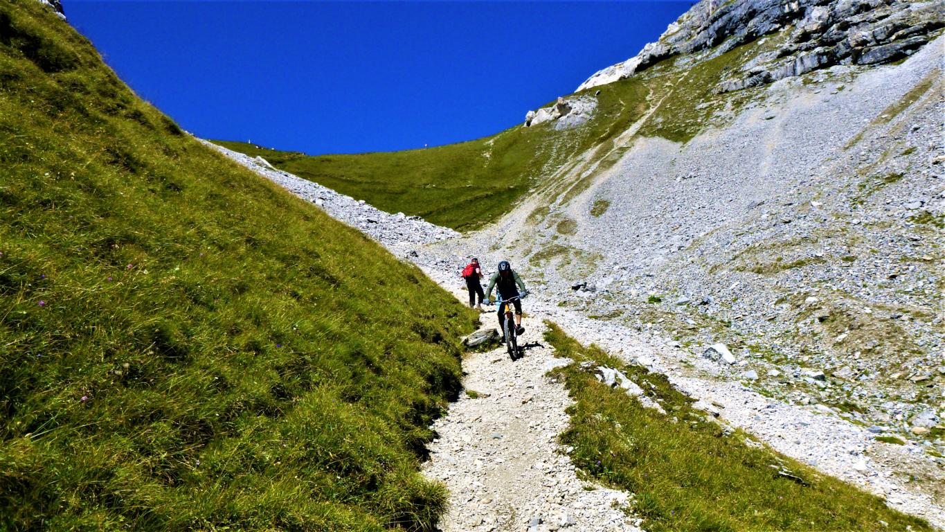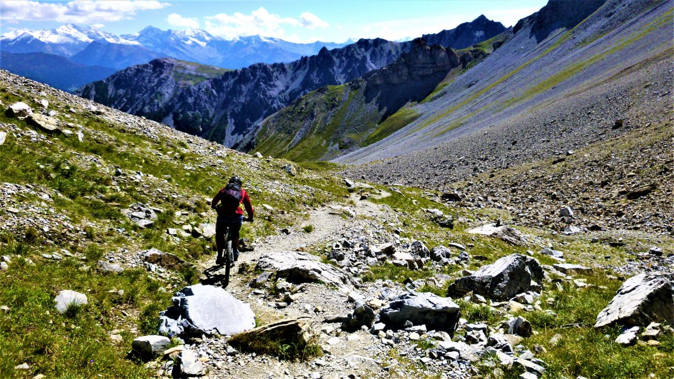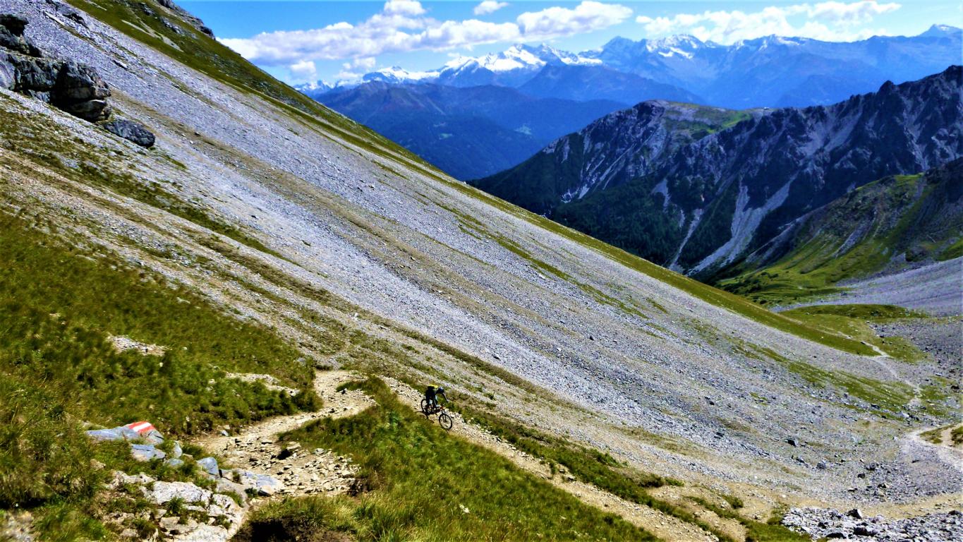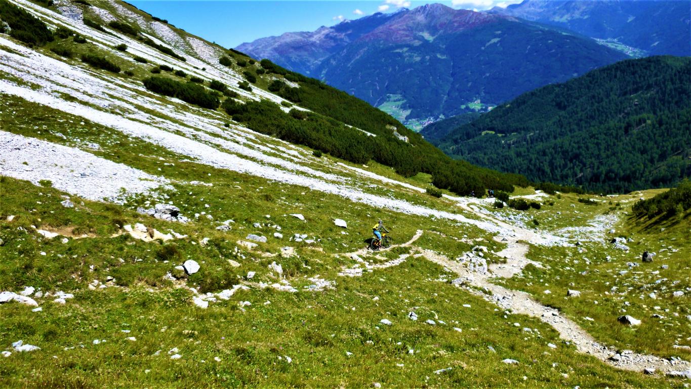 Die Abfahrt vom Jöchl führt auf schottrigem und z. T. auf verblockten Untergrund abwechselnd im Schwierigkeitsgrad S2-S3 hinunter in die Matreier Grube.