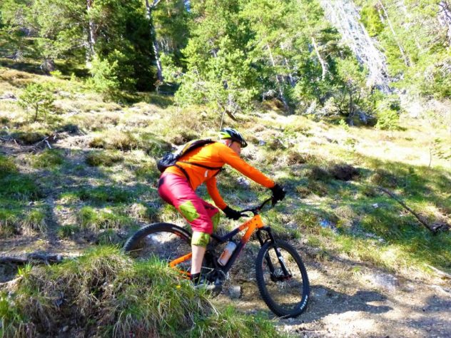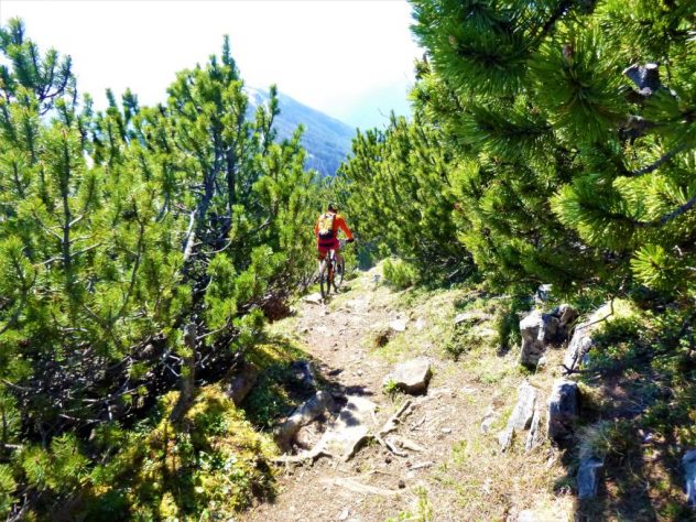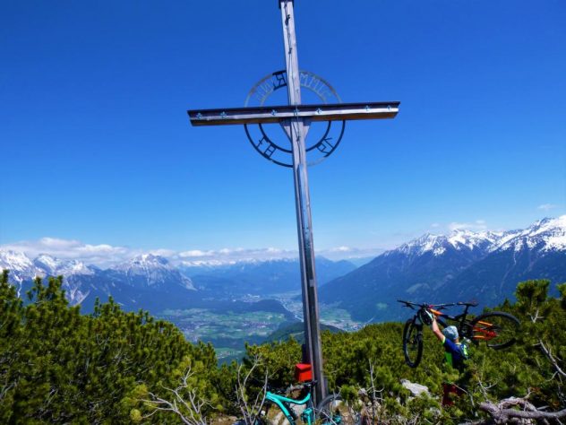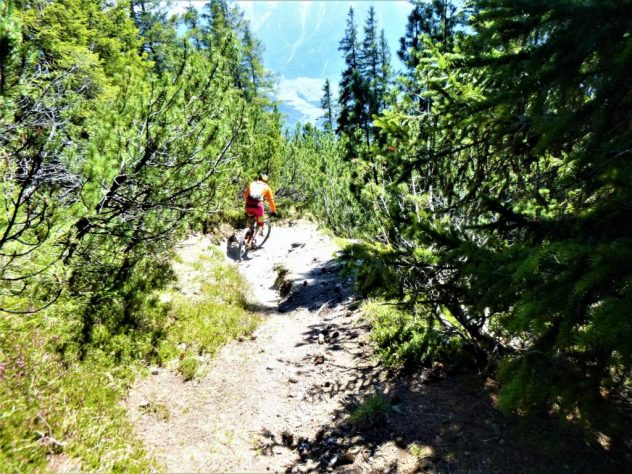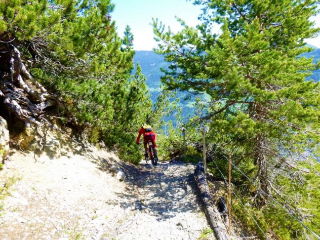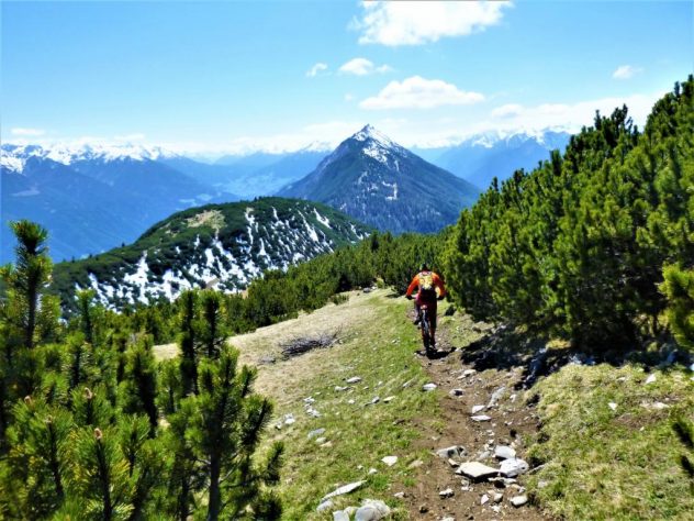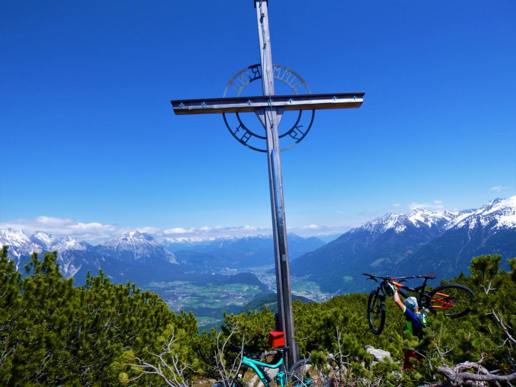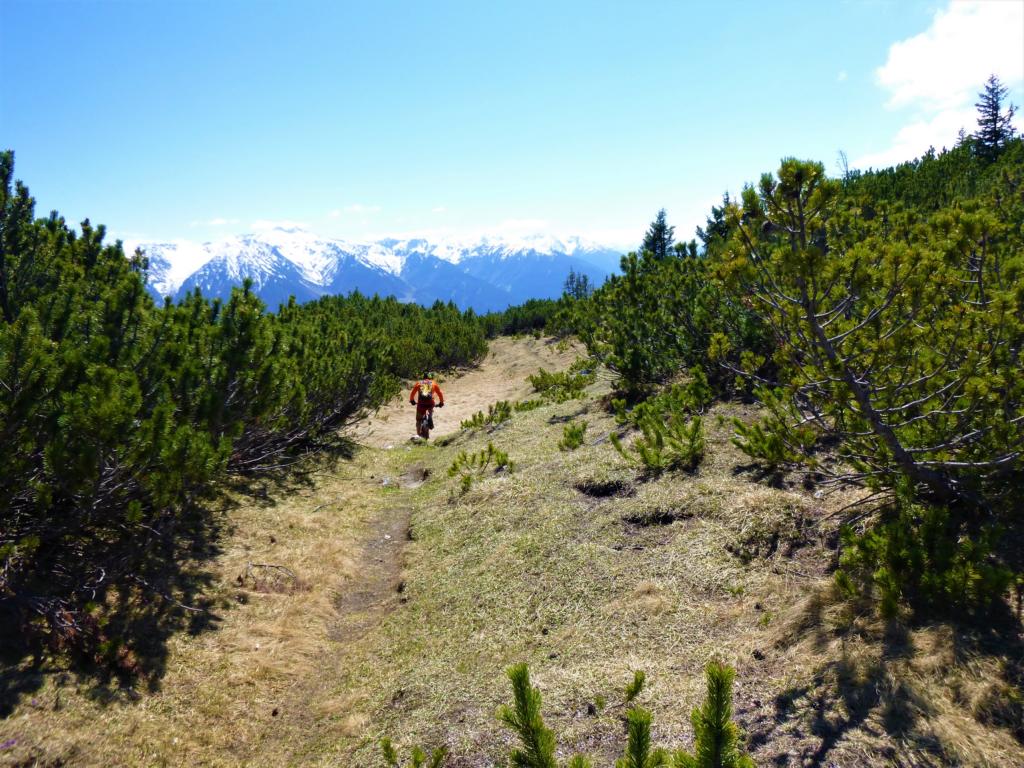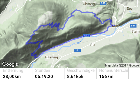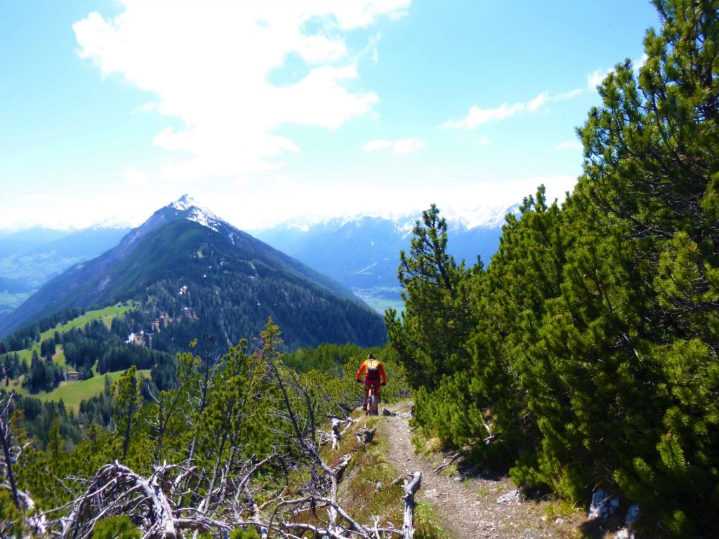 Auffahrt von Mötz über Finsterfiecht auf die Simmeringalm und von dort ca. 300Hm schiebend/tragend auf den Gipfel. Der 8er-Trail vom Simmering mit kurzem Anstieg auf den Zunterkopf bis hinunter zur Kreuzung, kurz vor der Haiminger Alm, ist mit S2 und ein paar Stellen mit S3 zu bewerten. Von dort führt der Trail weiter über die Guggehütte bis zur Schotterreise durchgehend auf verfestigtem Untergrund. 250 Hm oberhalb vom Magerbach beginnt die Schotterreise, die verhältnismäßig flache Reise lassen hohe Geschwindigkeiten zu. Wer nicht Schotterreisen surfen will fährt auf dem Singletrail der in Serpentinen ins Tal führt weiter. Der gesamte Downhill ist mit S2-G2 zu bewerten.