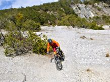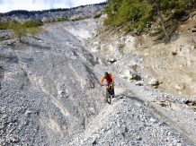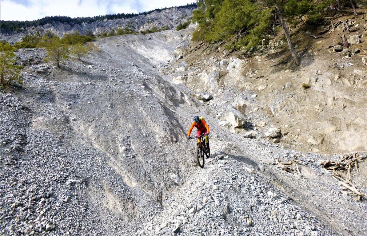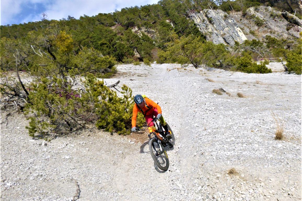 Die Auffahrt von Mötz über Finsterfiecht bis zur Kehre führte zu 50% über Schneefahrbahn wobei fast alles fahrbar war. Der Trail ist so gut wie schneefrei. Die Abfaht von der Kehre bis zur Schotterreise führt durchgehend auf verfestigtem Untergrund. 250 Hm oberhalb vom Magerbach beginnt die Schotterreise. Die verhältnismäßig flache Reise lassen hohe Geschwindigkeiten zu. Wer nicht Schotterreisen surfen will fährt auf dem Singletrail der in Serpentinen ins Tal führt weiter. Der gesamte Downhill ist mit S2-/G2 zu bewerten.