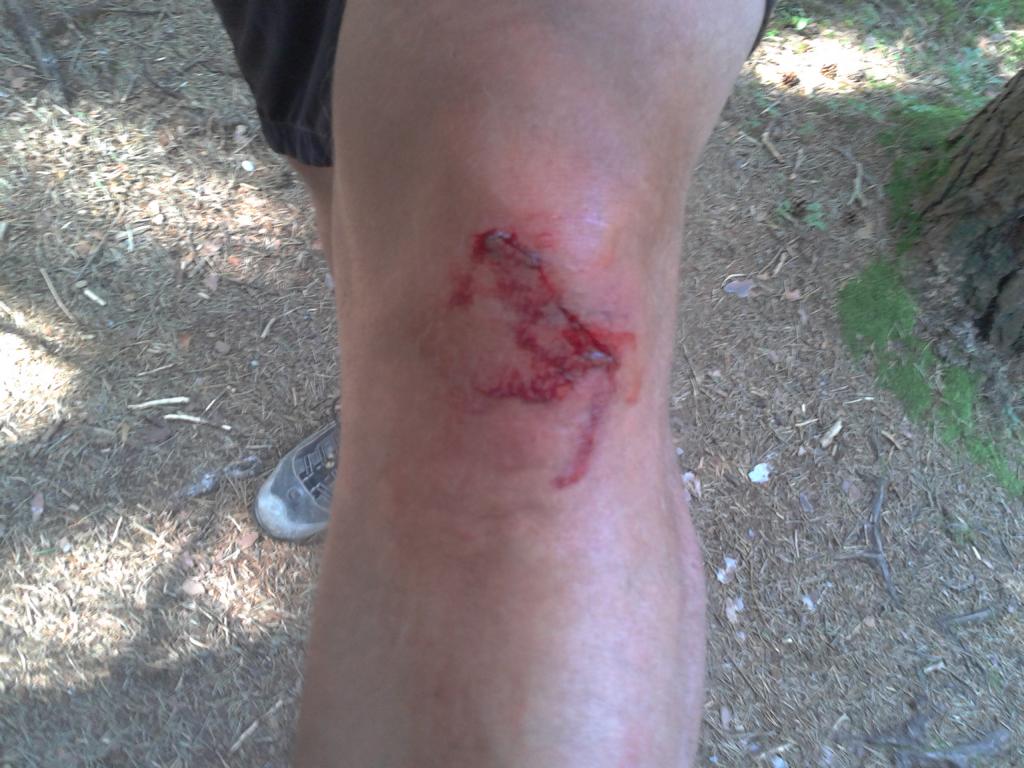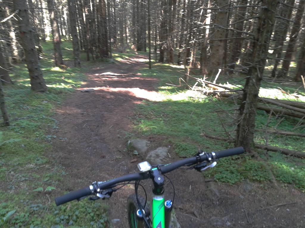 Direkt unterhalb der Alm geht ein schöner Trail runter. Nach ein paar hundert Meter überquert man den Forstweg und gleich gegenüber geht’s weiter in den Wald hinein. Irgendwann kommt wieder der Forstweg, den ein kurzes Stück entlang fahren und dann links rein zum nächsten Trail hinunter nach Sistrans wobei ich wegen einer Wandergruppe nicht die Ideallinie erwischte und zu Sturz kam. Das linke Knie war offen, jetzt wird’s Zeit dass ich mir Knieschützer zulege!