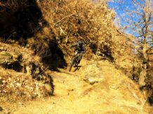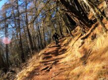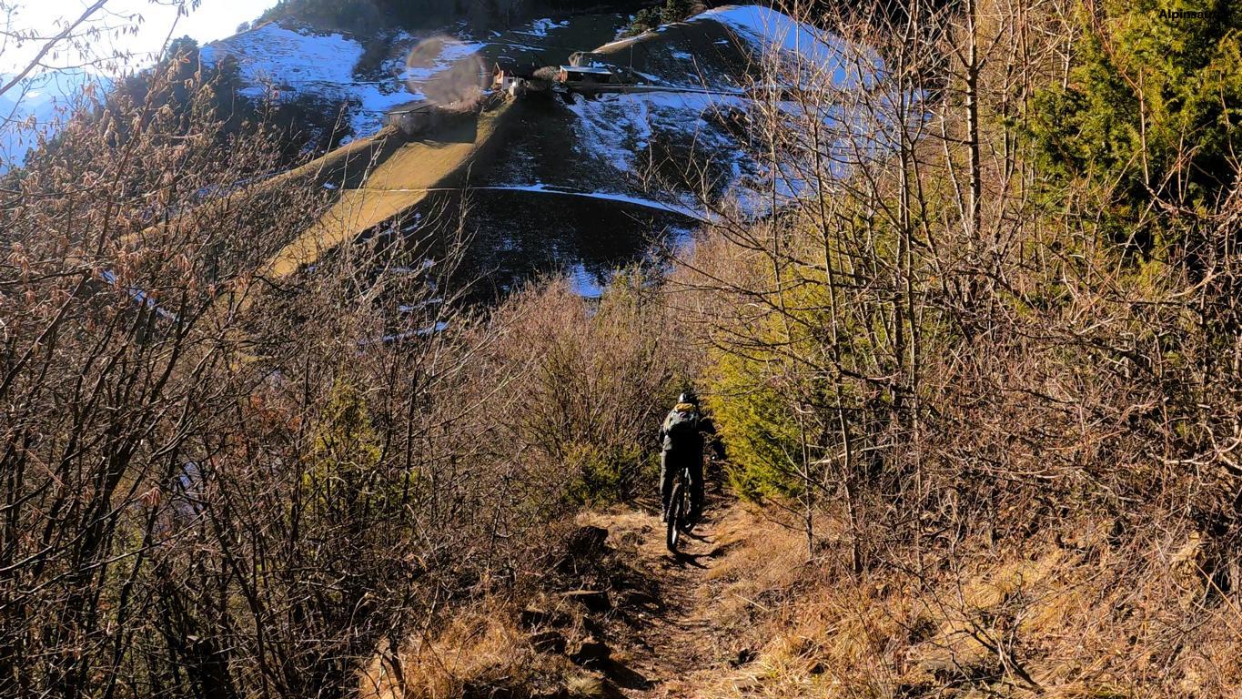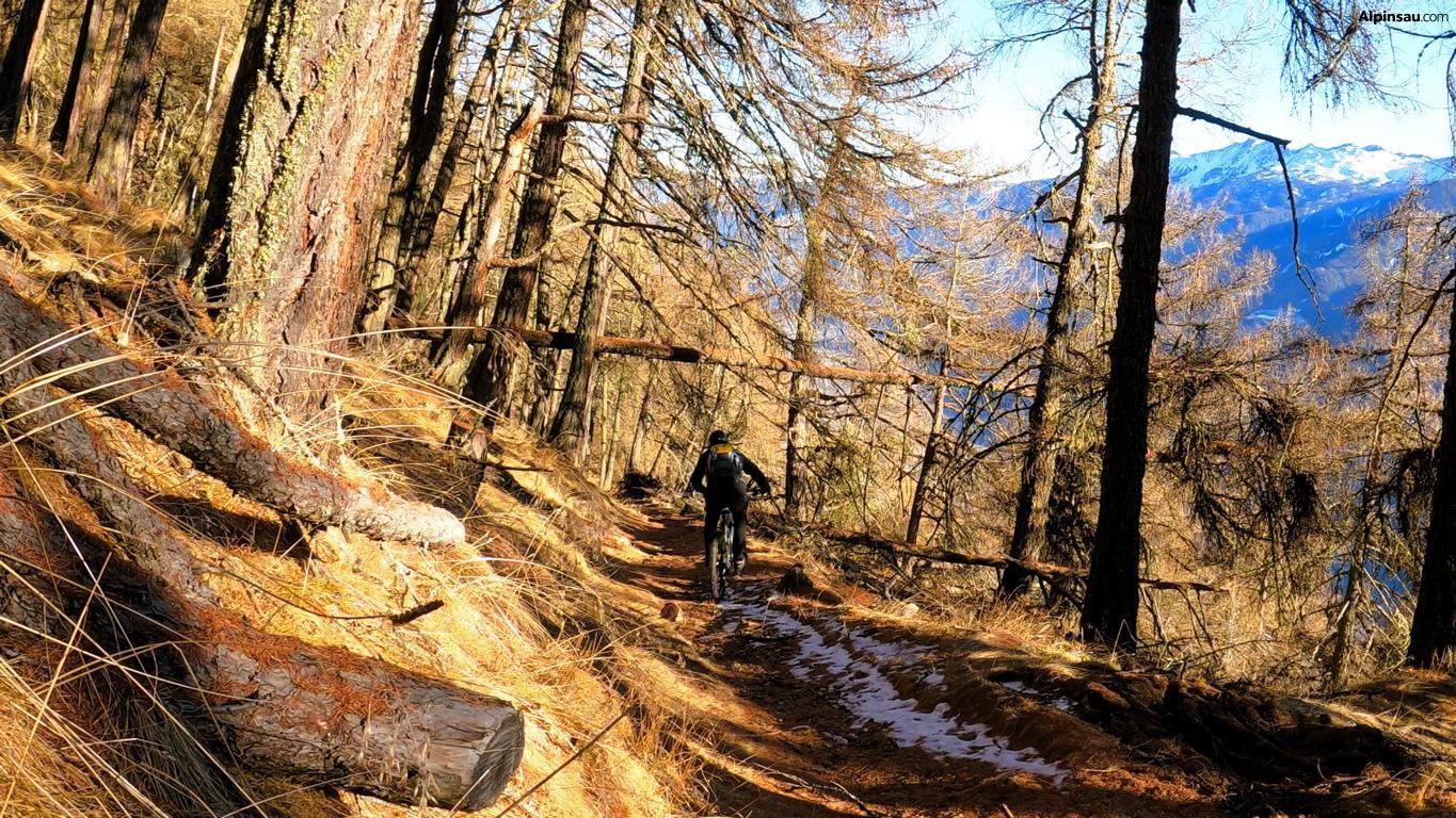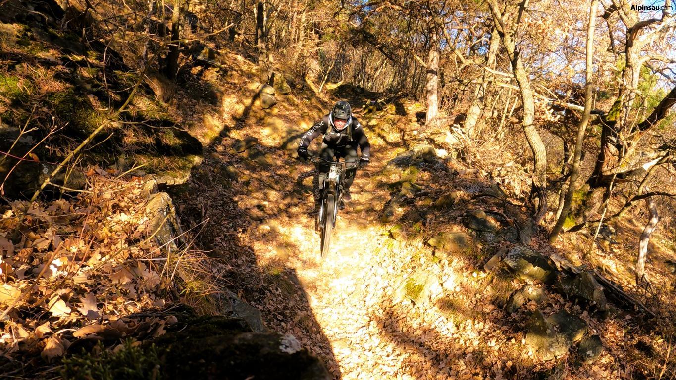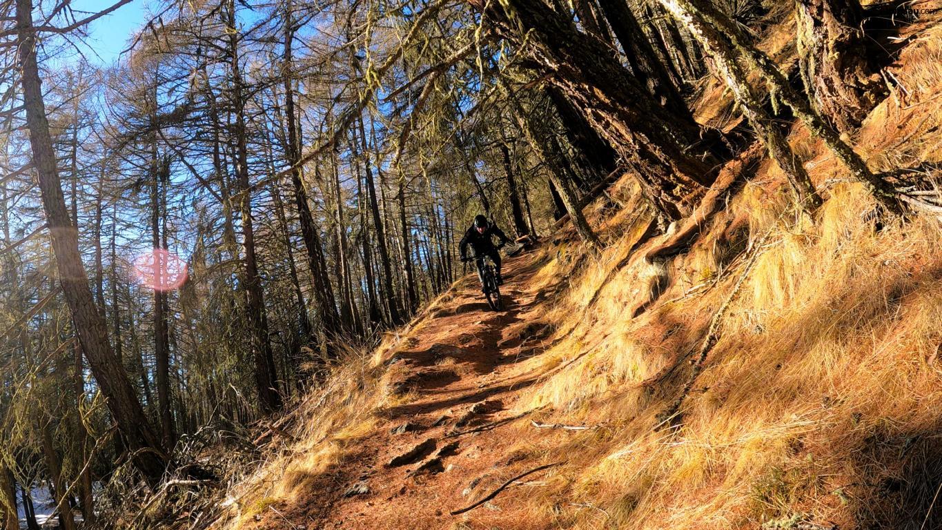 Die Abfahrt beginnt mit dem 1A-Trail im Schwierigkeitsgrad S2. Vor der Greitalm führt der Weg einige Meter auf einem Sträßchen bis der 2er-Trail beginnt. Diesem folgt man im Schwierigkeitsgrad S3 mit ein paar S4 Stellen in Richtung Trumsberg, zweigt dann aber auf den 8er-Trail ab. Über diesen Trail führt die restliche Abfahrt zurück nach Kastelbell. Vor allem nach der Häusergruppe Platz ist der Trail schwierig zu fahren und erfordert eine gute Fahrtechnik. Felsige Passagen und enge Serpentinen machen die Abfahrt anspruchsvoll. Der Trail ist mit den Schwierigkeitsgrad S4 zu bewerten.